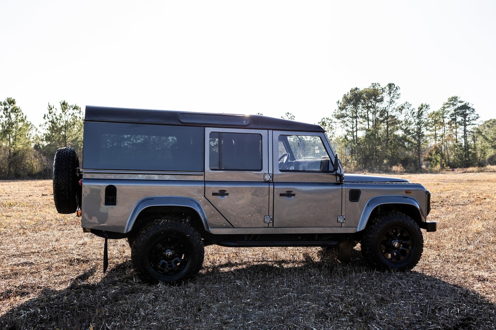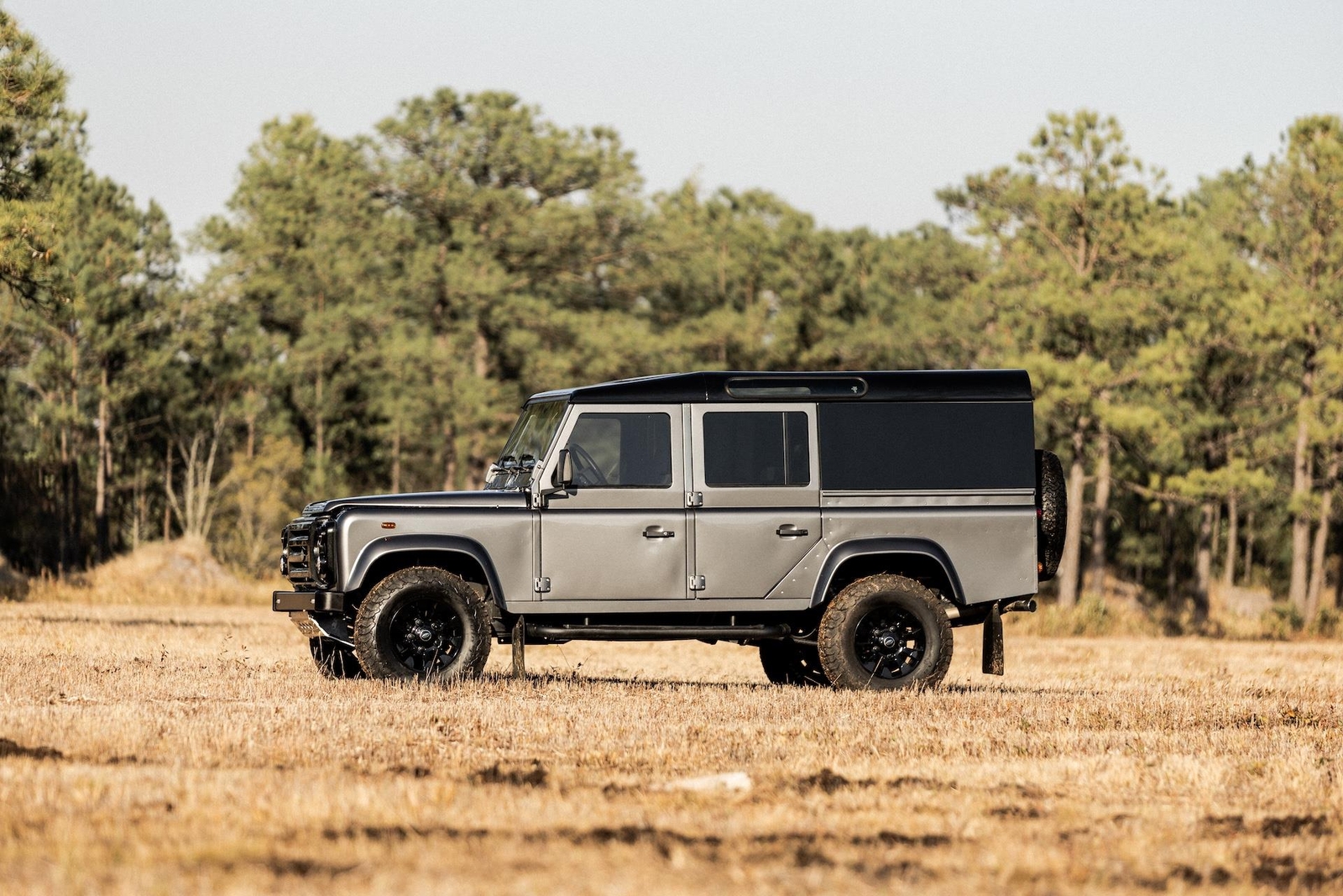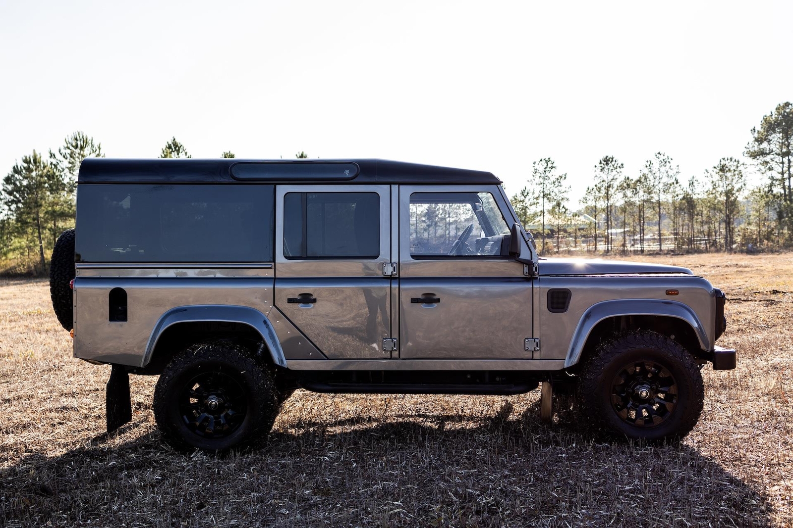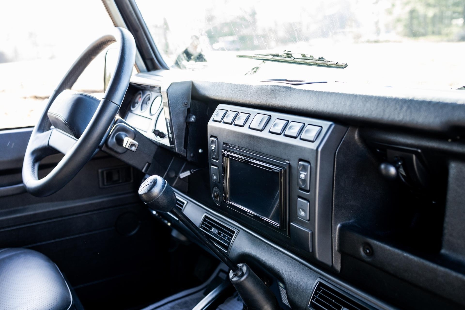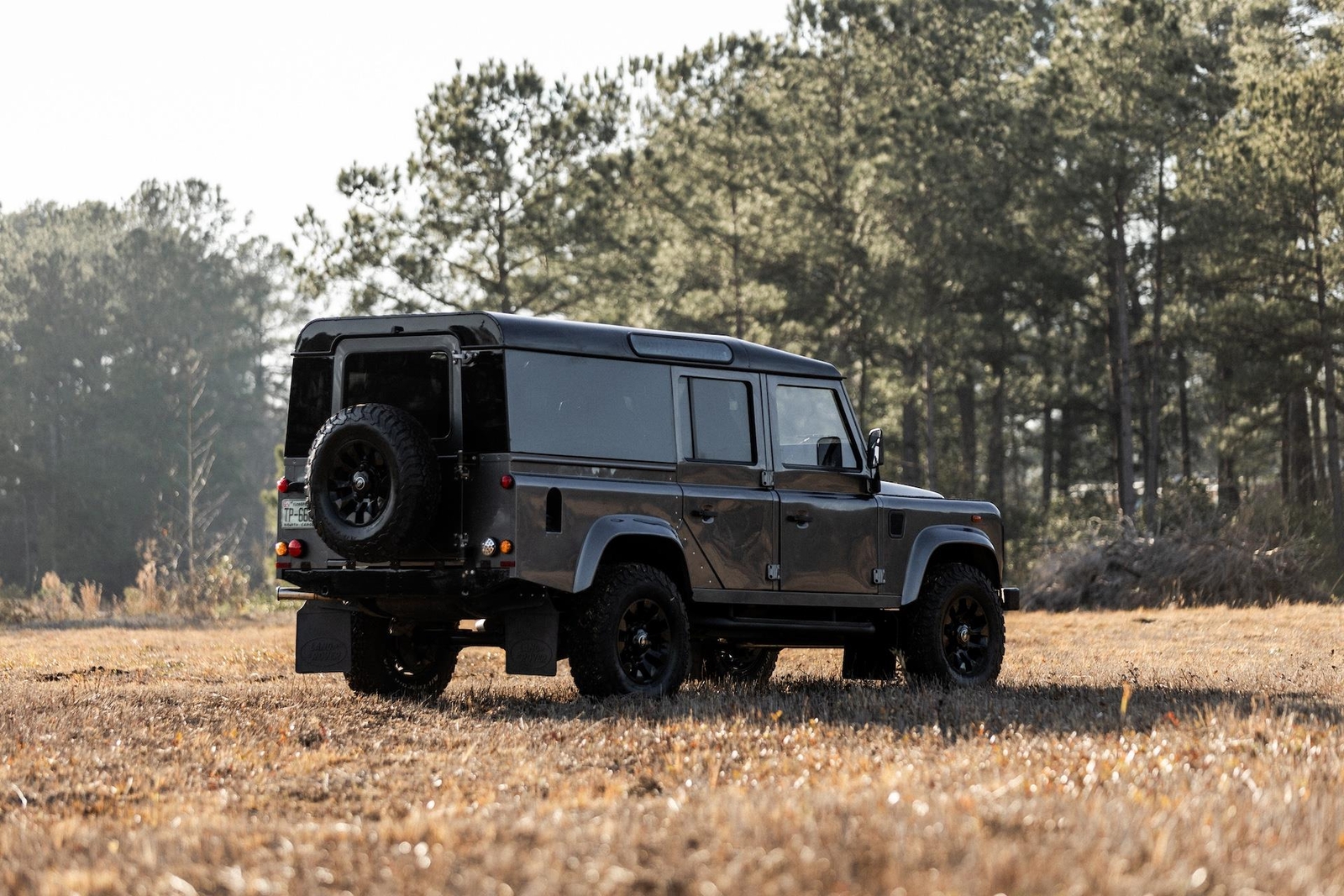 At the front end, this Defender 110 showcases a gloss black KBX®-style grille with wire mesh insert, matching light surrounds, satin black side intake and wing top vents. For modern and precise illumination, LED headlamps and colored LED marker, signal, reverse, and tail lamps have been fitted. The color-coded slimline front bumper with rubber end caps houses two rectangular LED daytime running lights. At the rear, the heavy-duty swing-away rear tire carrier provides a neat and functional solution for storing the full-size spare tire with matching wheel.