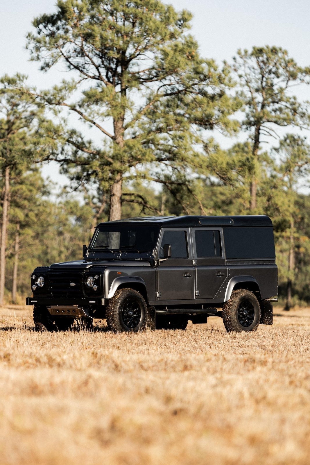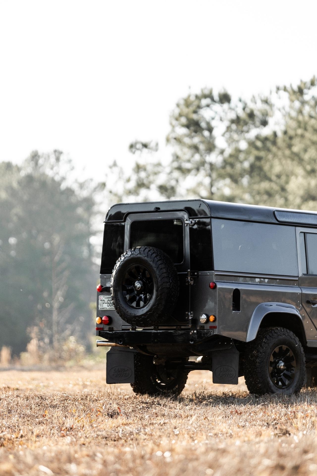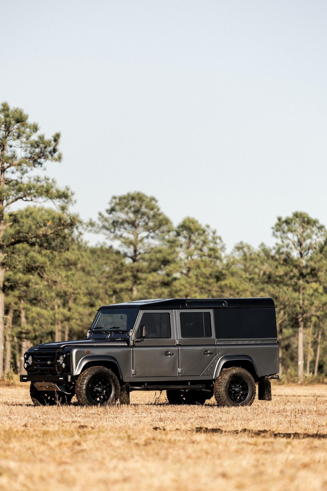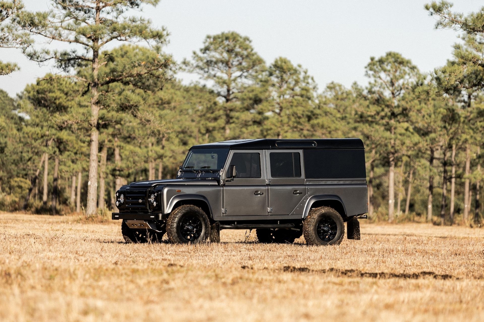 At the front end, this Defender 110 showcases a gloss black KBX®-style grille with wire mesh insert, matching light surrounds, satin black side intake and wing top vents. For modern and precise illumination, LED headlamps and colored LED marker, signal, reverse, and tail lamps have been fitted. The color-coded slimline front bumper with rubber end caps houses two rectangular LED daytime running lights. At the rear, the heavy-duty swing-away rear tire carrier provides a neat and functional solution for storing the full-size spare tire with matching wheel.