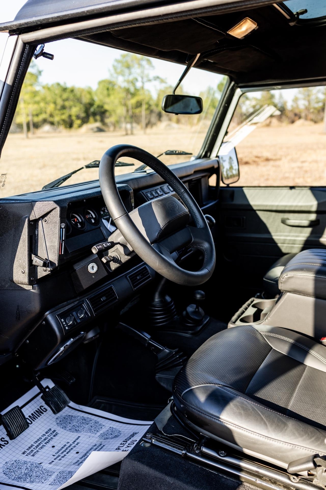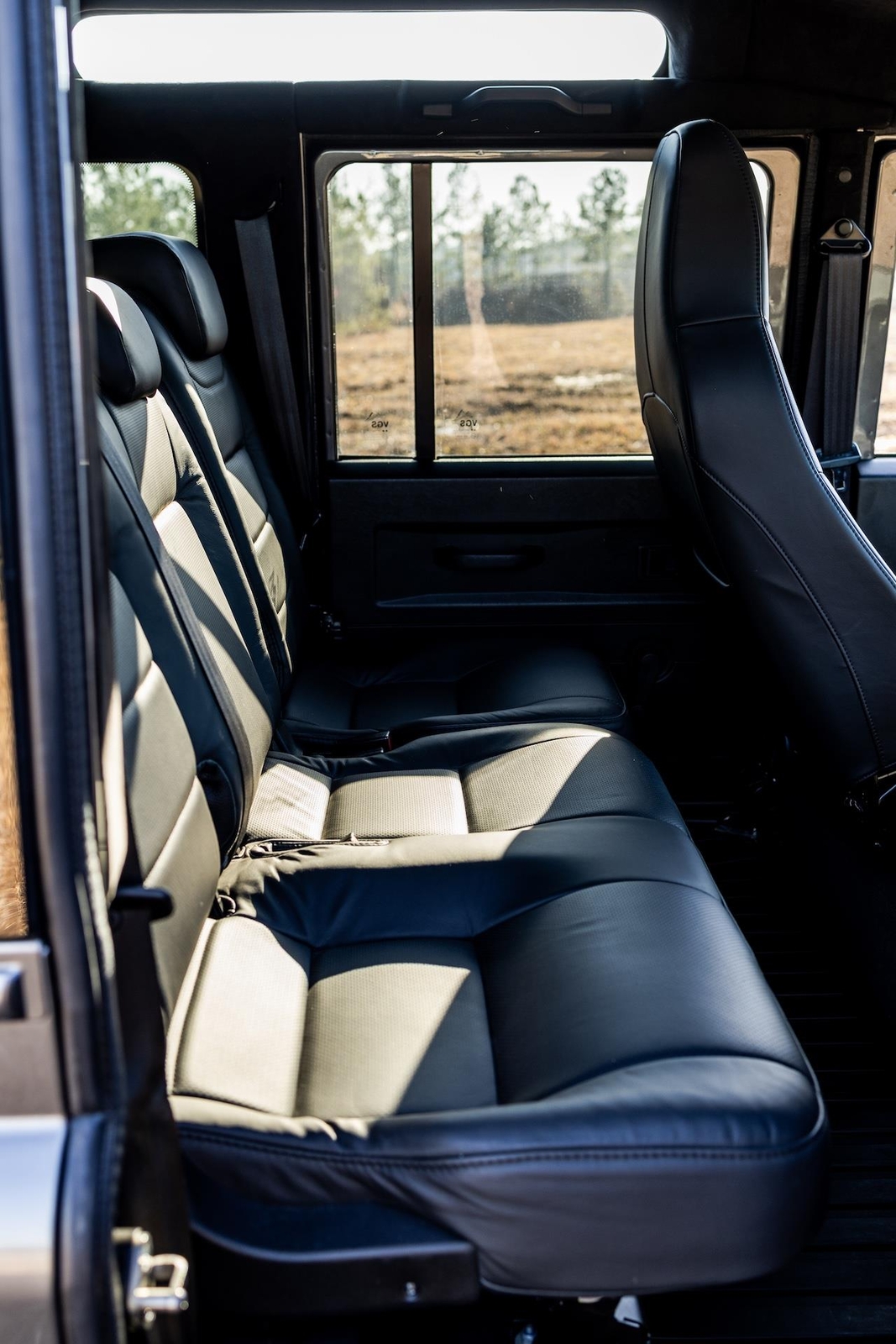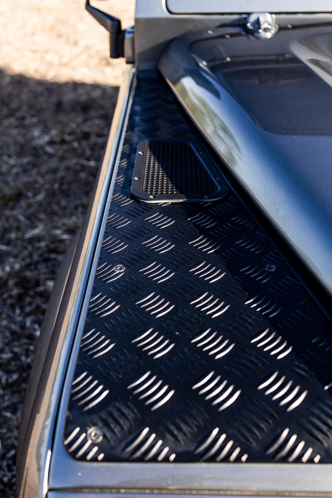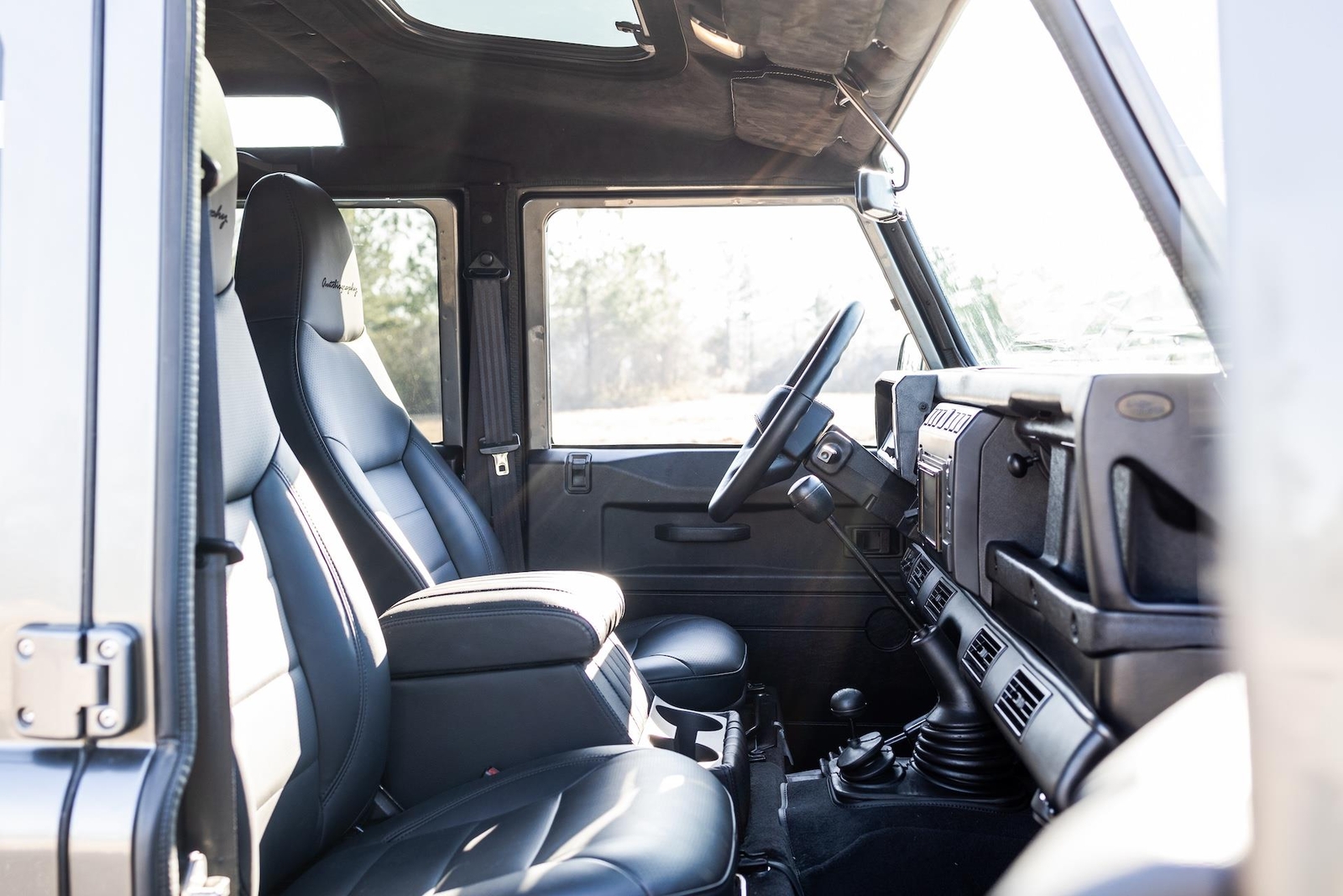 The body was skillfully finished in rich Corris Gray with a Santorini Black roof, complemented by color-matched wheel arches and trim. The flush-fitting, deep-tinted Masai® side and rear quarter glass adds to the sophisticated curbside appeal of this breathtaking sport utility, while the satin black chequer plate wing top protection and heavy-duty Land Rover mud flaps ensure the rugged off road appeal remains intact.