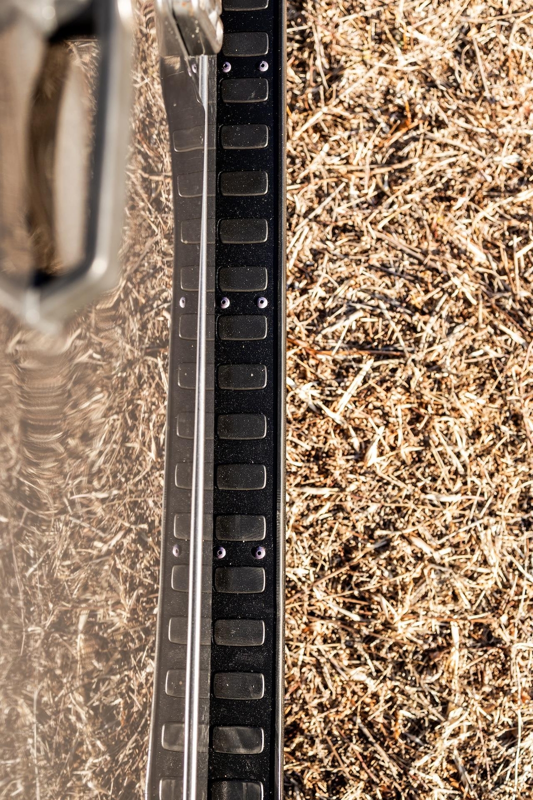 Tubular “Fire & Ice”-style side steps with black rubber tread plates make for easy ingress and egress to the leather-laden passenger cabin featuring air conditioning and heat. The quintessential Alpine windows and flip-up sunroof shed plenty of natural light on the heated, high-back Autobiography® front sport seats upholstered in luxurious black perforated Italian leather, matching the second-row 60/40 split-bench seat. Topping it all off is a luxurious charcoal Alcantara headlining.