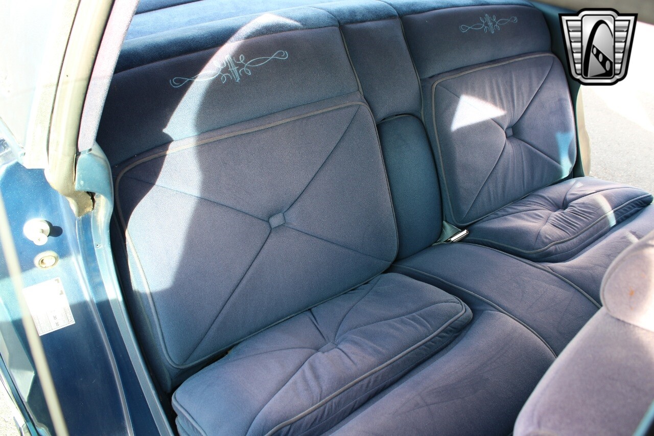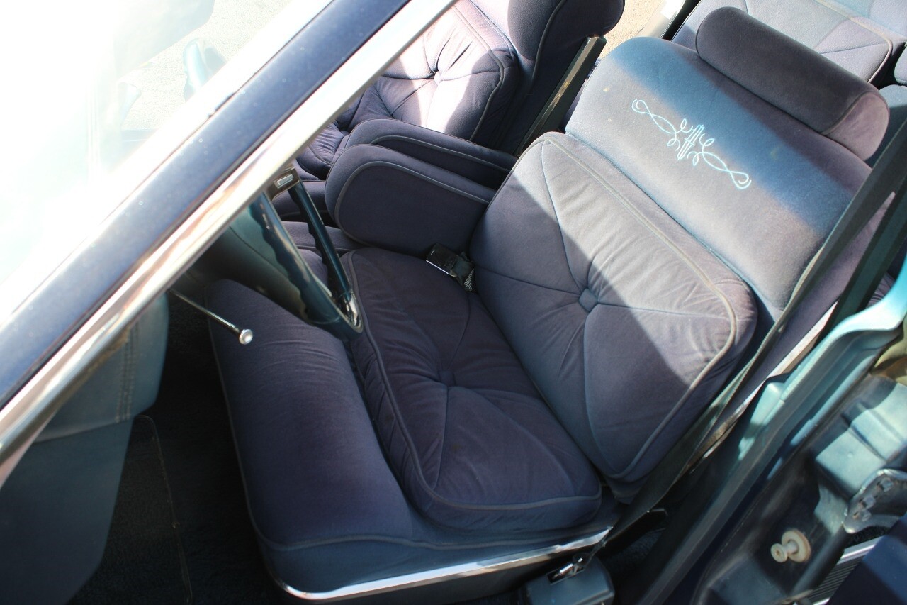 The interior of the car is adorned with a blue cloth finish, providing a comfortable and cozy environment. This classic vehicle combines luxury, power, and safety, making it a great choice for anyone who appreciates the charm of classic American cars.