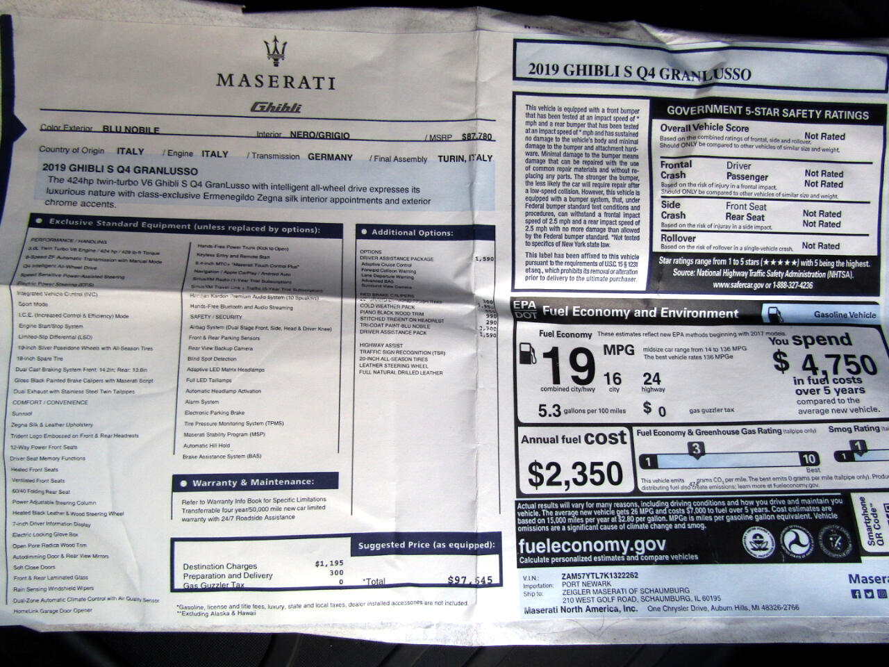 Blue Nobile 2019 Maserati Ghibli S Q4 Granlusso Only 12,200 Miles Excellent Condition