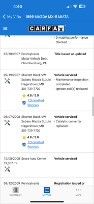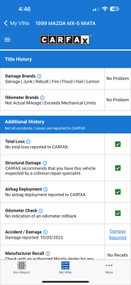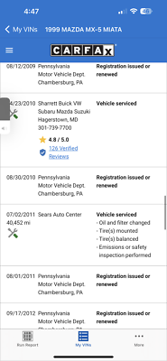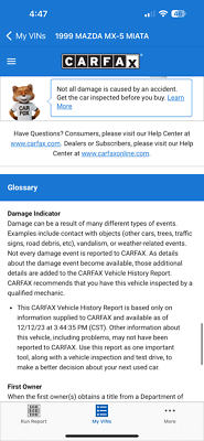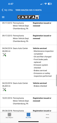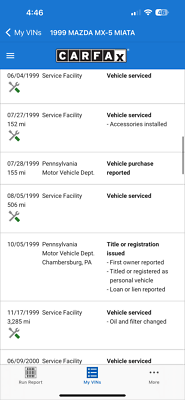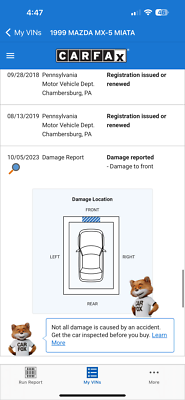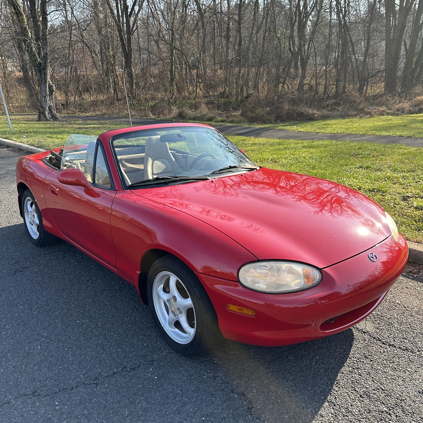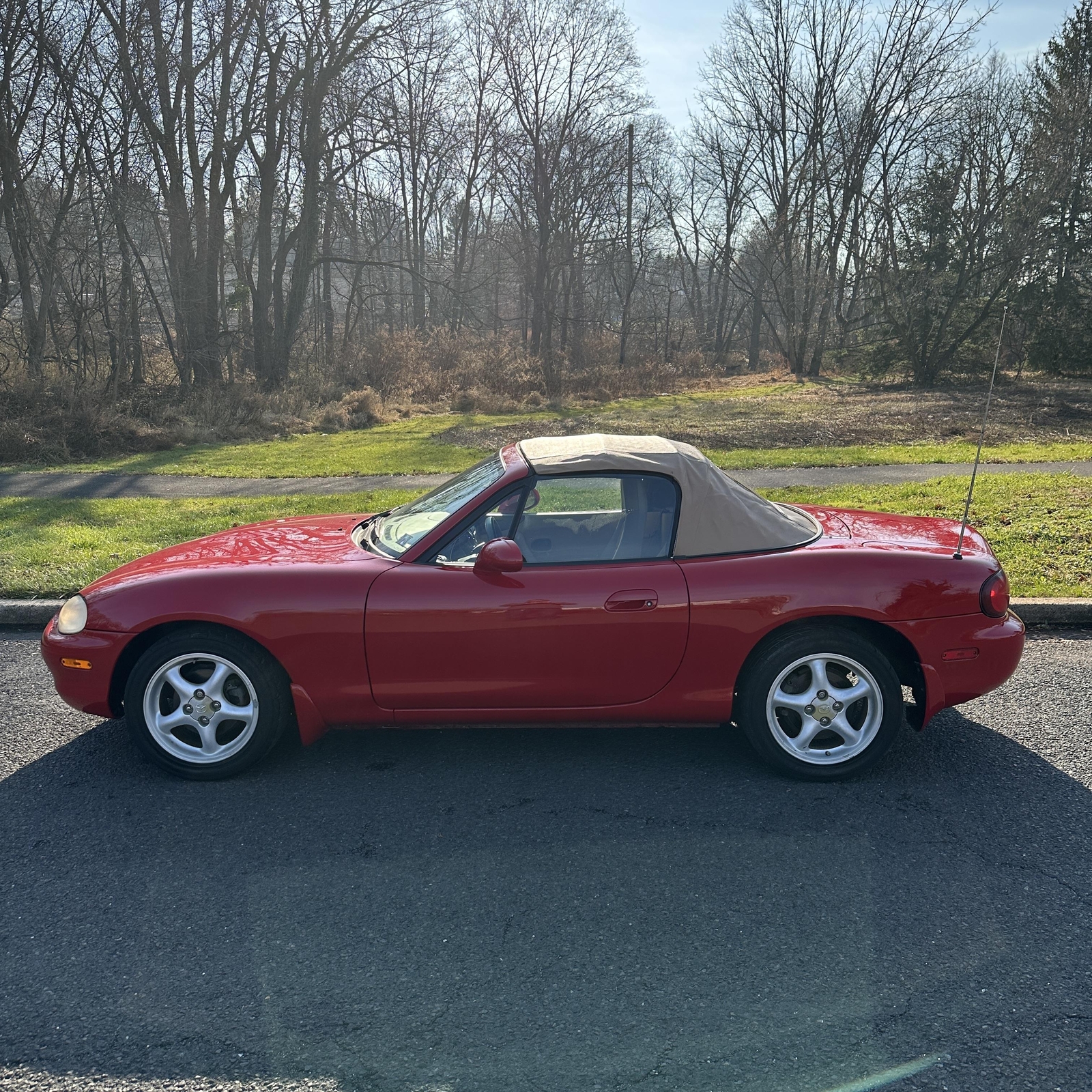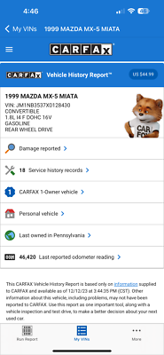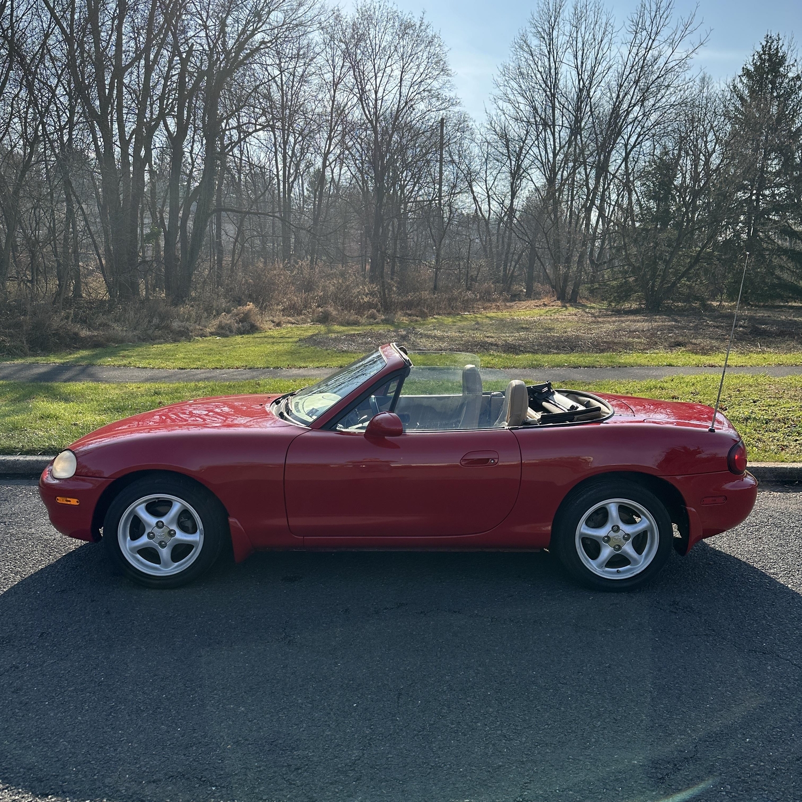 "PLEASE SCROLL TO BOTTOM OF LISTING AND CLICK "SEE FULL ITEM DESCRIPTION" TO VIEW ALL 50+ PHOTOS!!!" "I WILL HELP YOU ARRANGE SHIPPING AND WILL MATCH OR BEAT YOUR QUOTE" UP FOR SALE IS THIS VERY NICE 1999 MAZDA MX-5 MIATA CONVERTIBLE WITH VERY LOW 50K MILES, ONE OWNER, ACCIDENT FREE, CLEAN CARFAX, EXTRA CLEAN NON SMOKER AND PRICED TO SELL!!! THIS CAR IS OVERALL IN GOOD CONDITION INSIDE AND OUT. THE EXTERIOR SHOWS NO MAJOR DENTS, DINGS OR SCRATCHES. THE INTERIOR ALSO SHOWS NO SIGNS OF ABUSE, (SEE ALL PICTURES FOR MORE DETAILS.) THE ENGINE RUNS STRONG AND THE TRANSMISSION IS SMOOTH. THE CAR WILL BE A GREAT ADDITION IN YOUR GARAGE. FEEL FREE TO GIVE ME A CALL ANY TIME 267-828-0272 THANKS SERGE Please keep in mind you are bidding on a pre-owned vehicle. Everyday driving can cause minor chips, dings or scratches on a vehicle. Unless otherwise noted in our photos or description these items are minimal, but may exist in some cases. Our photos are designed to be a visual description of this vehicle, please look at them carefully and use them to make a confident decision to bid on our vehicle. Get a great vehicle at a great price!!! Bid Now! If you have any questions about this or any of my other auctions please feel free to contact me via e-mail at or you can call me at 267-828-0272 ask for Serge. Thank you for your interests and we look forward to hearing from you..