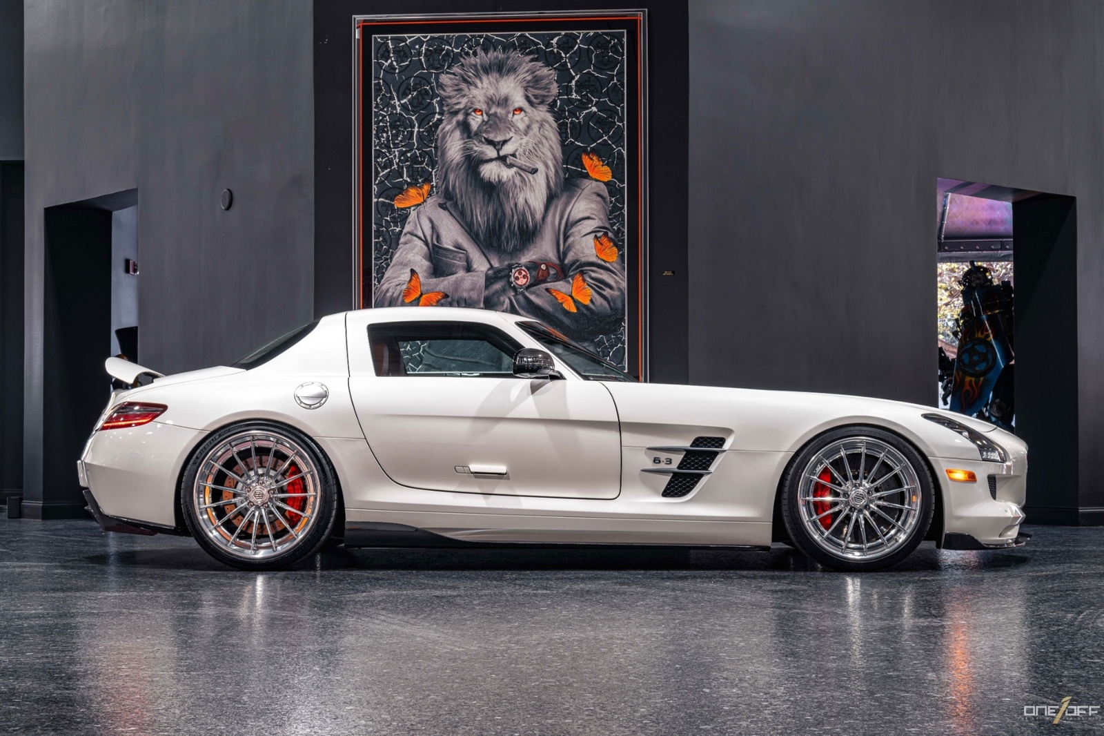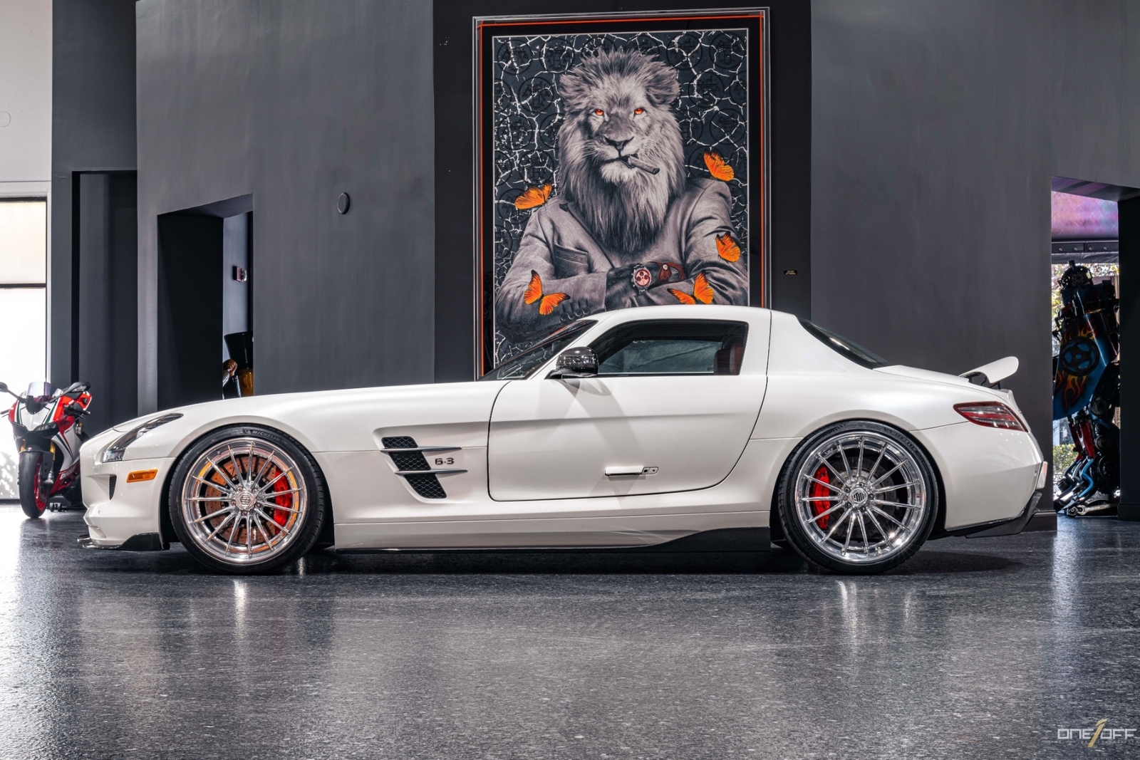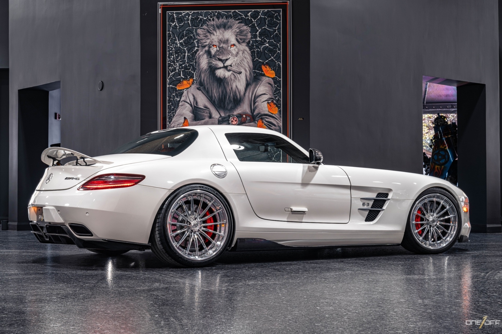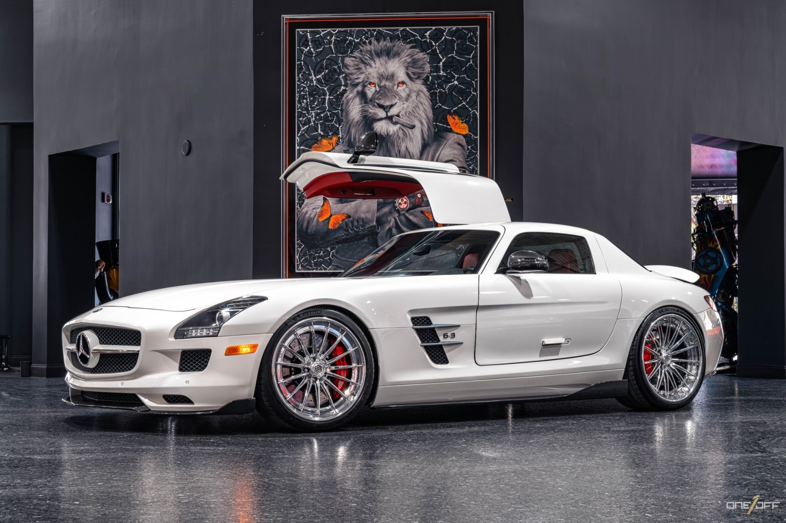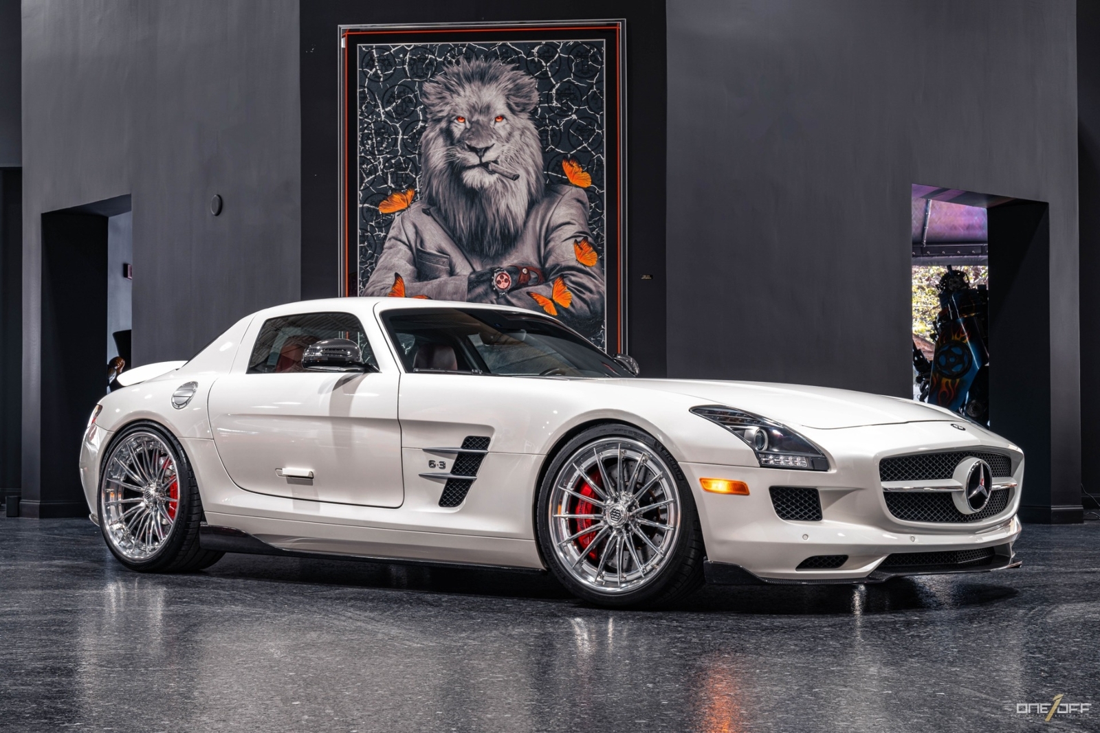 The One-Off Collection is thrilled to present this perfectly modified 2012 SLS AMG, the timeless gullwing masterpiece. The Designo White/Classic Red color combination solidifies this specs placement in the market for years to come, greatly enhancing resale value. In addition to the color spec, it features every must-have option including carbon fiber trim. Lowered on 20"/21" multi-spoke 1886 forged wheels, this may be the hottest white/red SLS on the planet. Don't let the opportunity to own this automotive icon pass you by, make it yours while you still can!