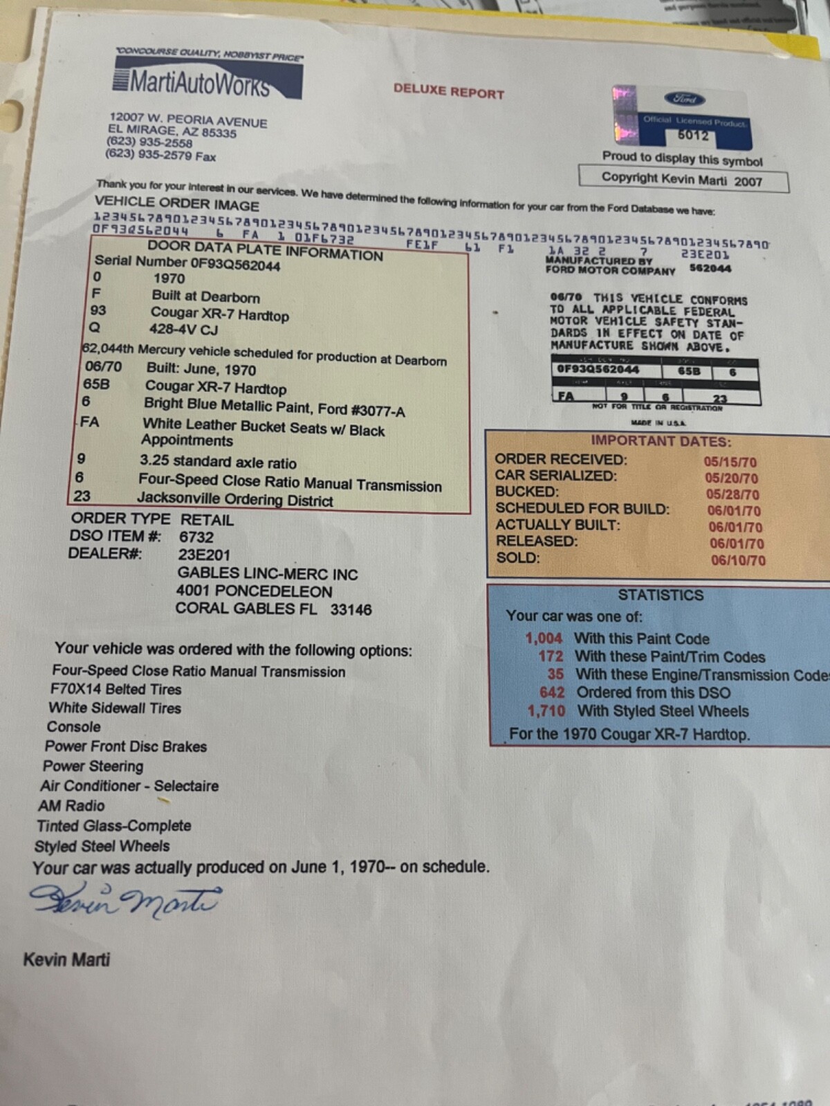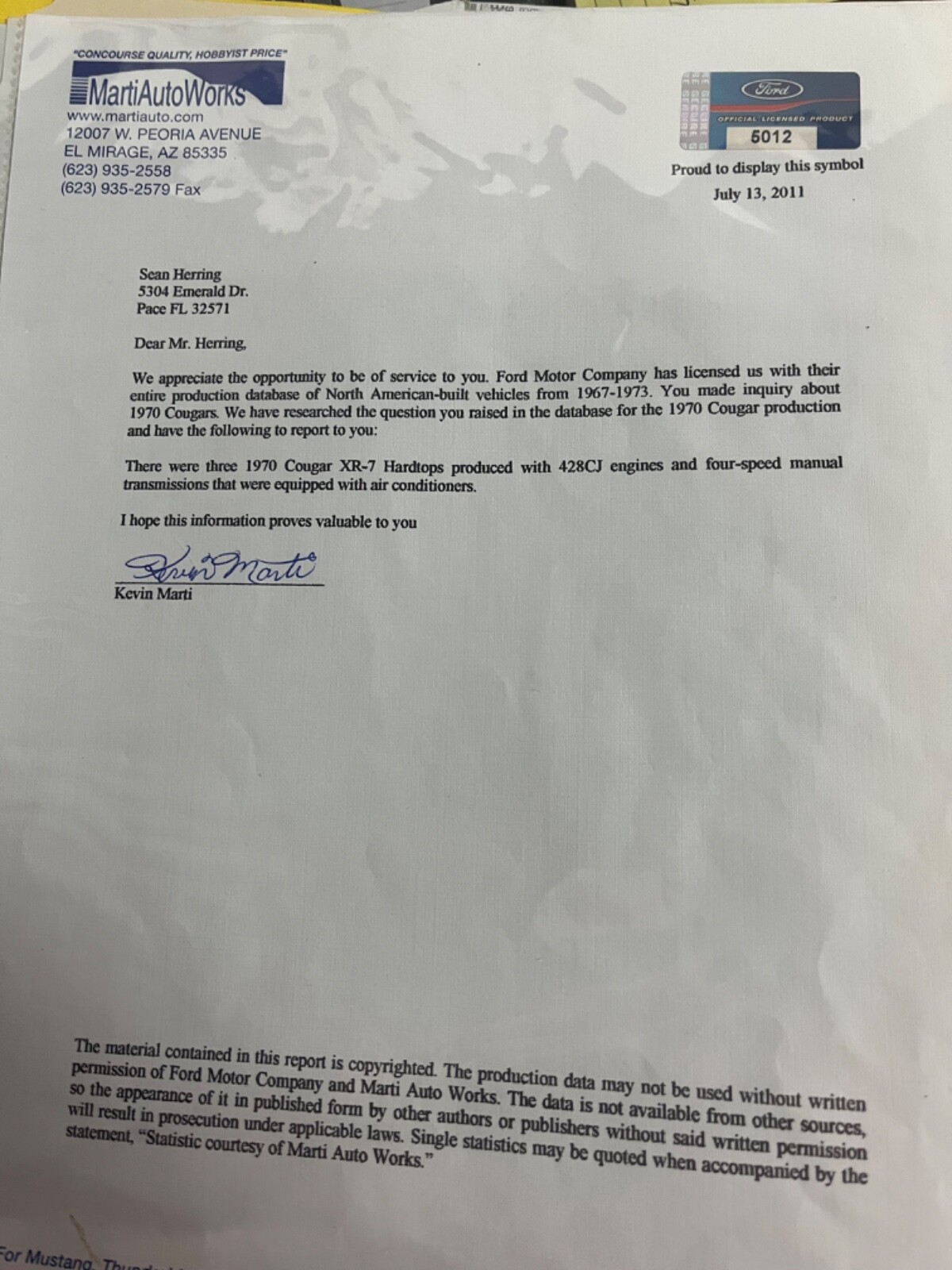 1970 cougar XR7 special ordered with the Q code 428 Cobra jet with the close ratio 4 speed, engine is correct 428 cj that has been rebuilt but not started, the transmission is original to the car and the vin number is still present, marti report in Han that states its 1 of 3 made with 428 cj and a 4 speed equipped with air conditioning also the car was factory #3077-A bright blue metallic with white leather interior, has original 3:25 gear the car was ordered out of the Jacksonville fl district for gables linc-merc Inc coral gables fl, as you can see in the pictures the car is in remarkable condition and just needs someone to finish. Please feel free to give me a call 251 seven five one 75 three zero thanks and god bless. Also the car is for sale locally and subject to be removed if sold