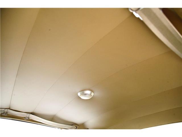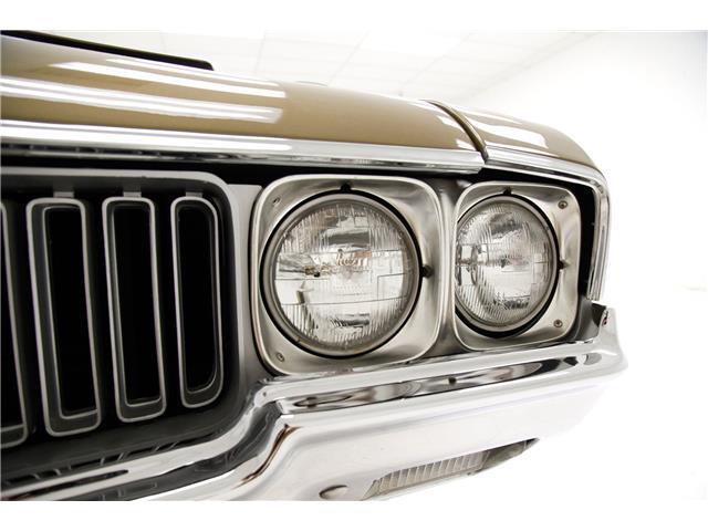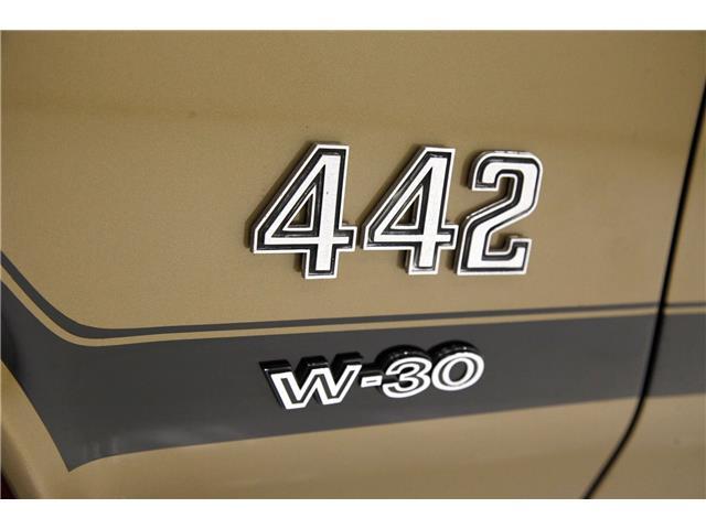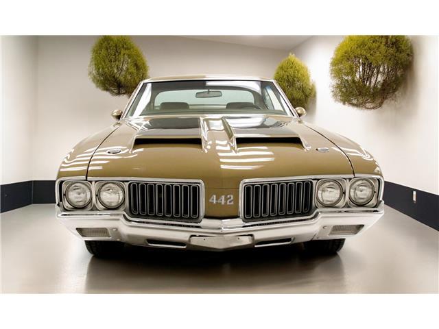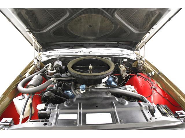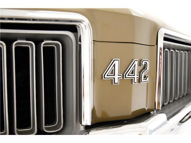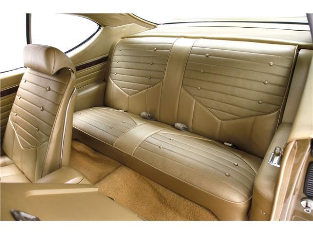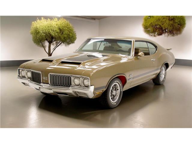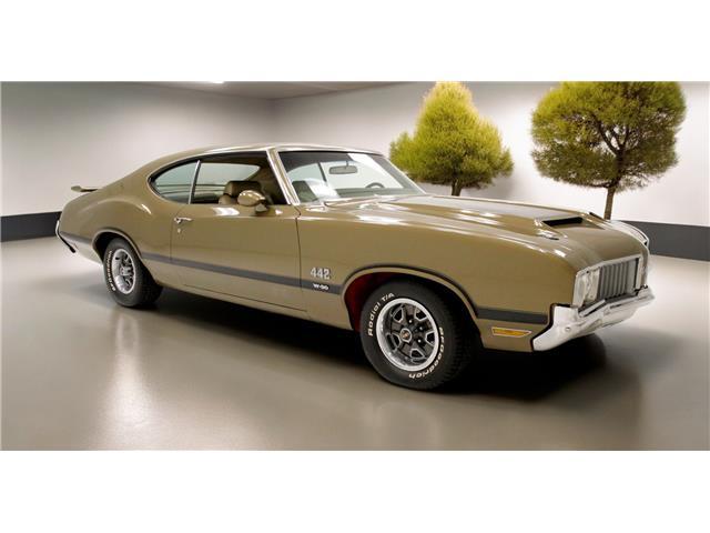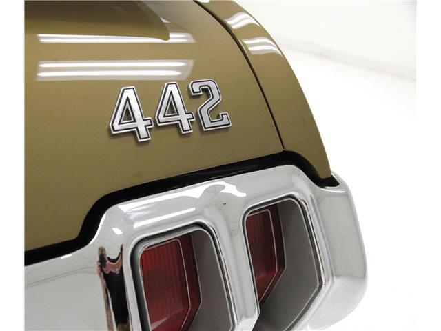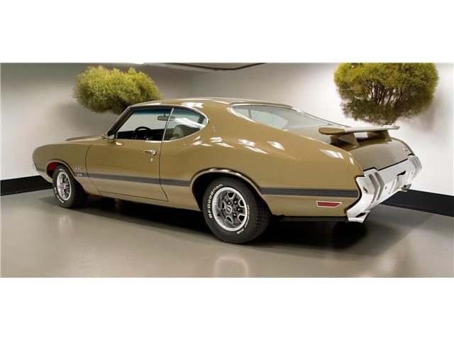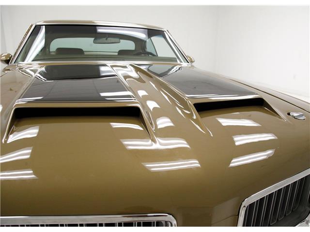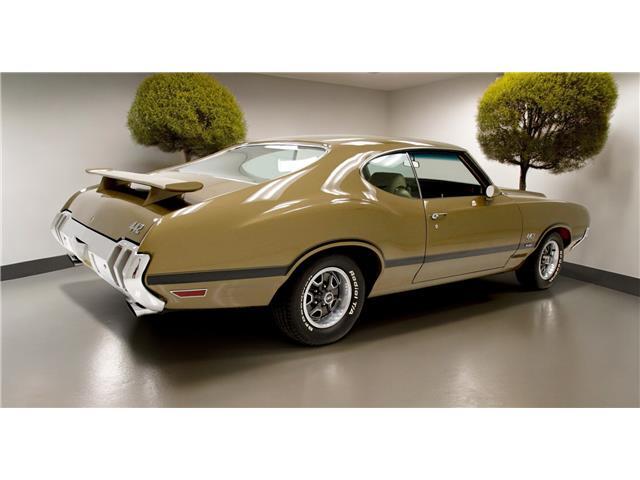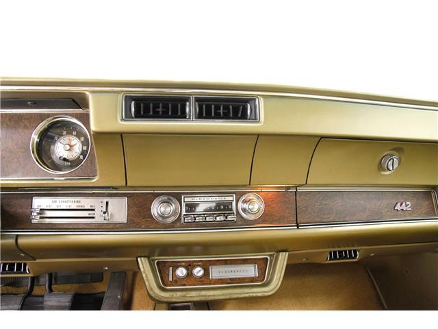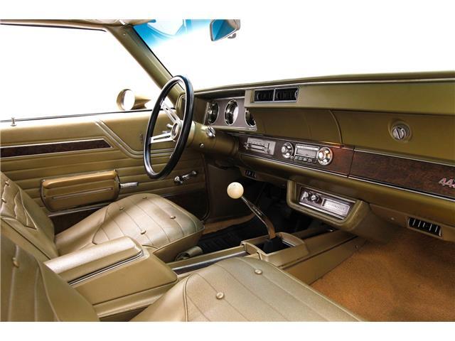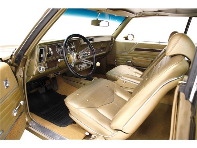 Upon opening one of the doors, we are met with impeccably crafted textured gold vinyl that is horizontally stitched and adorned with elegant chrome accents, window cranks, and vinyl wood grain panels, all resting atop a lavish gold carpeting. The front bucket seats boast a high back design with buttoned and stitched front and back bolsters, featuring curved smooth inserts in a matching gold hue. The rear bench mirrors the style of the front seats, exuding a cohesive and luxurious aesthetic. Turning our attention towards the dashboard, we observe a pristine display composed of gold-colored padded vinyl and curved metal accents, complemented by ornate wood burl applique detailing. The dashboard includes a round gauge cluster background and a lower strip housing temperature sliders as well as an Olds AM radio, with an added dealer-installed Oldsmobile 8-track player situated just below. Additional features include a tic top tachometer on the driver's side and factory-installed air conditioning. A rally steering wheel commands attention at the forefront of the dashboard, while the console showcases a sleek design and houses a Hurst shifter. The impeccable condition of the gold carpeting that floods the floors further enhances the luxurious ambiance of the interior. The headliner appears taut and well-maintained, featuring original lighting fixtures that add a touch of sophistication. Lastly, the trunk interior deserves recognition for its meticulous preservation, as it is coated in a refined charcoal gray speckled trunk paint that exudes timeless elegance.