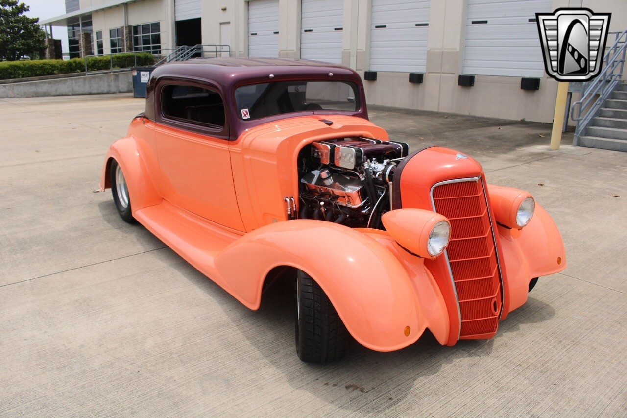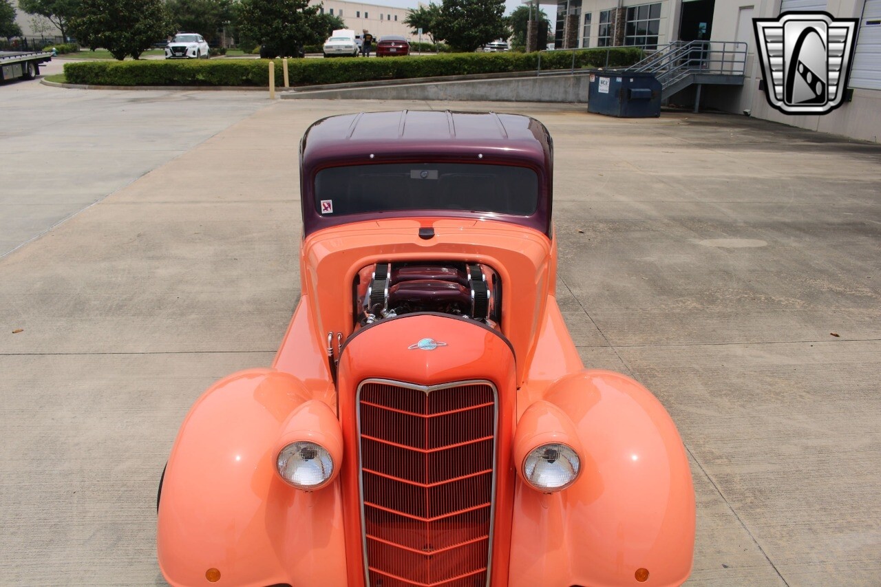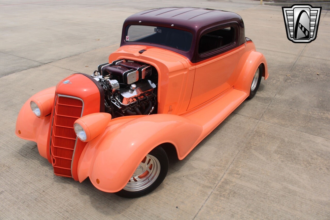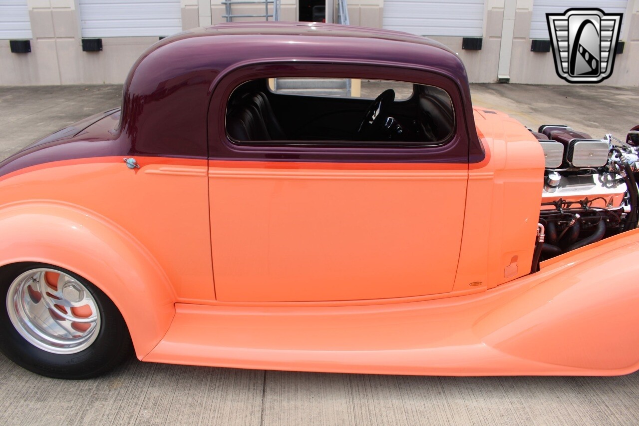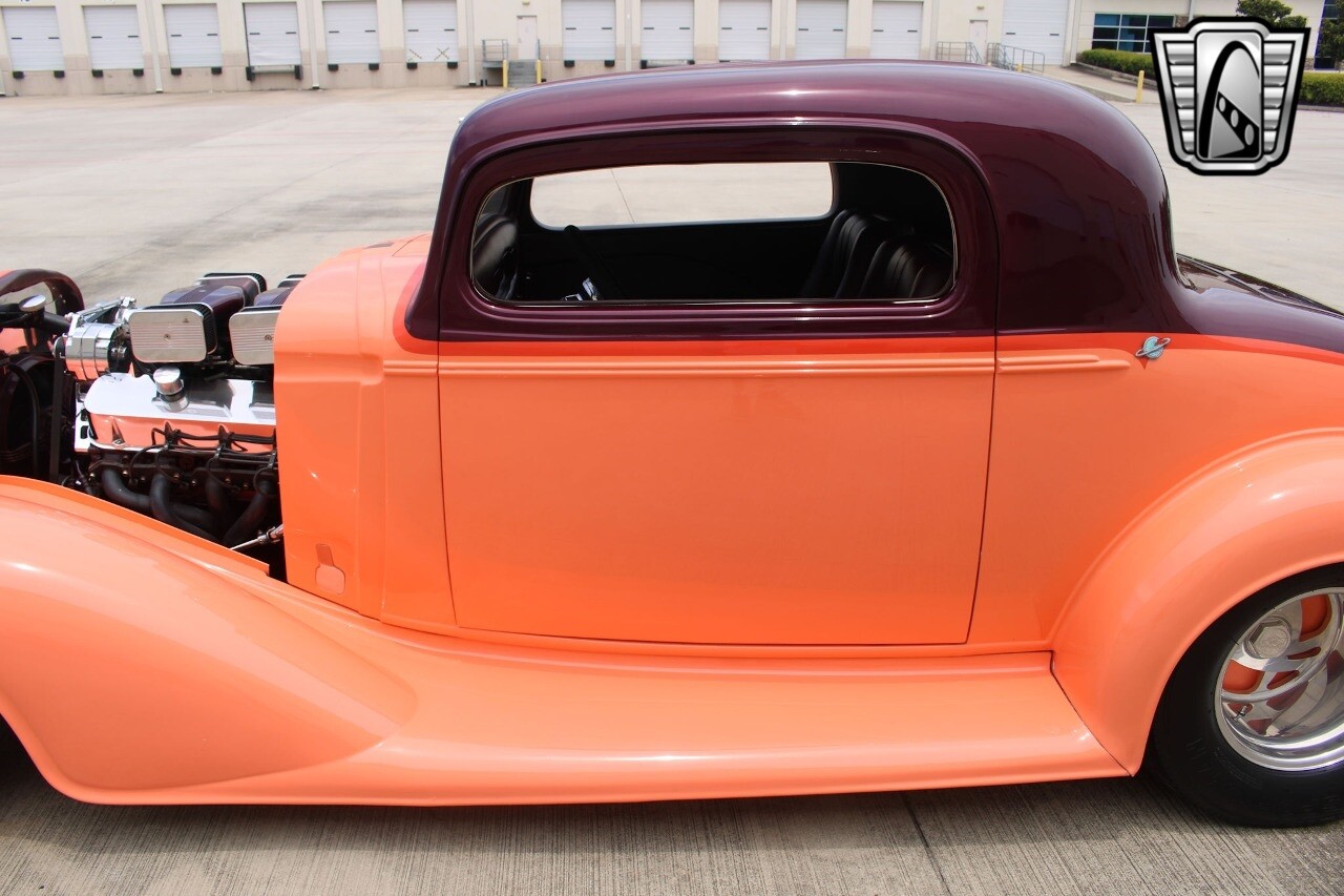 Gateway Classic Cars Houston Showroom is excited to offer this amazing 1934 Oldsmobile Country Club Coupe for sale. According to its owner, there were only 400 of these cars ever produced, and of those, this is the last one known to exist. Not only is that a unique aspect of this car, but according to him, his great grandfather purchased it new, and he is the second owner. Now, we have no way of verifying that, but we'll take his word for it. The car comes with a binder of restoration photos, and suffice it to say that it went from an original steel roller to what you now see, which is pretty wild. It now sports a new custom-fabbed 1/4 x 2 x 4 rectangular tube steel frame, which has been boxed and subframed with a "Z'd, smoothed, painted and finished" configuration. It features Heidts Superide polished stainless steel front suspension, and Heidts Superide Power Rack and Pinion steering. The rear suspension is a polished stainless TCI 4-link setup with adjustable chromed Carrera 350lb spring setup. The rear is a Ford 9" with 3.51:1 gears, and was balanced by Art Morrison. It features a custom Tulsa Drive Shafts drive shaft, which has been balanced to 6500 RPM. The front brakes are discs from a 1988 Corvette, and the rears are standard Ford drums, but the power assist comes from the 1988 Corvette's booster. A monster 502 CID GM/Keikhafer Racing Marine crate motor, topped by a dual quad intake from a 427 Corvette, and dual Edelbrock 4BBL carbs, and is backed by a beefed up 700R4 4-speed automatic transmisson. Hedman headers handle getting exhaust into the dual exhaust, and the offset Turbo mufflers sound great. The body features a 2" angle chop, suicide doors, recessed parking lights, computerized rear lighting, fenders have been welded on and smoothed, along with the running boards. The PPG Pale Orange/Red Orange, and Hawaiian Amethyst base coat/clear coat finish was masterfully applied by Larry Trip of Muskogee, OK. This bad boy not only looks good, but it pulls like a 747 on steroids. If you ever get tired of listing to the monster 502, you can take advantage of the audio system, which features four 1.5" Piezo tweeters, four 6" midrange, and a 12-inch subwoofer. Sound gets to the speakers via a Sony KT7500 head unit, supported by bridged 4 channel 800W amp and 400W subwoofer amp. Vintage Air has been installed, but it's never been charged with refrigerant. The occupants will find the custom burgundy leather-covered 2002 Acura Legend seats to be very comfortable for long cruises. [ omitted ].