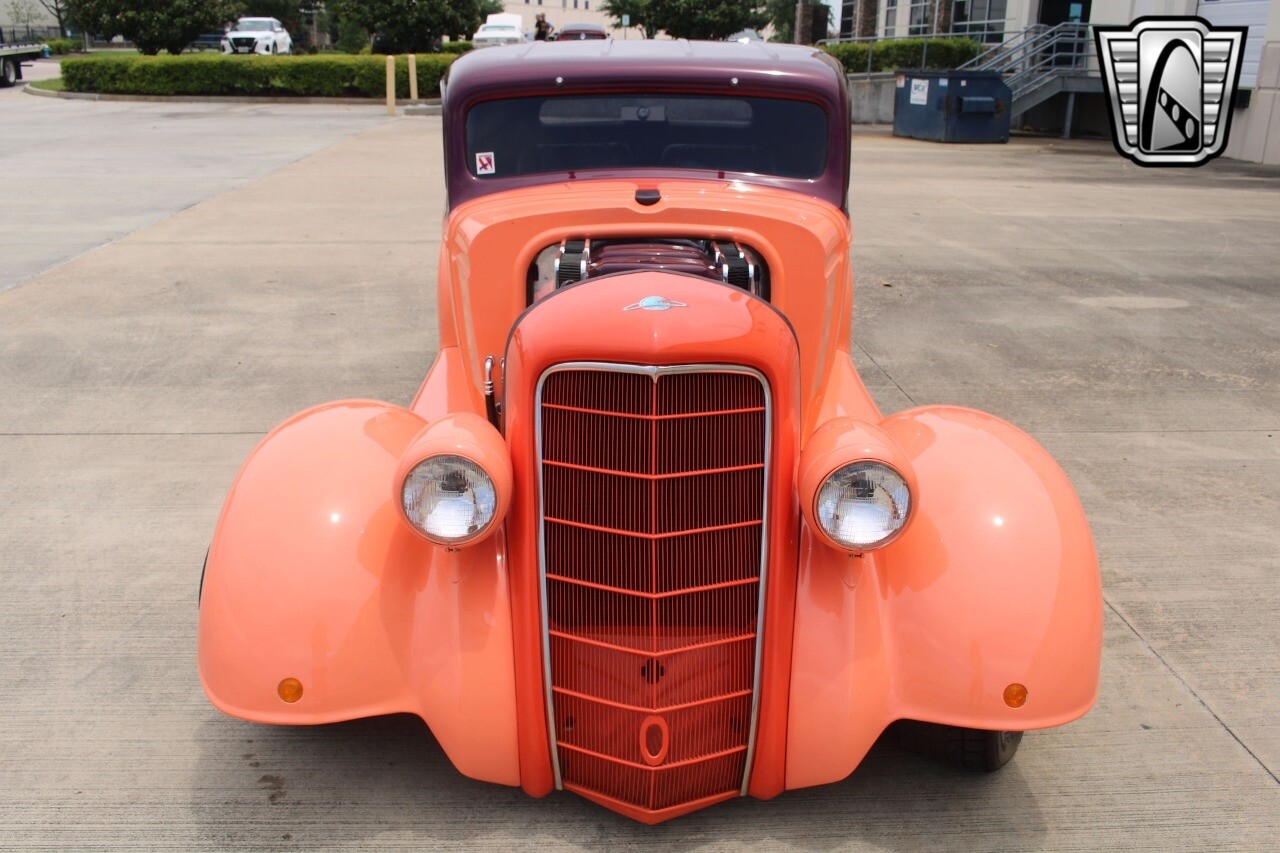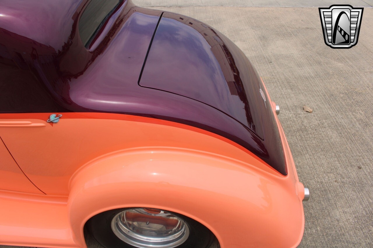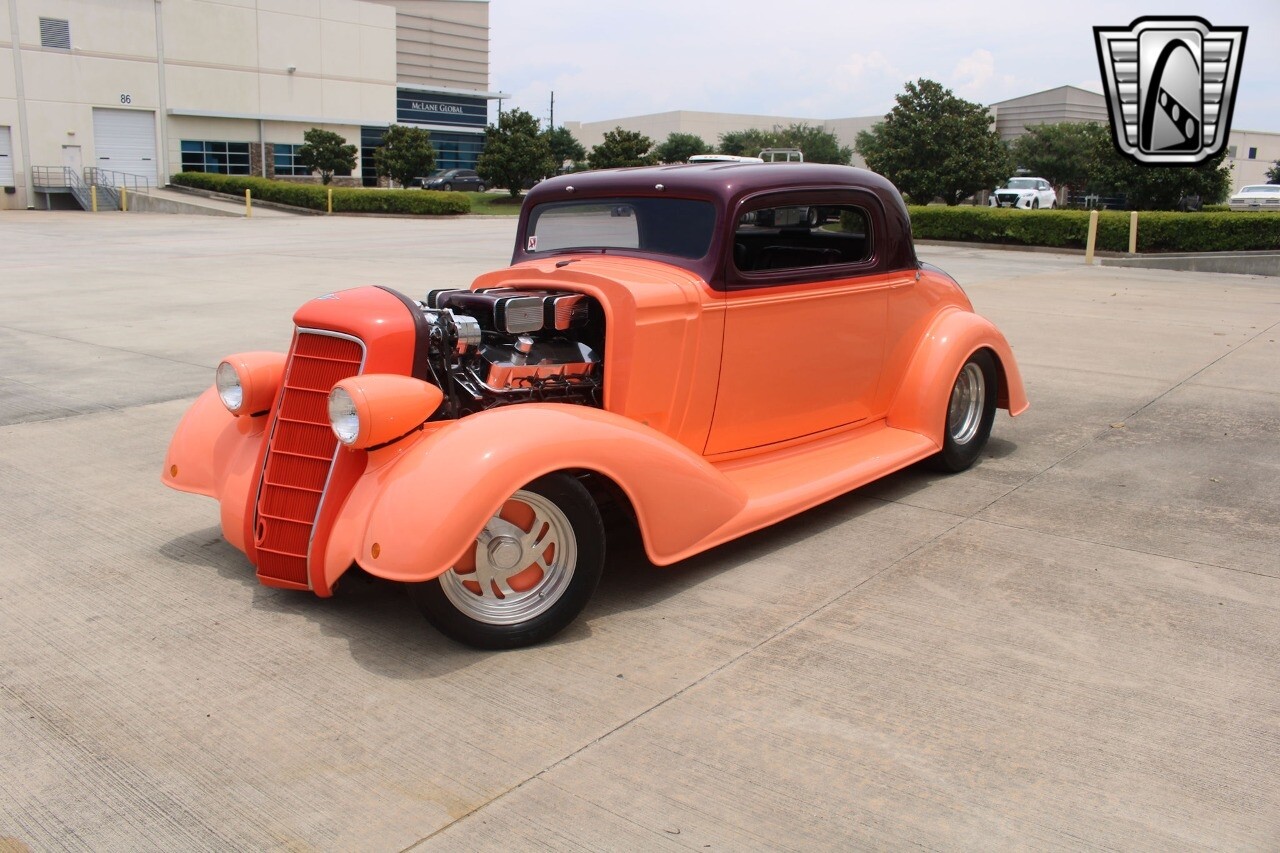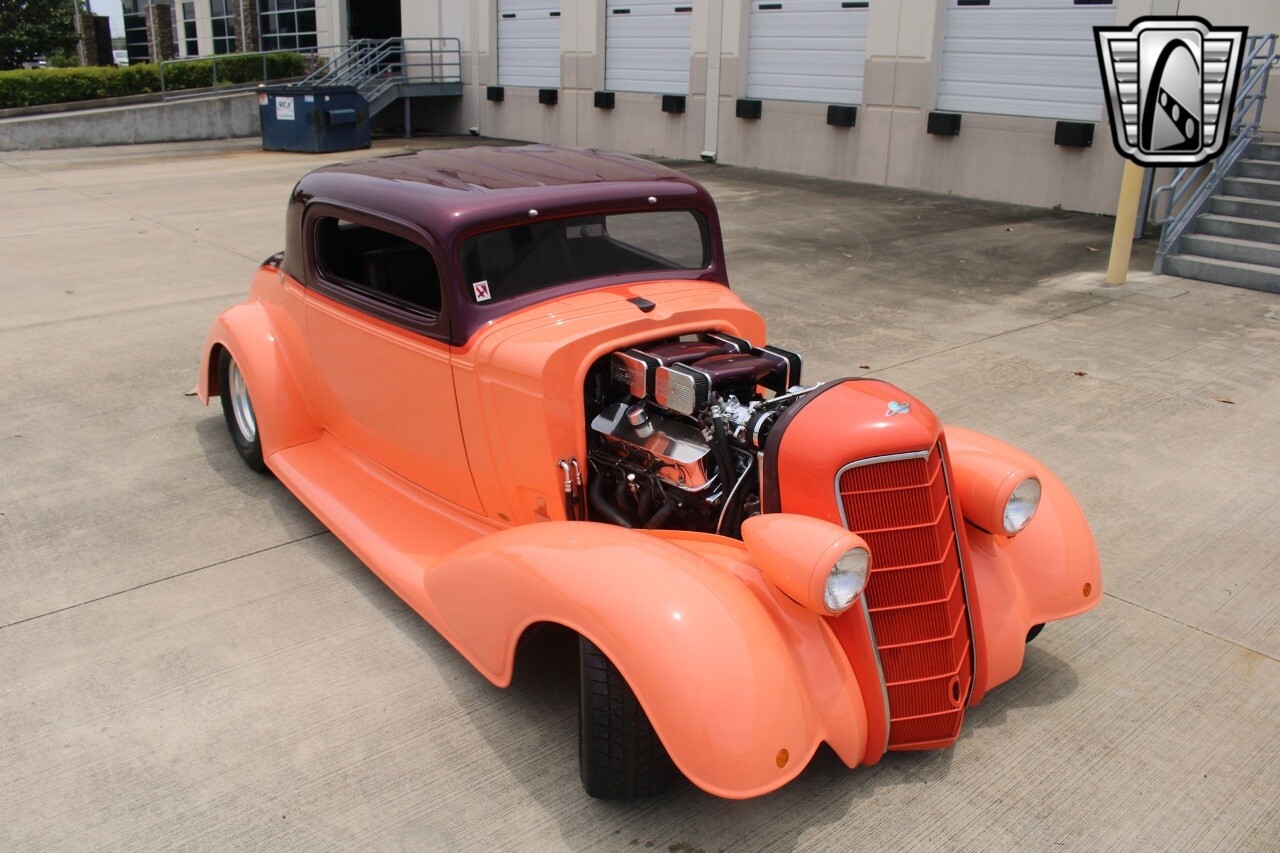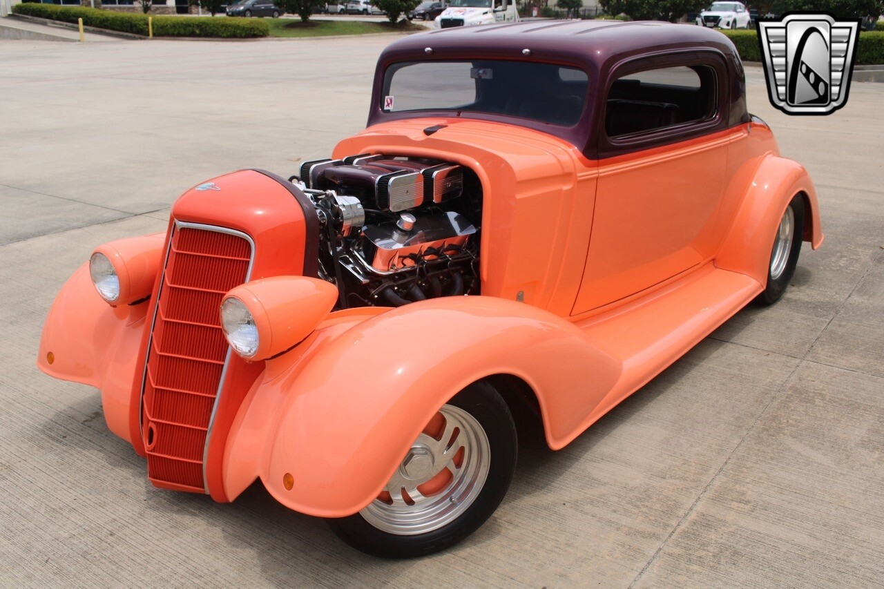 Gateway Classic Cars Houston Showroom is excited to offer this amazing 1934 Oldsmobile Country Club Coupe for sale. According to its owner, there were only 400 of these cars ever produced, and of those, this is the last one known to exist. Not only is that a unique aspect of this car, but according to him, his great grandfather purchased it new, and he is the second owner. Now, we have no way of verifying that, but we'll take his word for it. The car comes with a binder of restoration photos, and suffice it to say that it went from an original steel roller to what you now see, which is pretty wild. It now sports a new custom-fabbed 1/4 x 2 x 4 rectangular tube steel frame, which has been boxed and subframed with a "Z'd, smoothed, painted and finished" configuration. It features Heidts Superide polished stainless steel front suspension, and Heidts Superide Power Rack and Pinion steering. The rear suspension is a polished stainless TCI 4-link setup with adjustable chromed Carrera 350lb spring setup. The rear is a Ford 9" with 3.51:1 gears, and was balanced by Art Morrison. It features a custom Tulsa Drive Shafts drive shaft, which has been balanced to 6500 RPM. The front brakes are discs from a 1988 Corvette, and the rears are standard Ford drums, but the power assist comes from the 1988 Corvette's booster. A monster 502 CID GM/Keikhafer Racing Marine crate motor, topped by a dual quad intake from a 427 Corvette, and dual Edelbrock 4BBL carbs, and is backed by a beefed up 700R4 4-speed automatic transmisson. Hedman headers handle getting exhaust into the dual exhaust, and the offset Turbo mufflers sound great. The body features a 2" angle chop, suicide doors, recessed parking lights, computerized rear lighting, fenders have been welded on and smoothed, along with the running boards. The PPG Pale Orange/Red Orange, and Hawaiian Amethyst base coat/clear coat finish was masterfully applied by Larry Trip of Muskogee, OK. This bad boy not only looks good, but it pulls like a 747 on steroids. If you ever get tired of listing to the monster 502, you can take advantage of the audio system, which features four 1.5" Piezo tweeters, four 6" midrange, and a 12-inch subwoofer. Sound gets to the speakers via a Sony KT7500 head unit, supported by bridged 4 channel 800W amp and 400W subwoofer amp. Vintage Air has been installed, but it's never been charged with refrigerant. The occupants will find the custom burgundy leather-covered 2002 Acura Legend seats to be very comfortable for long cruises. [ omitted ].