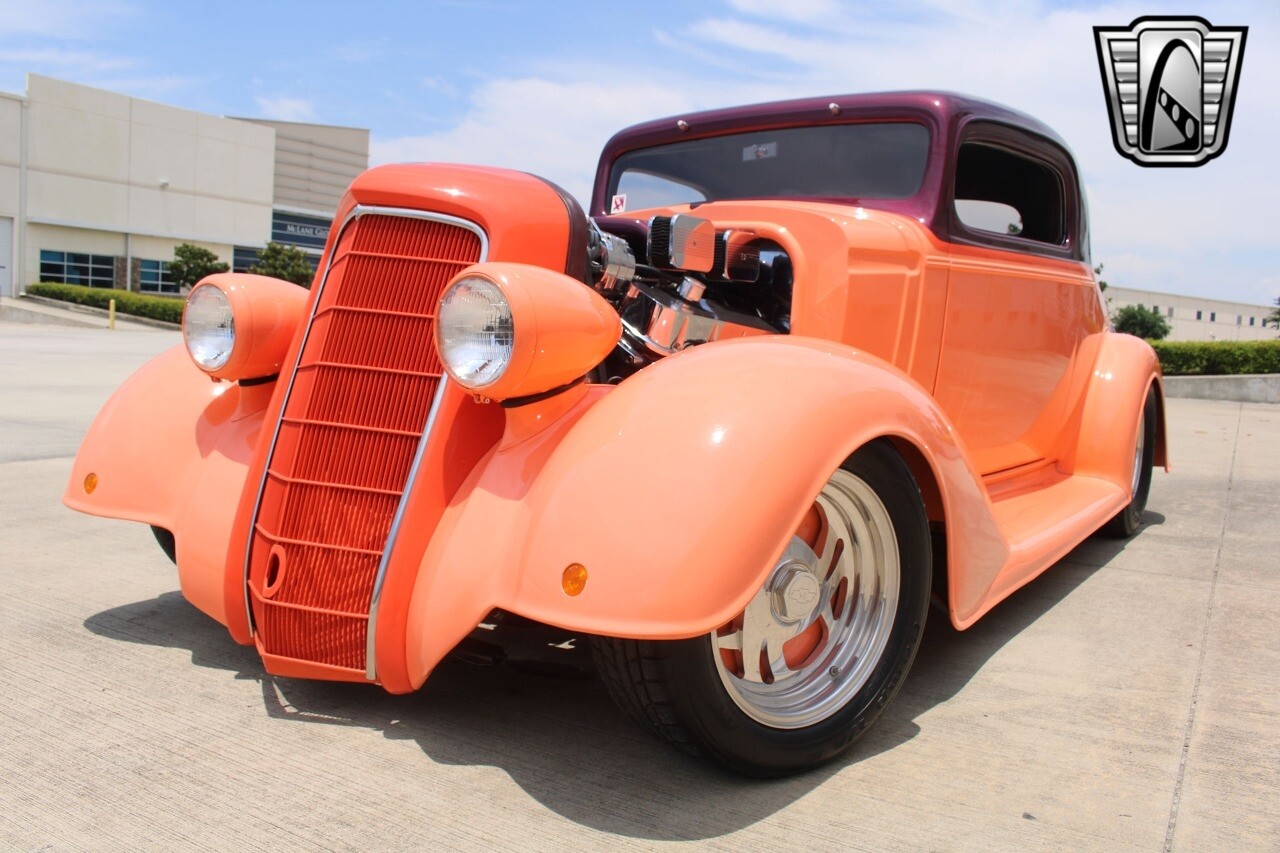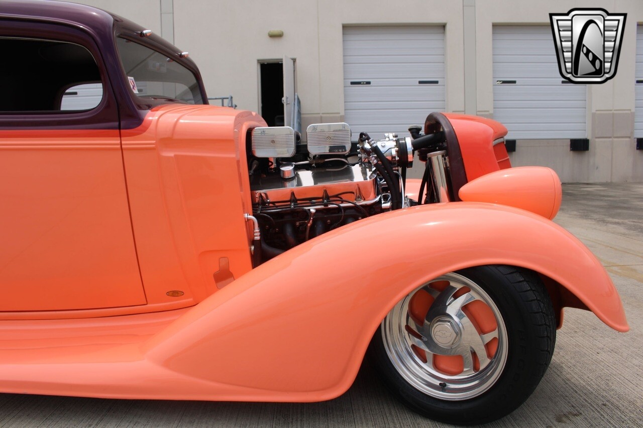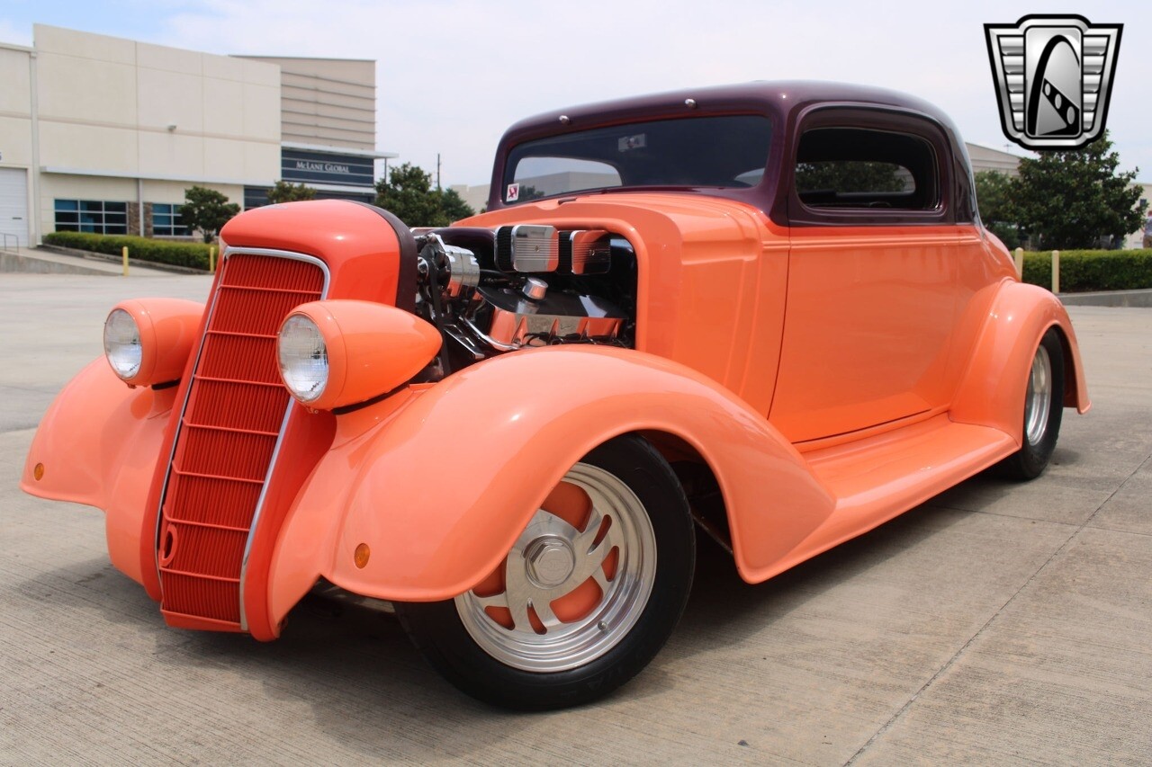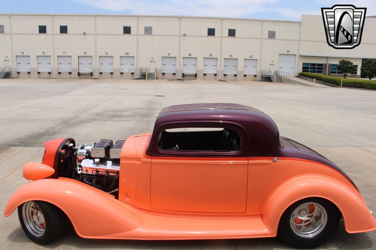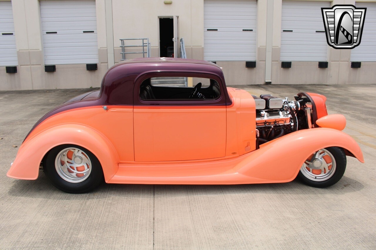 Gateway Classic Cars Houston Showroom is excited to offer this amazing 1934 Oldsmobile Country Club Coupe for sale. According to its owner, there were only 400 of these cars ever produced, and of those, this is the last one known to exist. Not only is that a unique aspect of this car, but according to him, his great grandfather purchased it new, and he is the second owner. Now, we have no way of verifying that, but we'll take his word for it. The car comes with a binder of restoration photos, and suffice it to say that it went from an original steel roller to what you now see, which is pretty wild. It now sports a new custom-fabbed 1/4 x 2 x 4 rectangular tube steel frame, which has been boxed and subframed with a "Z'd, smoothed, painted and finished" configuration. It features Heidts Superide polished stainless steel front suspension, and Heidts Superide Power Rack and Pinion steering. The rear suspension is a polished stainless TCI 4-link setup with adjustable chromed Carrera 350lb spring setup. The rear is a Ford 9" with 3.51:1 gears, and was balanced by Art Morrison. It features a custom Tulsa Drive Shafts drive shaft, which has been balanced to 6500 RPM. The front brakes are discs from a 1988 Corvette, and the rears are standard Ford drums, but the power assist comes from the 1988 Corvette's booster. A monster 502 CID GM/Keikhafer Racing Marine crate motor, topped by a dual quad intake from a 427 Corvette, and dual Edelbrock 4BBL carbs, and is backed by a beefed up 700R4 4-speed automatic transmisson. Hedman headers handle getting exhaust into the dual exhaust, and the offset Turbo mufflers sound great. The body features a 2" angle chop, suicide doors, recessed parking lights, computerized rear lighting, fenders have been welded on and smoothed, along with the running boards. The PPG Pale Orange/Red Orange, and Hawaiian Amethyst base coat/clear coat finish was masterfully applied by Larry Trip of Muskogee, OK. This bad boy not only looks good, but it pulls like a 747 on steroids. If you ever get tired of listing to the monster 502, you can take advantage of the audio system, which features four 1.5" Piezo tweeters, four 6" midrange, and a 12-inch subwoofer. Sound gets to the speakers via a Sony KT7500 head unit, supported by bridged 4 channel 800W amp and 400W subwoofer amp. Vintage Air has been installed, but it's never been charged with refrigerant. The occupants will find the custom burgundy leather-covered 2002 Acura Legend seats to be very comfortable for long cruises. [ omitted ].