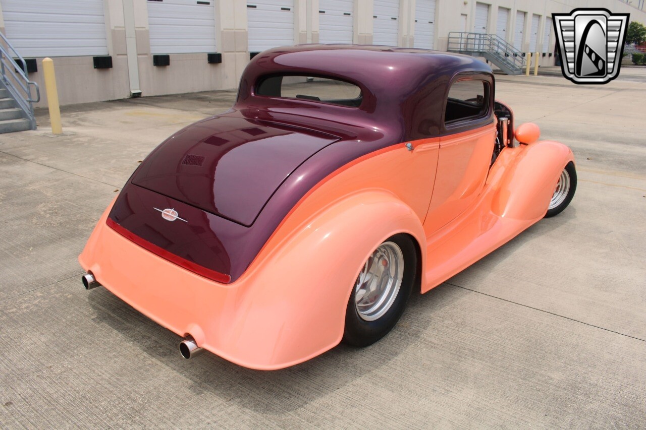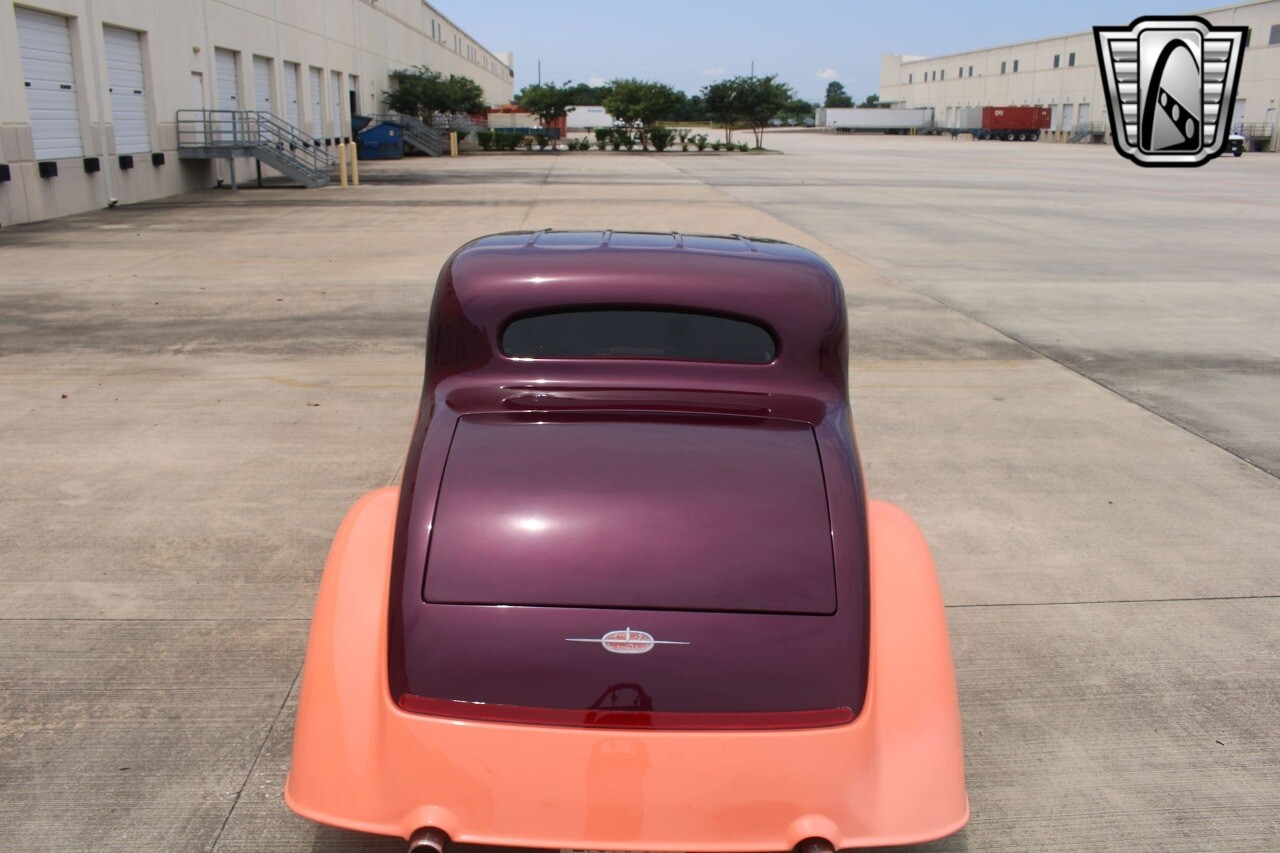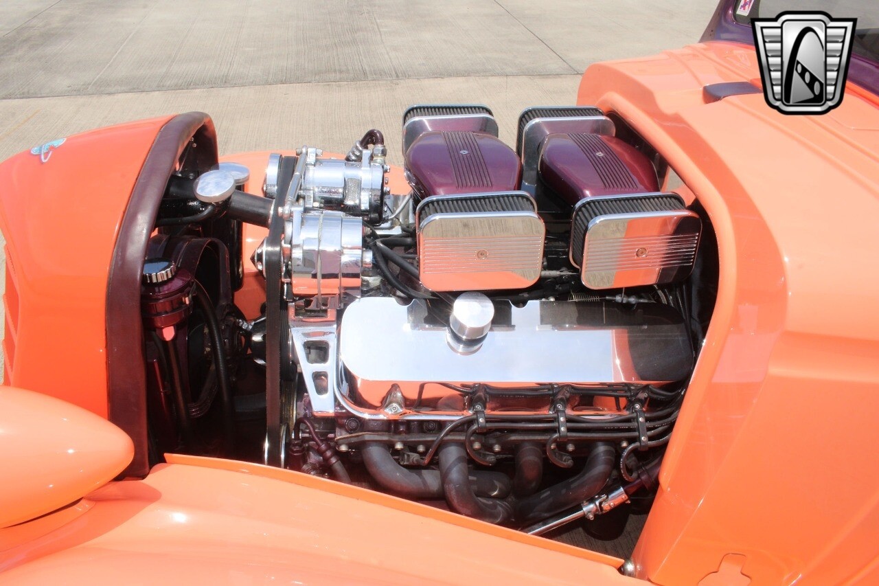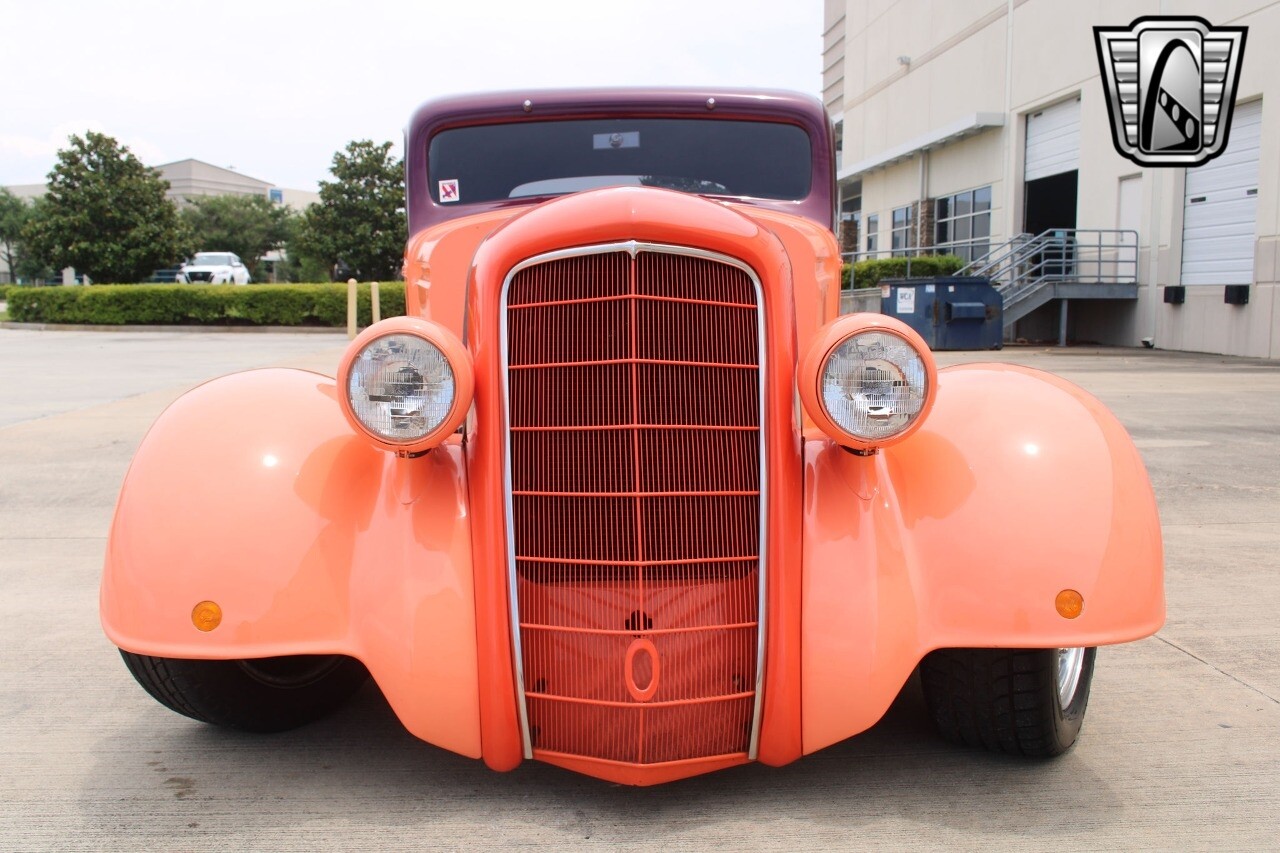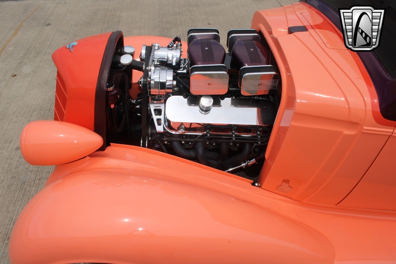 Gateway Classic Cars Houston Showroom is excited to offer this amazing 1934 Oldsmobile Country Club Coupe for sale. According to its owner, there were only 400 of these cars ever produced, and of those, this is the last one known to exist. Not only is that a unique aspect of this car, but according to him, his great grandfather purchased it new, and he is the second owner. Now, we have no way of verifying that, but we'll take his word for it. The car comes with a binder of restoration photos, and suffice it to say that it went from an original steel roller to what you now see, which is pretty wild. It now sports a new custom-fabbed 1/4 x 2 x 4 rectangular tube steel frame, which has been boxed and subframed with a "Z'd, smoothed, painted and finished" configuration. It features Heidts Superide polished stainless steel front suspension, and Heidts Superide Power Rack and Pinion steering. The rear suspension is a polished stainless TCI 4-link setup with adjustable chromed Carrera 350lb spring setup. The rear is a Ford 9" with 3.51:1 gears, and was balanced by Art Morrison. It features a custom Tulsa Drive Shafts drive shaft, which has been balanced to 6500 RPM. The front brakes are discs from a 1988 Corvette, and the rears are standard Ford drums, but the power assist comes from the 1988 Corvette's booster. A monster 502 CID GM/Keikhafer Racing Marine crate motor, topped by a dual quad intake from a 427 Corvette, and dual Edelbrock 4BBL carbs, and is backed by a beefed up 700R4 4-speed automatic transmisson. Hedman headers handle getting exhaust into the dual exhaust, and the offset Turbo mufflers sound great. The body features a 2" angle chop, suicide doors, recessed parking lights, computerized rear lighting, fenders have been welded on and smoothed, along with the running boards. The PPG Pale Orange/Red Orange, and Hawaiian Amethyst base coat/clear coat finish was masterfully applied by Larry Trip of Muskogee, OK. This bad boy not only looks good, but it pulls like a 747 on steroids. If you ever get tired of listing to the monster 502, you can take advantage of the audio system, which features four 1.5" Piezo tweeters, four 6" midrange, and a 12-inch subwoofer. Sound gets to the speakers via a Sony KT7500 head unit, supported by bridged 4 channel 800W amp and 400W subwoofer amp. Vintage Air has been installed, but it's never been charged with refrigerant. The occupants will find the custom burgundy leather-covered 2002 Acura Legend seats to be very comfortable for long cruises. [ omitted ].