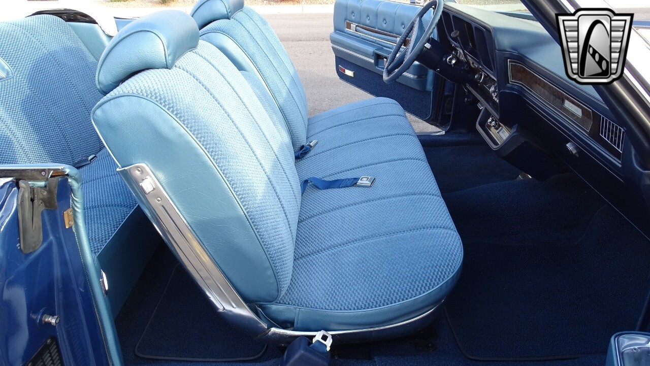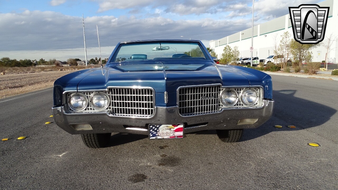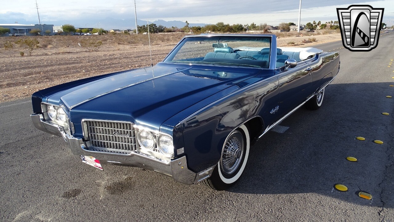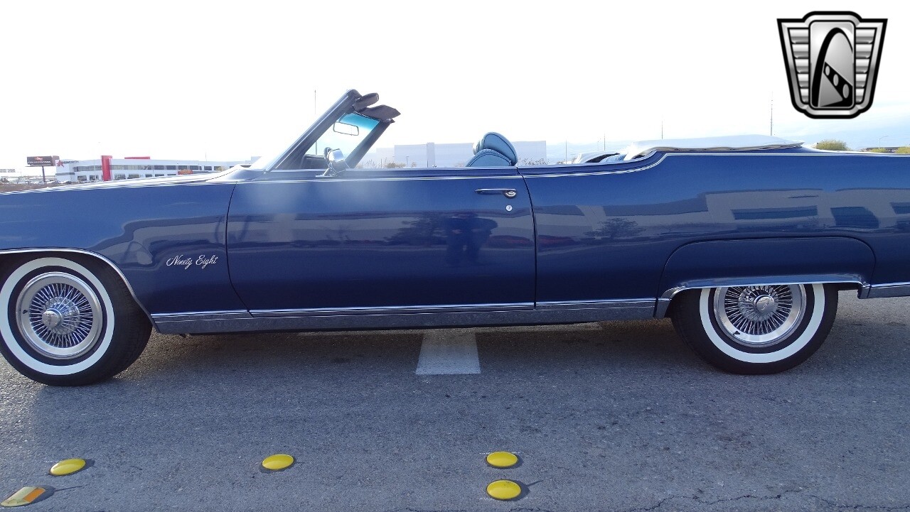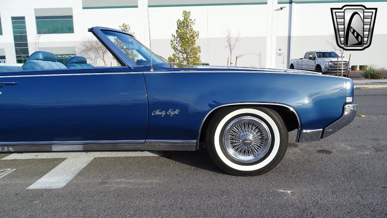 Gateway Classic Cars of Las Vegas would like to present this 1969 Oldsmobile 98. The 1969 Ninety-Eight (eight generation) remained the top-of-the-line Oldsmobile. It was the largest Oldsmobile product offered with a wheelbase of 127.0 inches. The owner states this vehicle has been in their family since 1971 and was treated to a restoration and paint approximately 5 years ago. Powered by a 455ci Rocket V8 with a new carb and manual and electric fuel pump and cooled by a Hayden 4 row radiator, this engine is mated to a 3-speed turbo 400 automatic transmission that owner states has 200 miles. Painted Trophy Blue and complimented with a light blue cloth interior. According to the owner it has only a couple hundred miles since the rebuild and has spent it's life in Idaho and Nevada. Rebuilt options include: new power convertible top with glass back window. It also includes power window/steering, tilt/telescoping steering column, power front disc brakes (acquired from a 1970 Olds 98), AM/FM 8-track stereo and power 6-way front bench seat. Aftermarket upgrades include dual exhaust, LED lights (inside and out where possible) and HEI distributor. Owner states the front end was also rebuilt, replacing wheel bearings, tie rod ends, ball joints, etc. it required three different parts cars in order to restore this vehicle to the beauty it is today. .