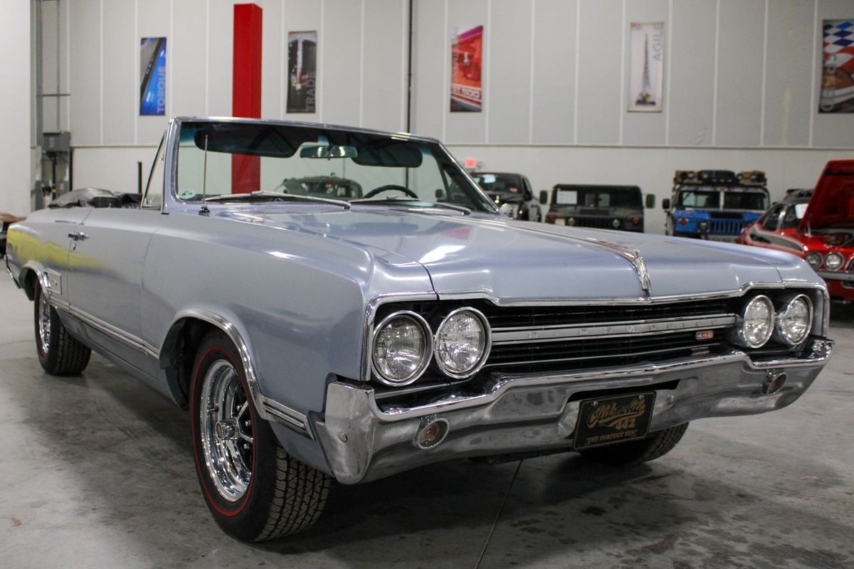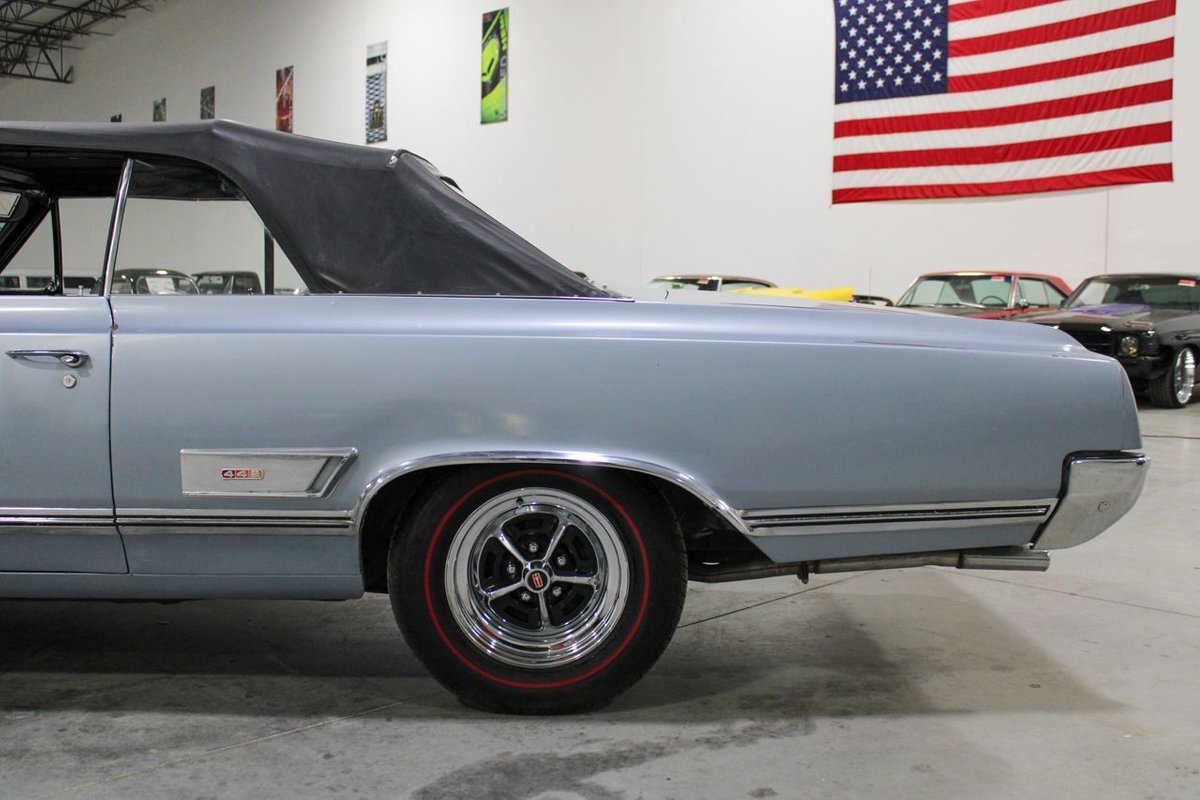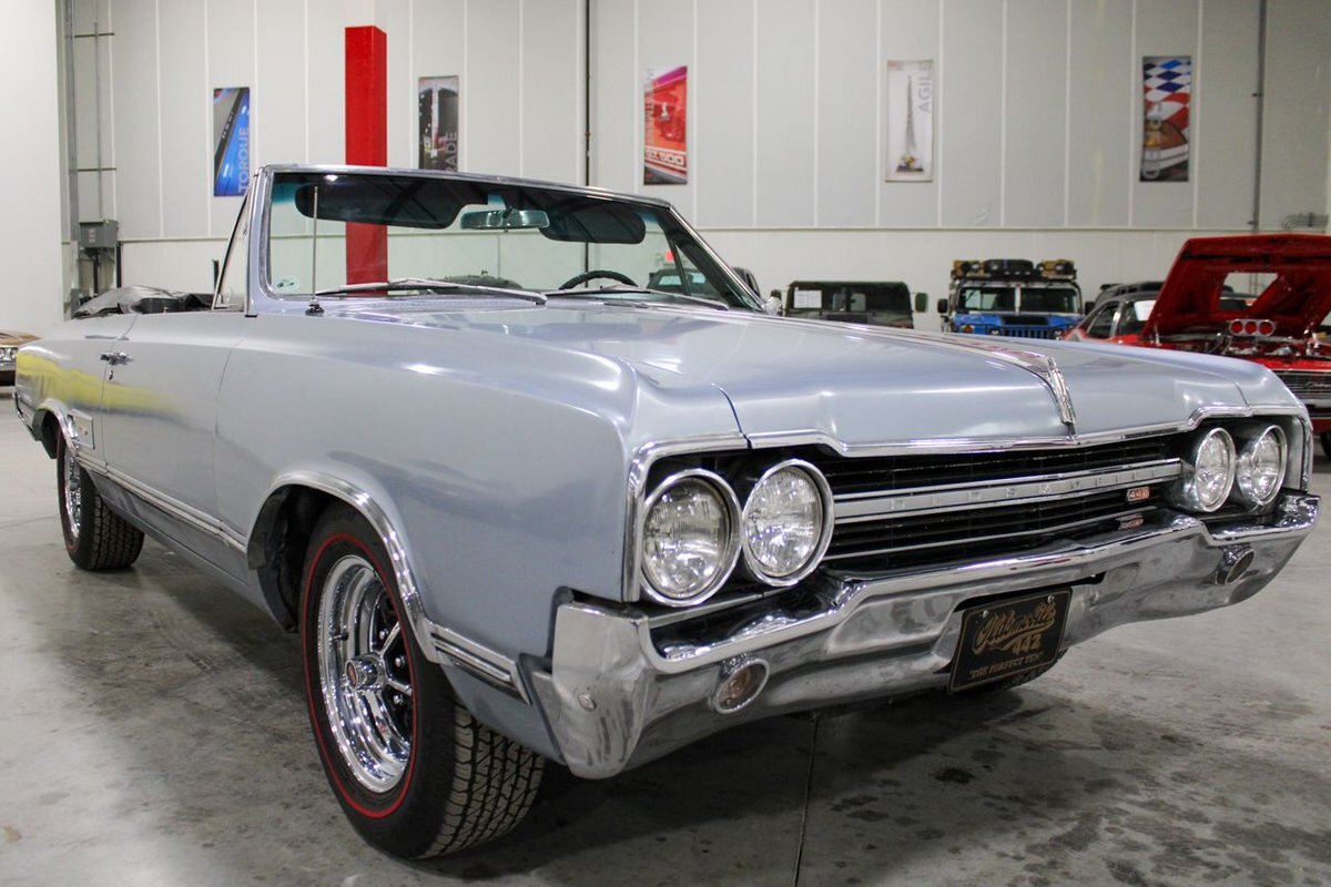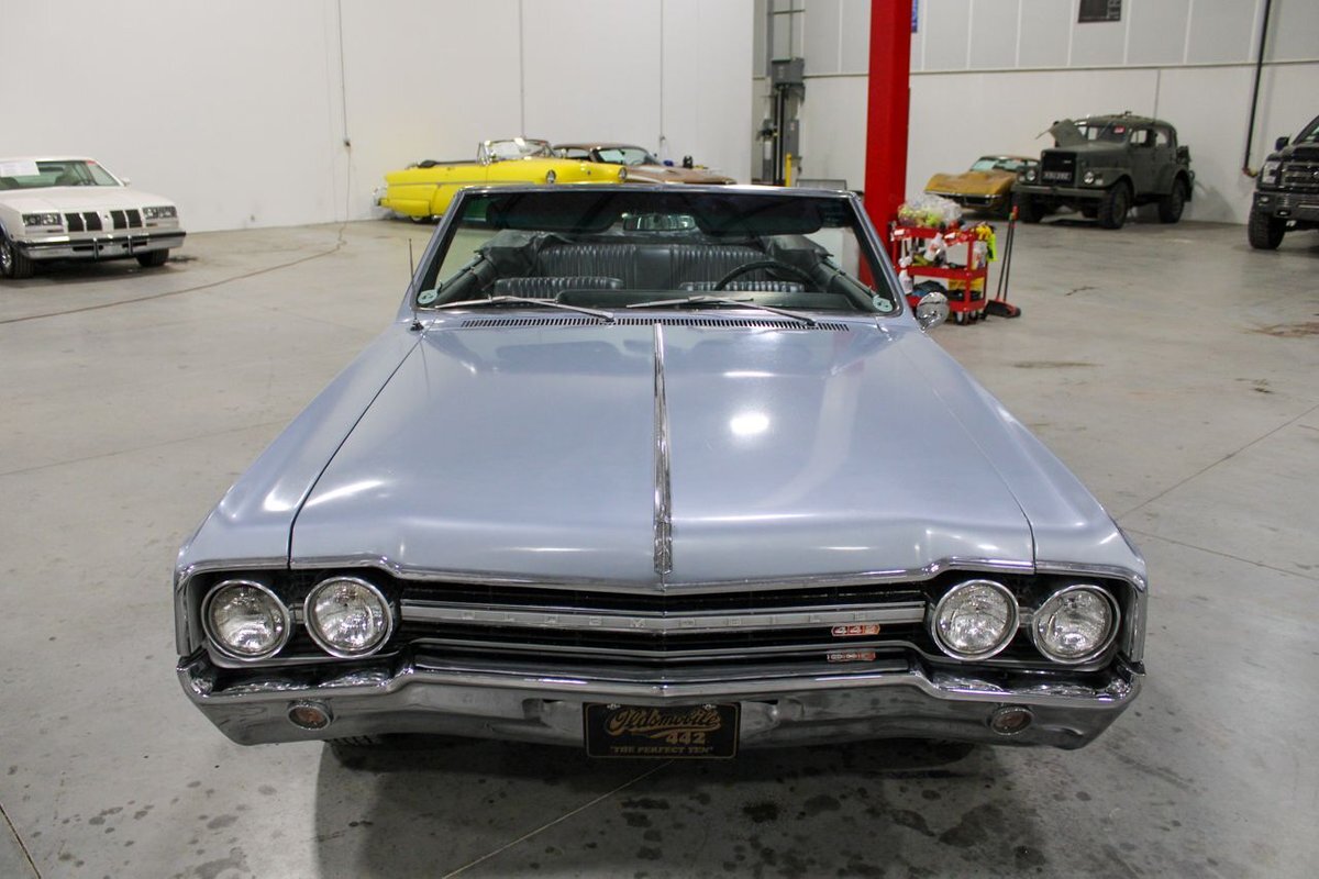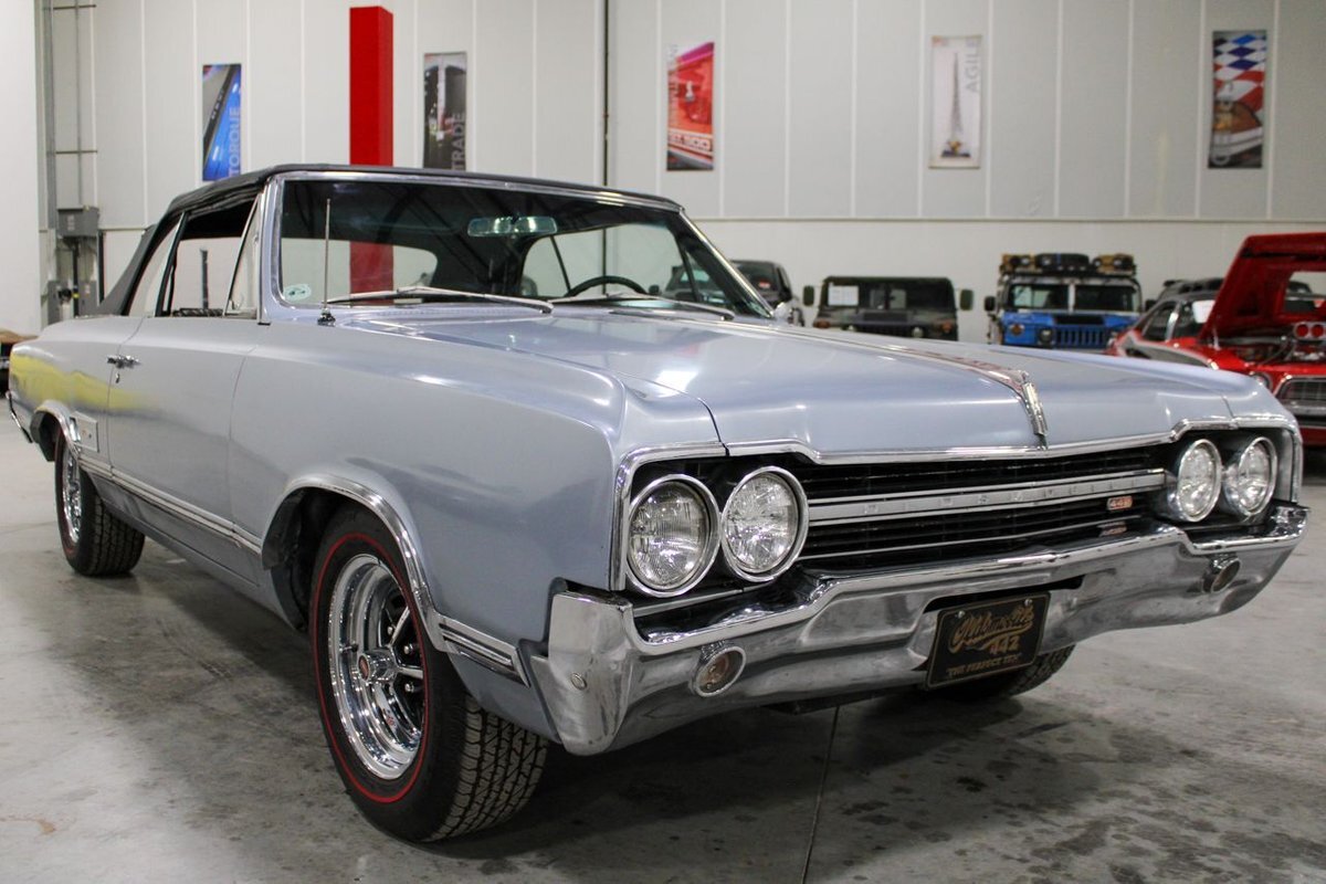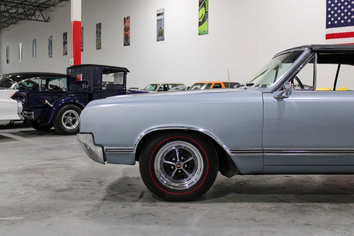 Welcome to our showroom! Feast your eyes on the stunning 1965 Oldsmobile Cutlass 442 Convertible in Sheffield Mist Poly. This beauty isn't just a car – it's a blast from the past that'll make you feel like a king on the road. With its sleek design and eye-catching color, it's bound to make heads turn wherever you go.