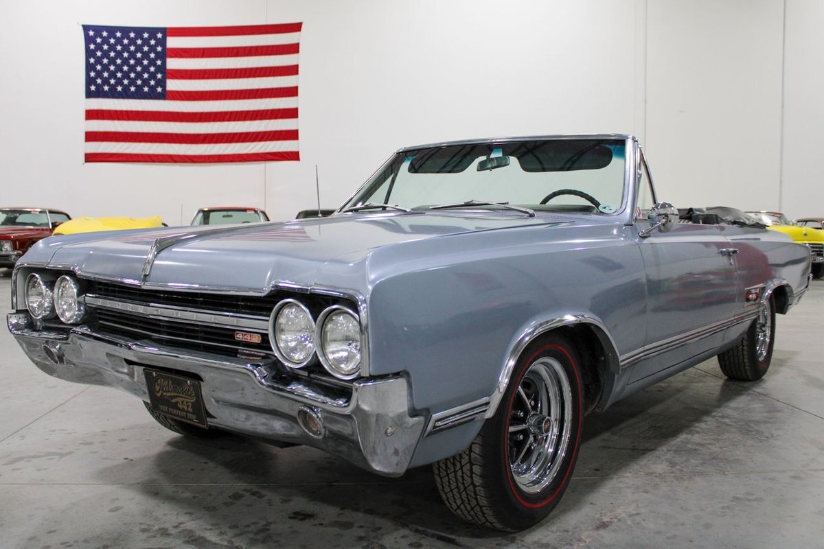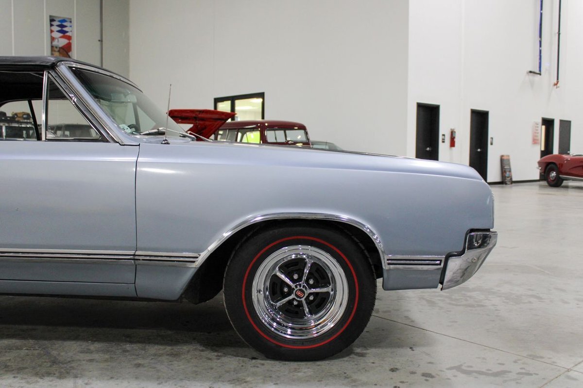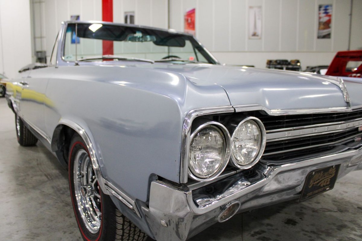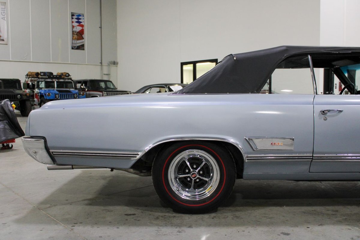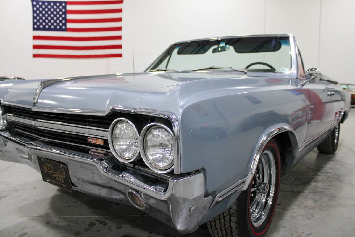 Welcome to our showroom! Feast your eyes on the stunning 1965 Oldsmobile Cutlass 442 Convertible in Sheffield Mist Poly. This beauty isn't just a car – it's a blast from the past that'll make you feel like a king on the road. With its sleek design and eye-catching color, it's bound to make heads turn wherever you go.