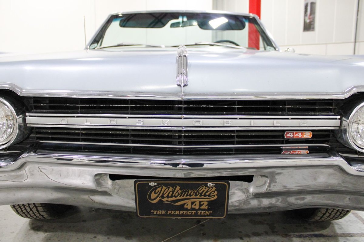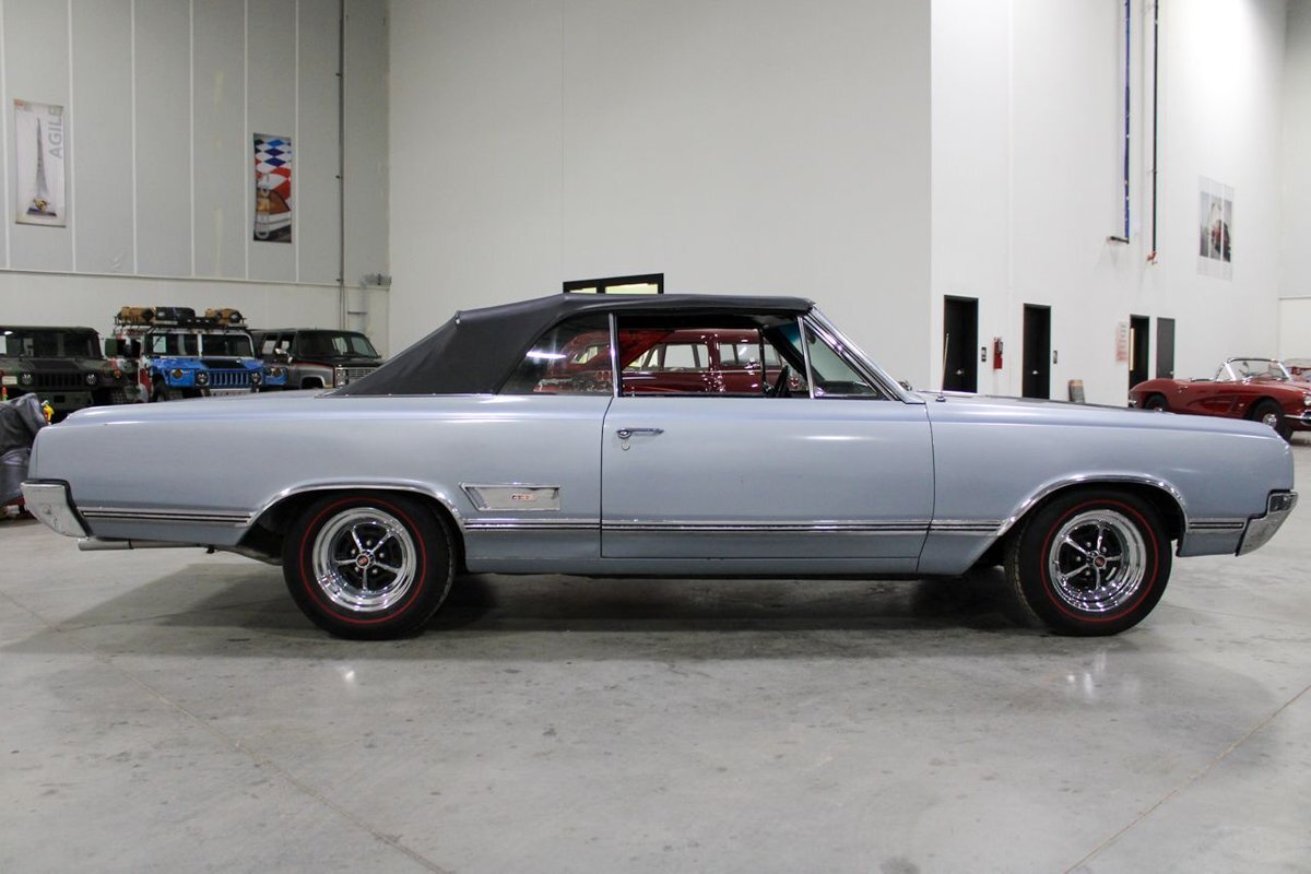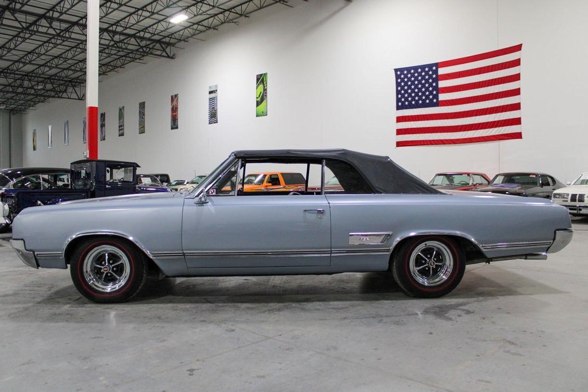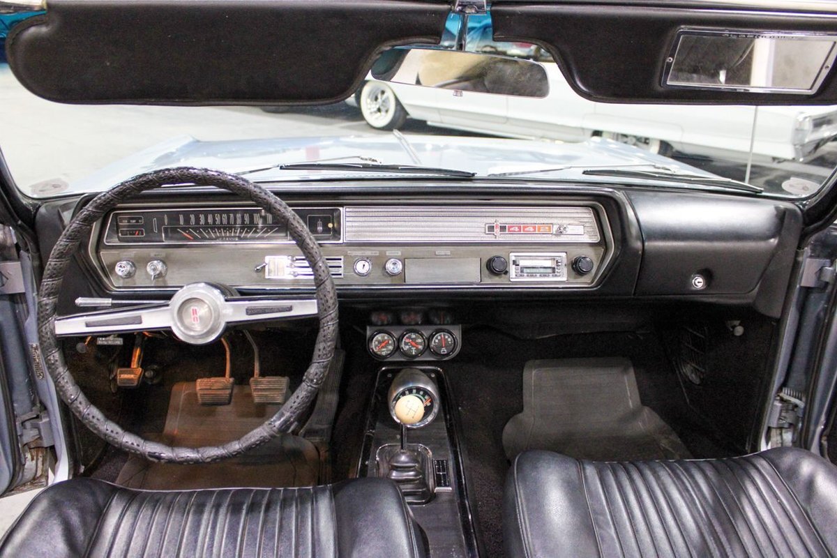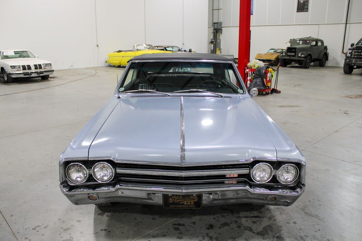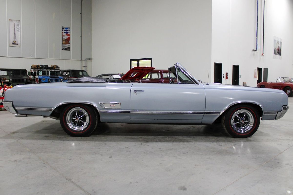 Welcome to our showroom! Feast your eyes on the stunning 1965 Oldsmobile Cutlass 442 Convertible in Sheffield Mist Poly. This beauty isn't just a car – it's a blast from the past that'll make you feel like a king on the road. With its sleek design and eye-catching color, it's bound to make heads turn wherever you go.