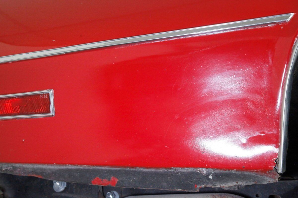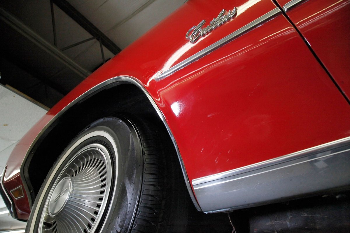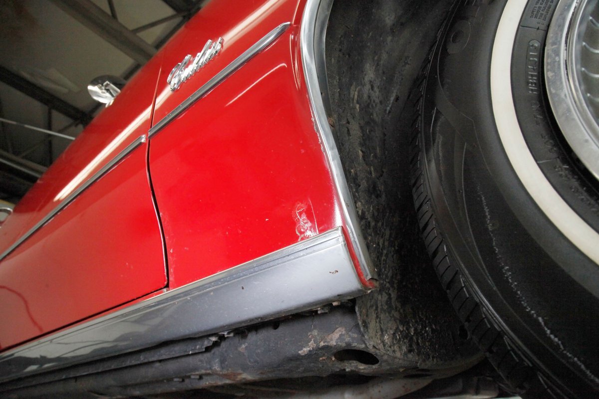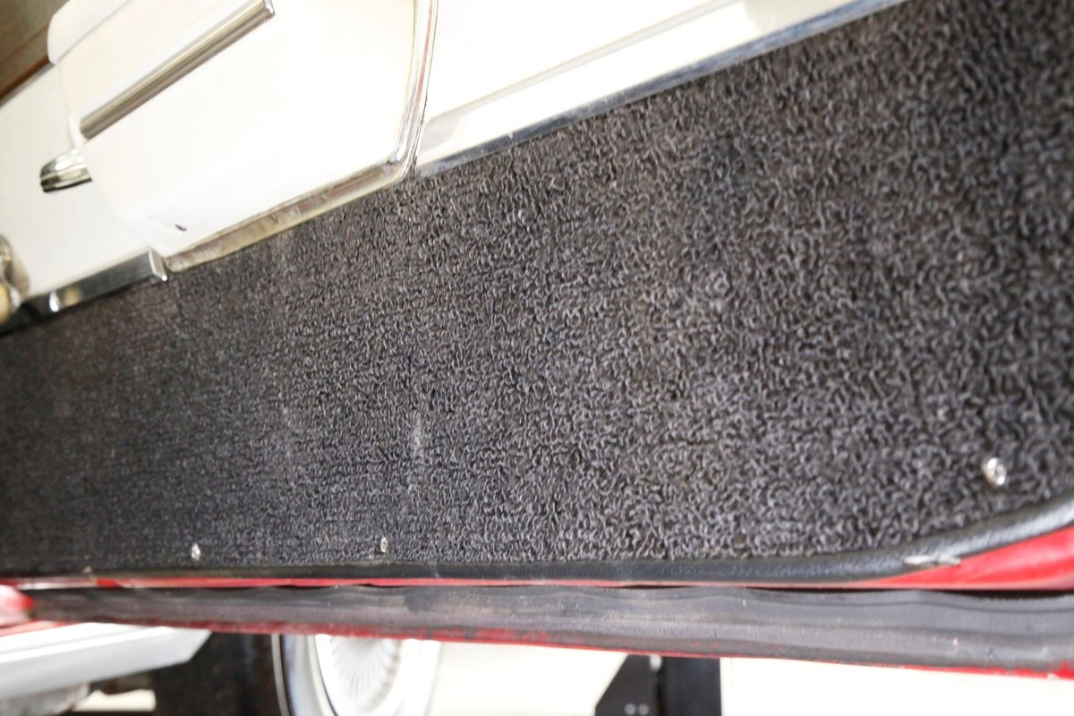 Repainted in its original color of Matador Red, the paint is looking good with its body contour following painted on pinstriping, but does have a few issues on the lower panels. Here we note a few runs, inclusions, evidence of prior body work and a few areas of invasive rust peeking through the finish. A perfectly aligned split grille and dual headlights with a pristine bumper below which continues the grille opening and houses round signal/running lights is below. Shiny trimmings show up all over this car and work in conjunction with the pinstripe to accentuate the forward moving form of this car. These include wheel well trim, rocker trim, lower beltline spear and window trimmings are all looking great. Steel panels are straight save for the aforementioned issues and have well minded gaps. Covering the expansive roof is a clean and crisp white vinyl roof with B-pillar C/S emblems all looking showroom fresh. Bringing up the rear is a beautiful V formed rear bumper with a series of 6 square inset tail lights on each side. Newer Hankook thin white wall tires wrap 14 inch turbine style wheel covers which have raised centers to emulate a rocket tail. "And now we see not just another pretty car."