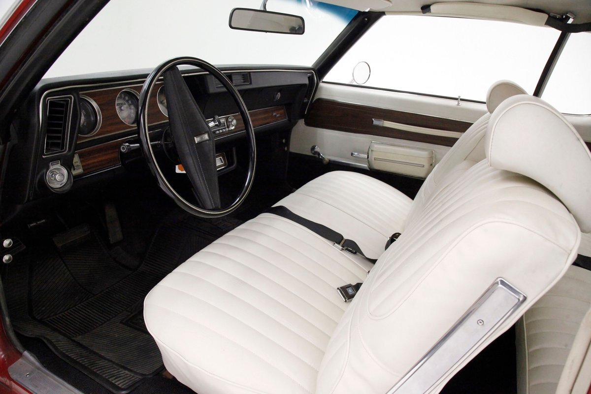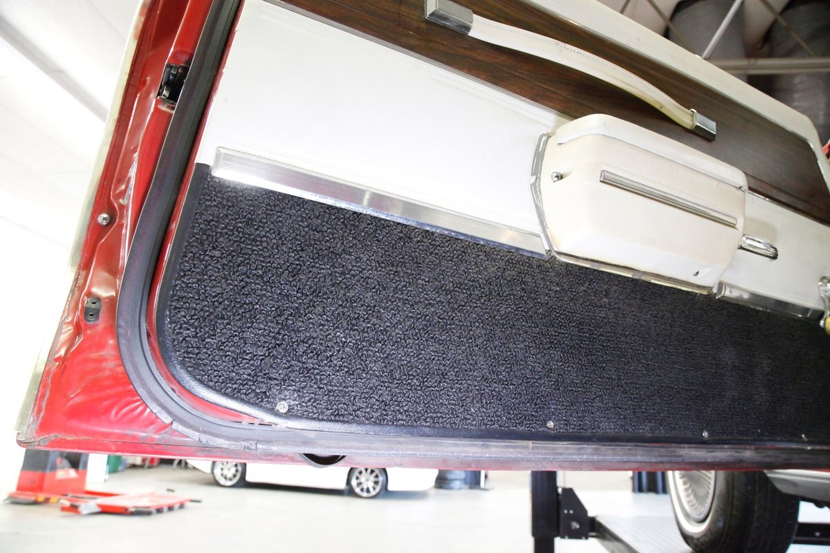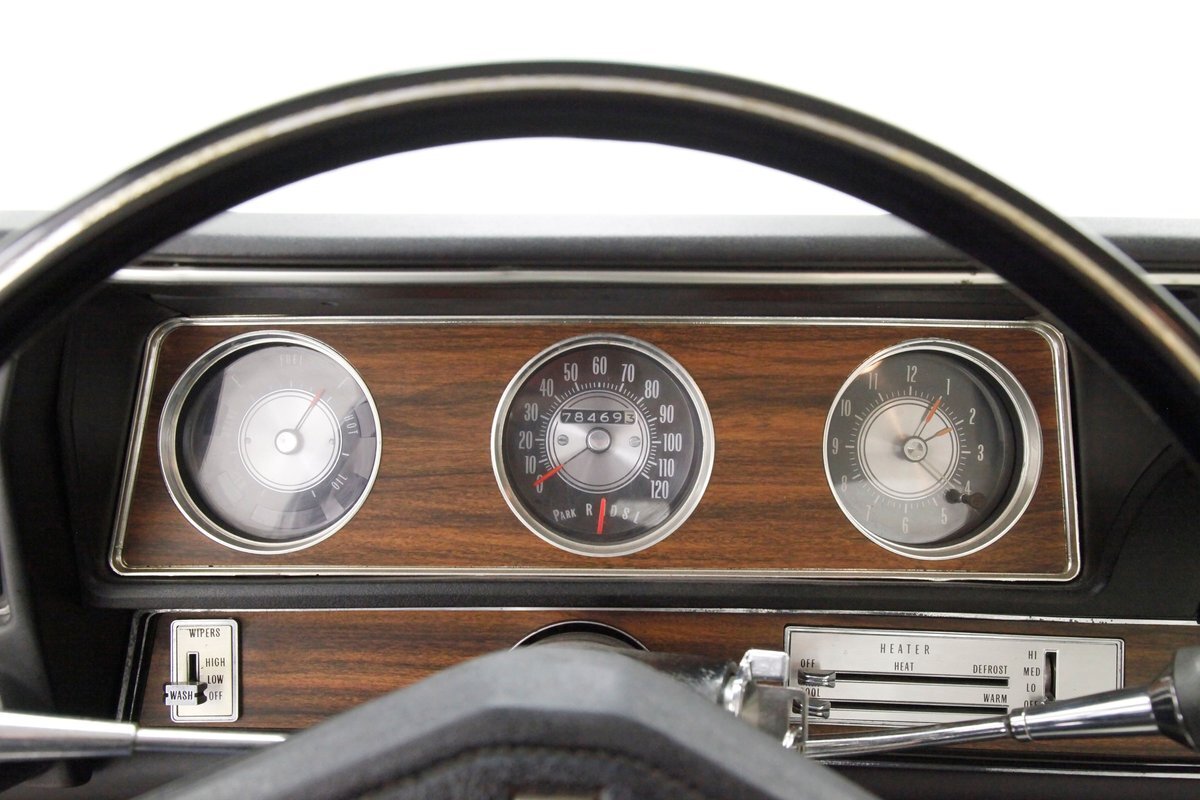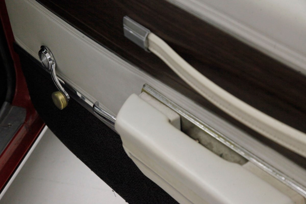 Opening the large well balanced doors we shake hands with a wonderful door panel on either side these have white vinyl surrounding an island of wood applique which houses the leather door pull and just below are white armrests which have the door actuator. Offsetting the white is a strip of black carpeting just below. Slipping inside we get behind the original wheel which fronts a very clean and original dash. This presents to us in black and is loaded with plenty of wood applique for the gauge cluster. Fronting this dash is a wonderfully clean split back bench front seat which is tuck and roll white vinyl and has a central fold up and down armrest. The back has an equally beautiful and clean rear bench, and these all float in a sea of black flawless carpeting. A shout out to the trunk with its wonderful plaid mat, vinyl spare tire cover and speckle finished sides. Sit back and turn on the factory AM radio with an 8-track player and breathe in the 1972 design you are now surrounded by! "Nothing to watch but the road.."