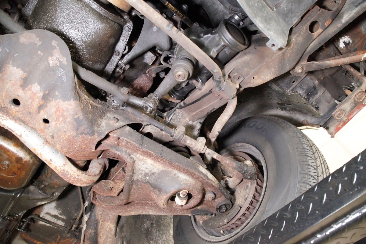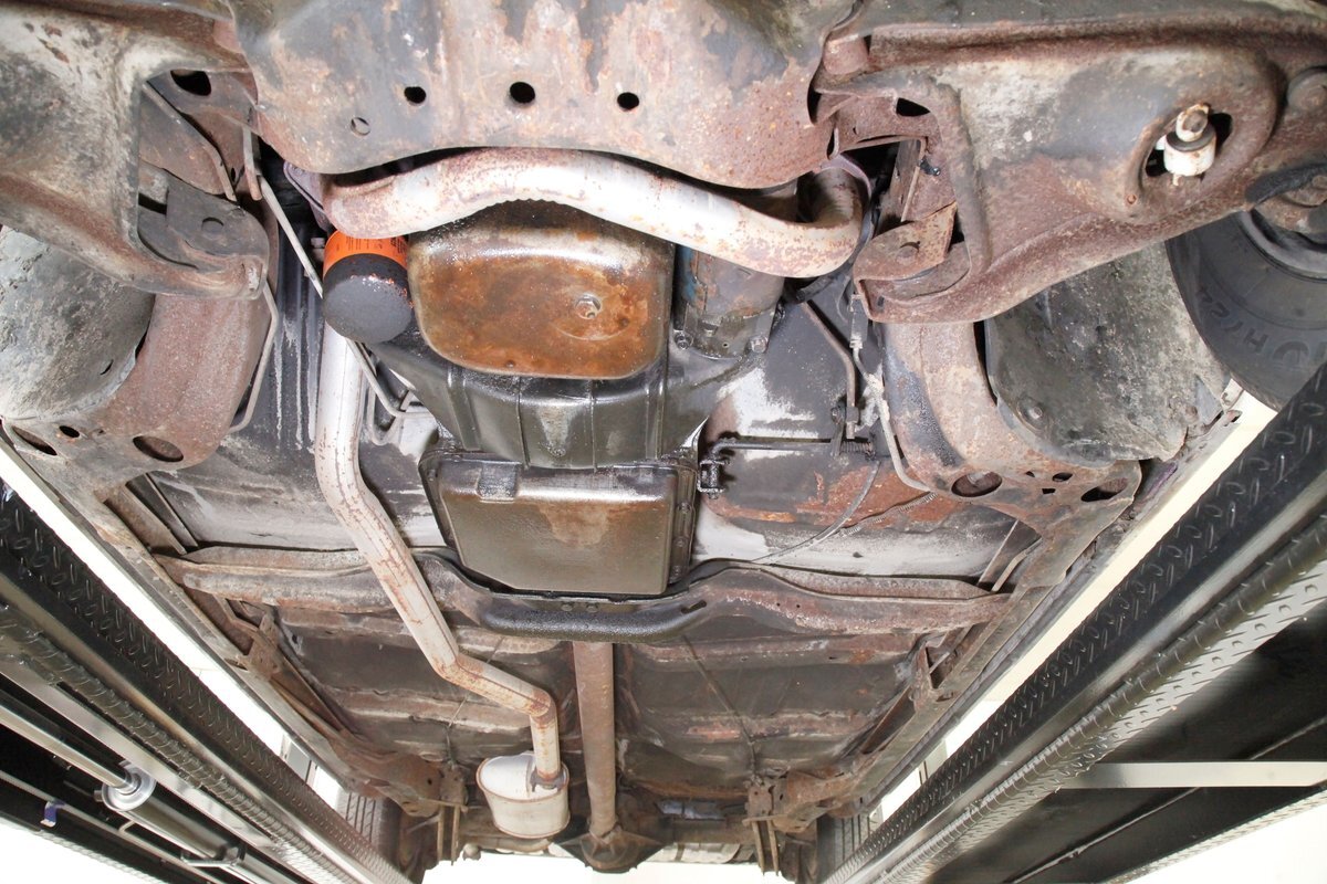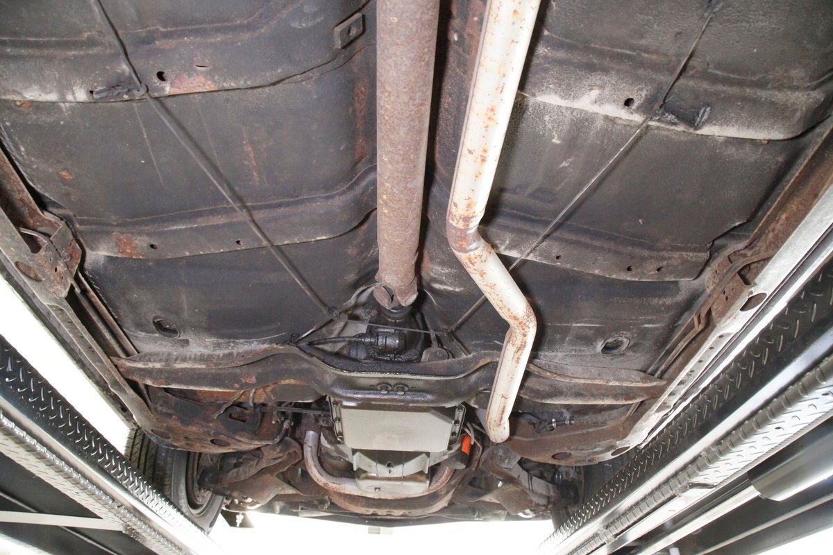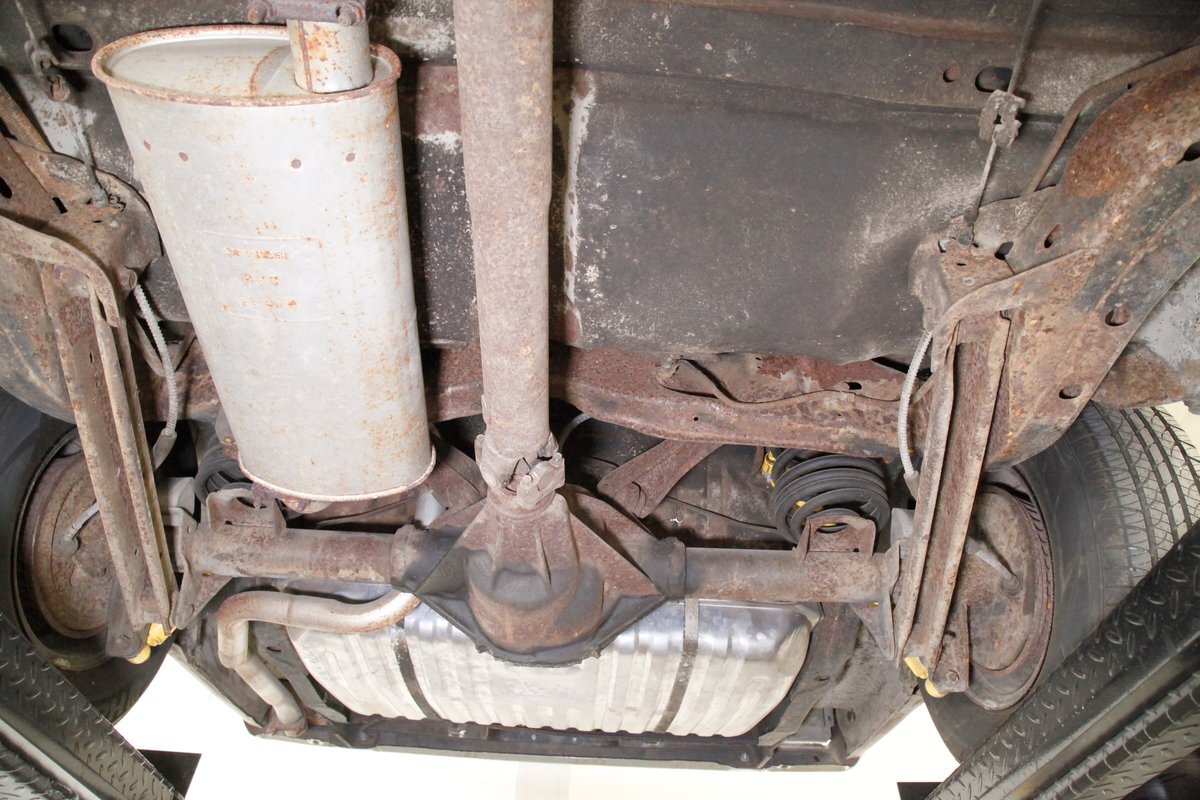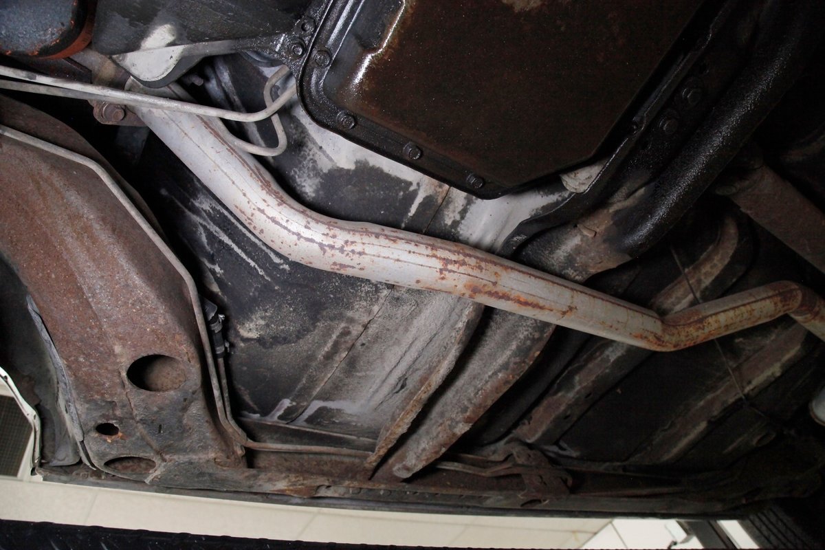 Nice and straight with some undercoating and bits of surface rust on the usual suspects, but the frame and flooring is strong and sturdy. Power drum brakes are seen all around and providing the quality Oldsmobile ride is an independent coil sprung front suspension and a 4 link and coil spring arrangement in the rear. Handling the exhale is a single exhaust system that remains solid as its snakes its way rearward from the Rocket mill.