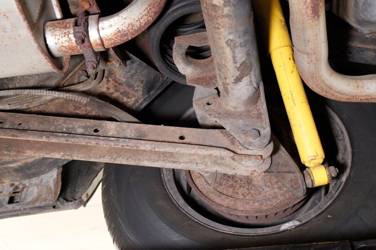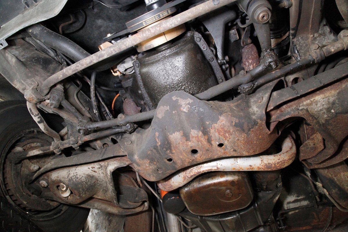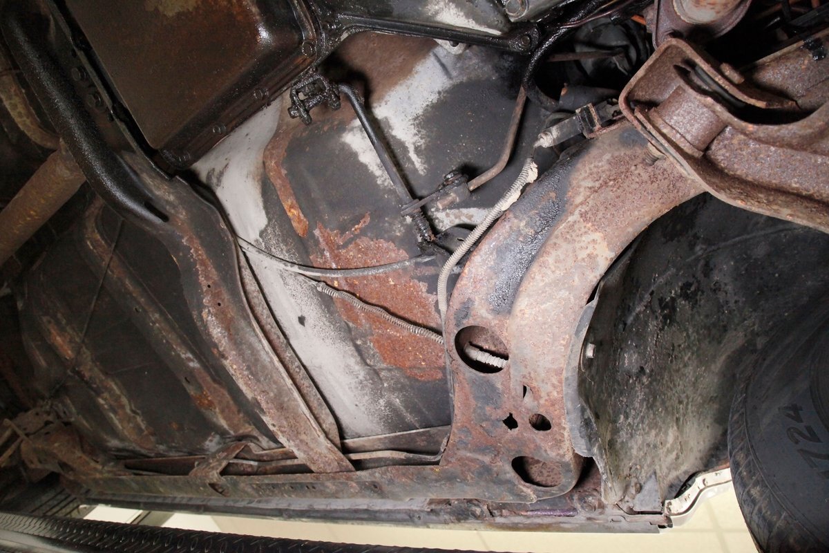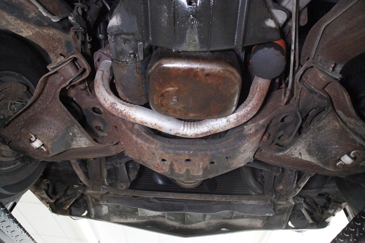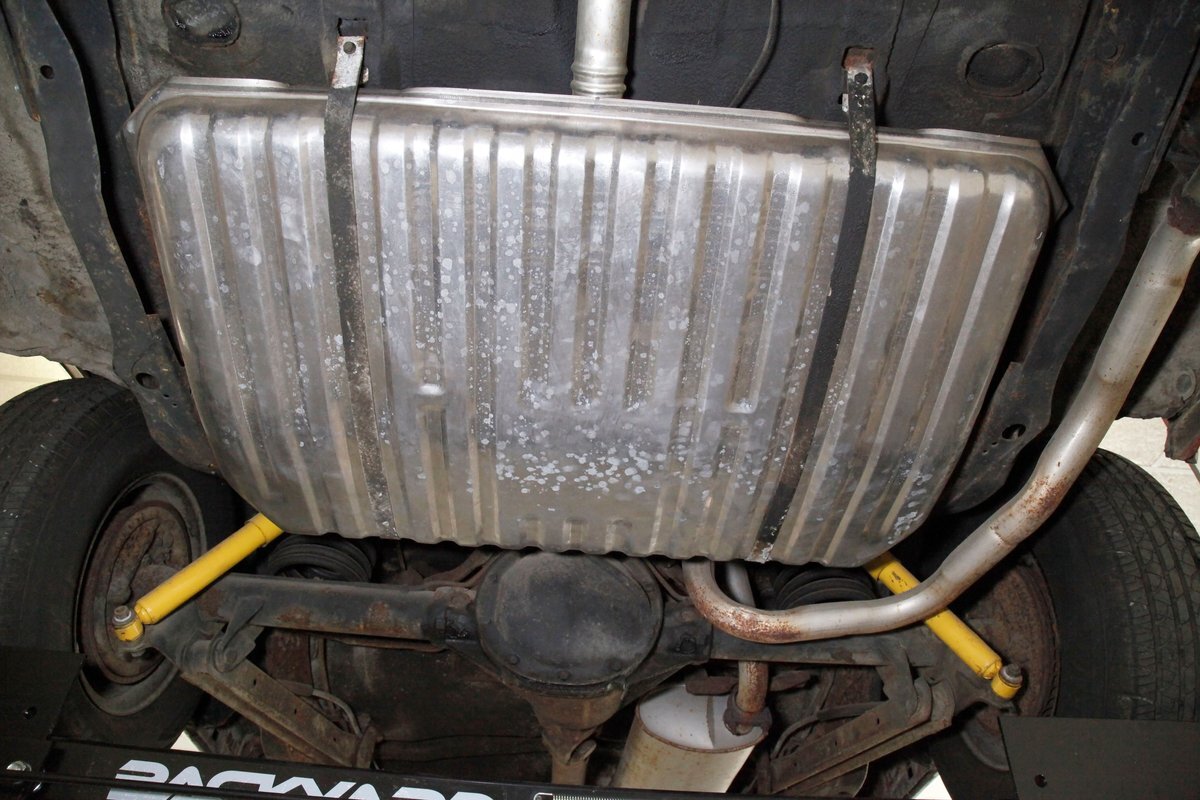 Nice and straight with some undercoating and bits of surface rust on the usual suspects, but the frame and flooring is strong and sturdy. Power drum brakes are seen all around and providing the quality Oldsmobile ride is an independent coil sprung front suspension and a 4 link and coil spring arrangement in the rear. Handling the exhale is a single exhaust system that remains solid as its snakes its way rearward from the Rocket mill.
