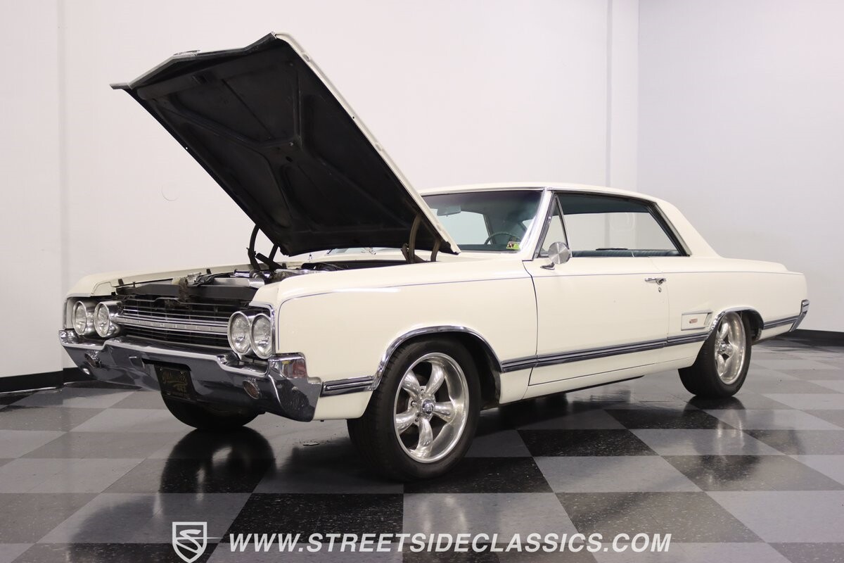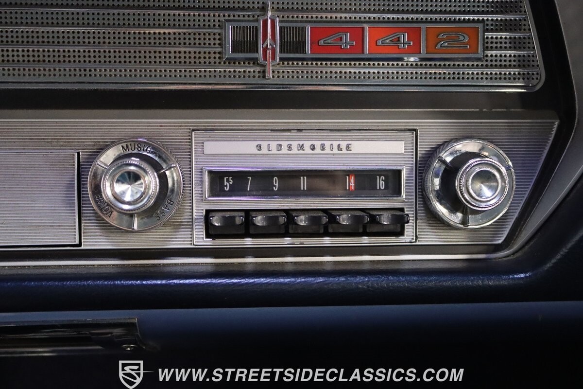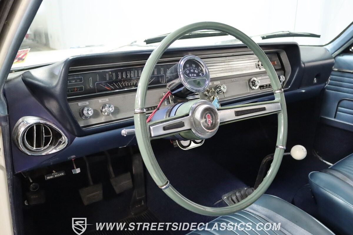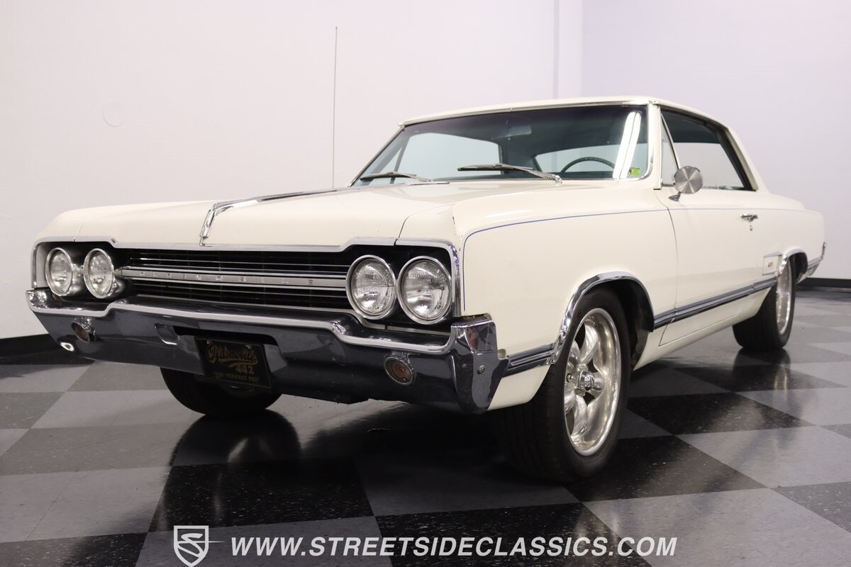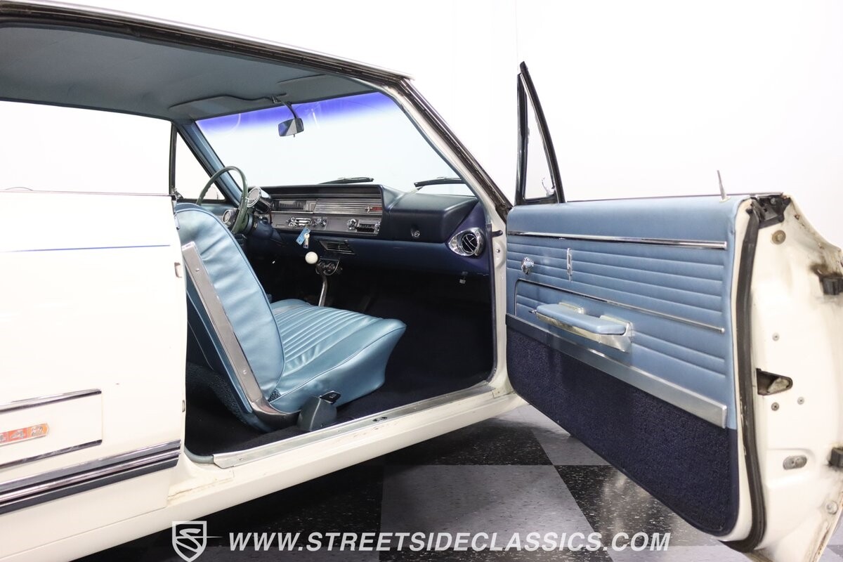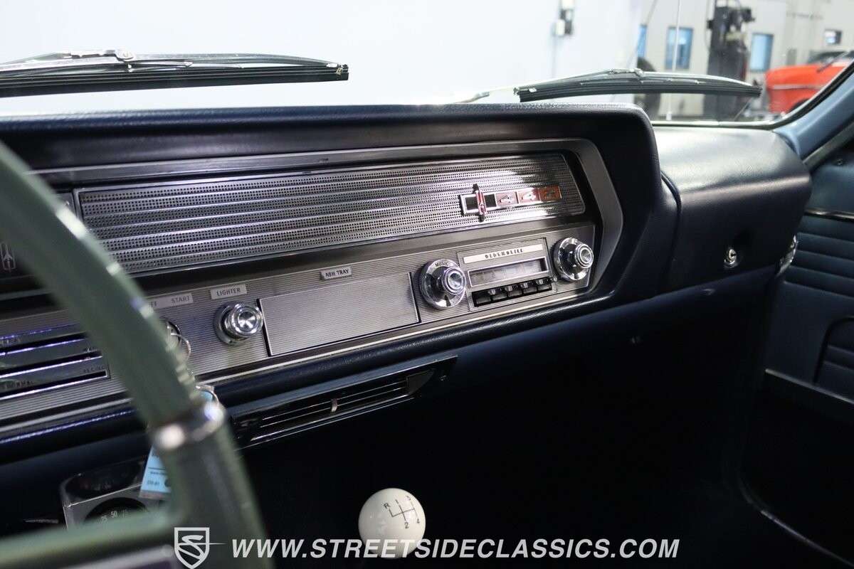 Before Linda Vaughn became synonymous with her iconic appearances on the rear of the '72 Hurst Olds, there was the predecessor that set the stage – the 1965 Oldsmobile Cutlass 442. This Oldsmobile is a superb example of the 442's prowess, boasting the original Provincial White paint and blue vinyl interior maintaining its authenticity and historical integrity. The interior features original blue vinyl bucket seats and a Hurst floor shifter. The believed original interior adds to its authenticity, showcasing the car's well-maintained condition and believed actual mileage of 58,392 miles.