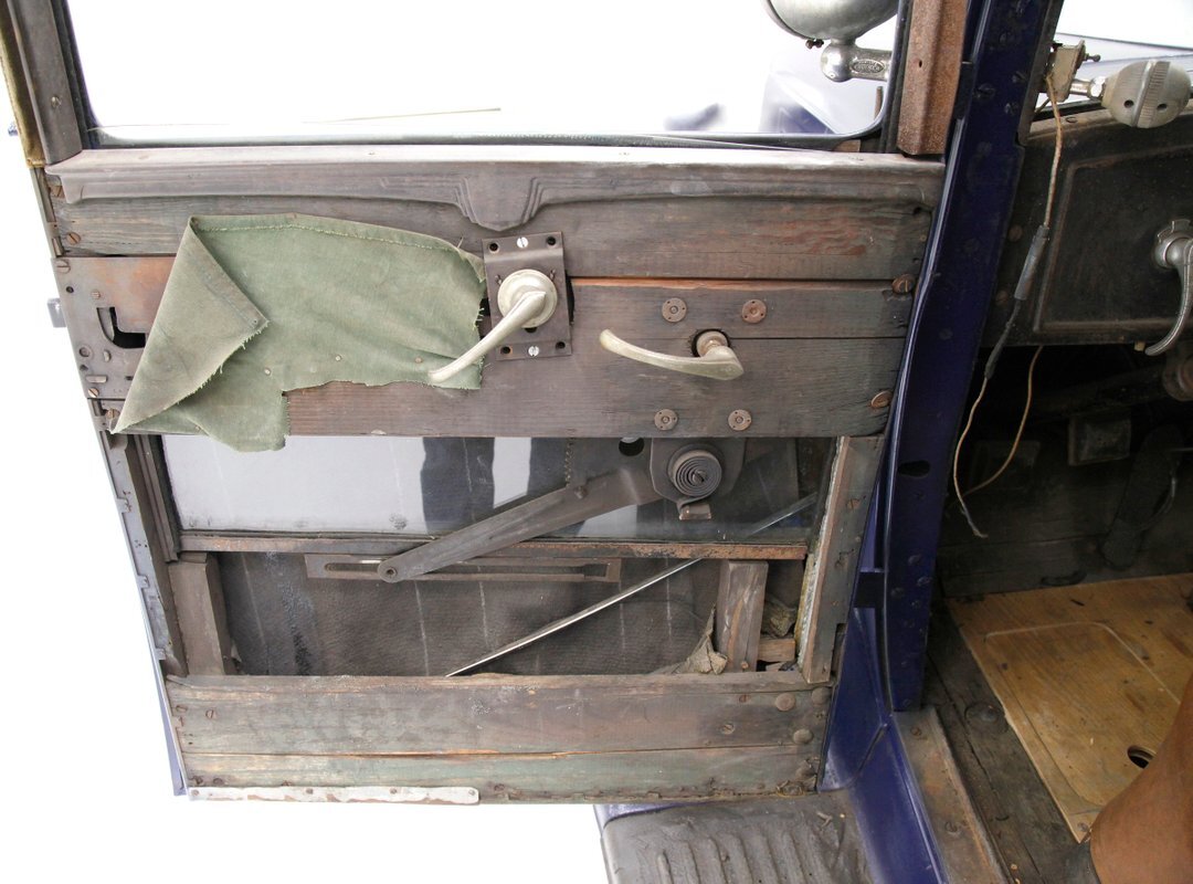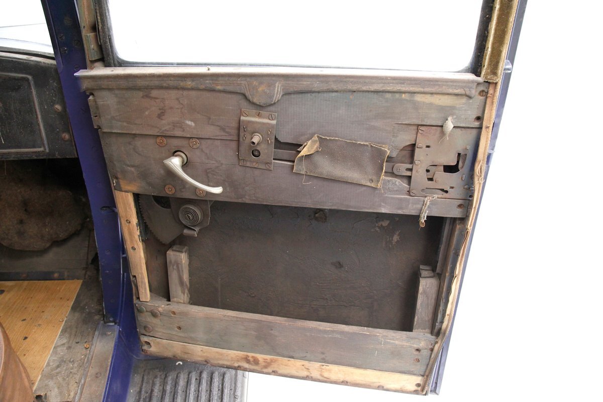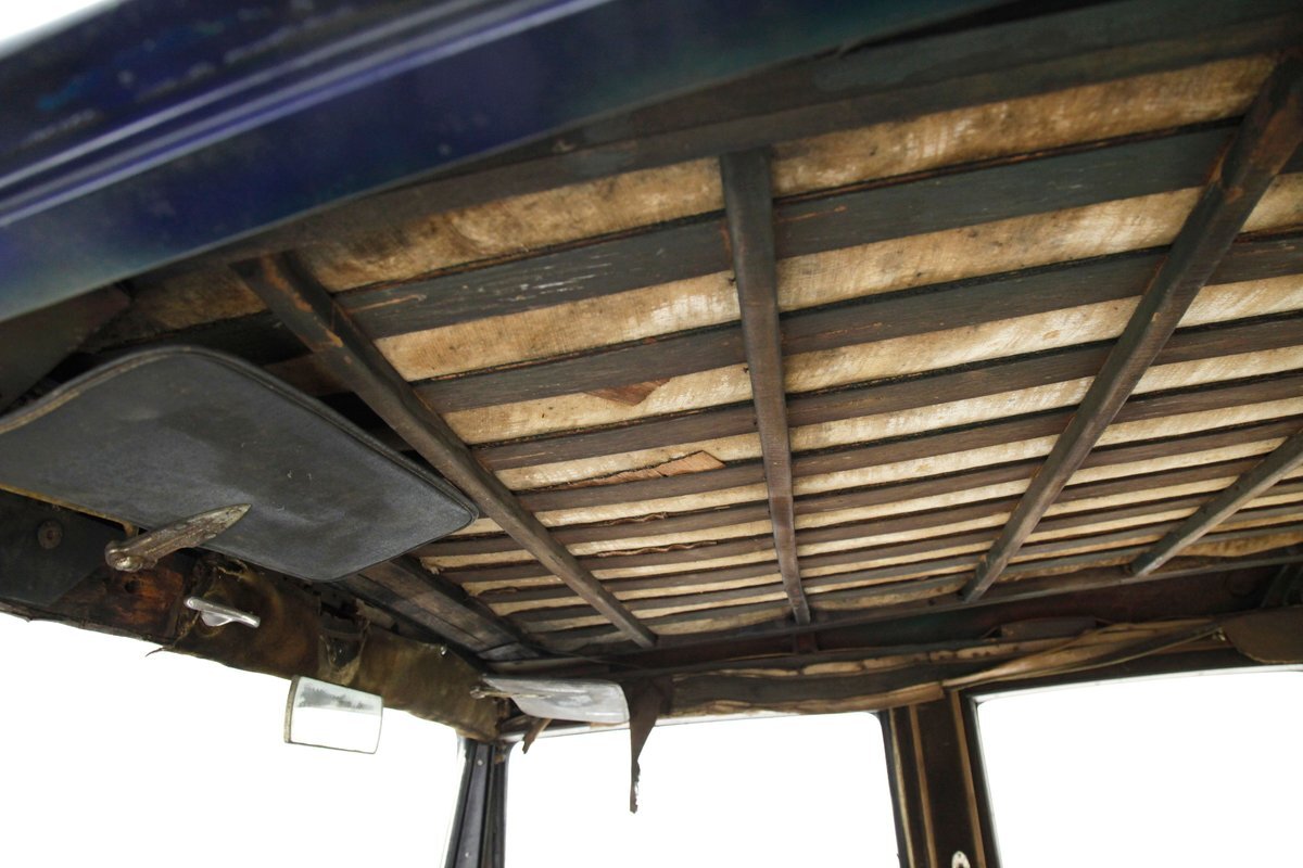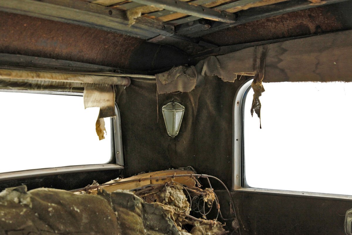 Uncovered door panels reveal the wood plank and metal construction of the era. Interesting to see how simply it was assembled and to visualize the inner workings. A saddle covered vinyl front bench sits in front of the dash, which replaces an original mohair front bench. In back is an original mohair bench which has long since rotted away and just a bit of the cloth is left with mostly stuffing and springs. If you look closely you can still see some of the luxury once surrounded by the pillar lighting corded pulls and massive leg room for the rear passengers. Rear doors give us a hint of the door panels which were covered in mohair. Wood lath covers the headliner which is the underside of the previously stated metal panel.