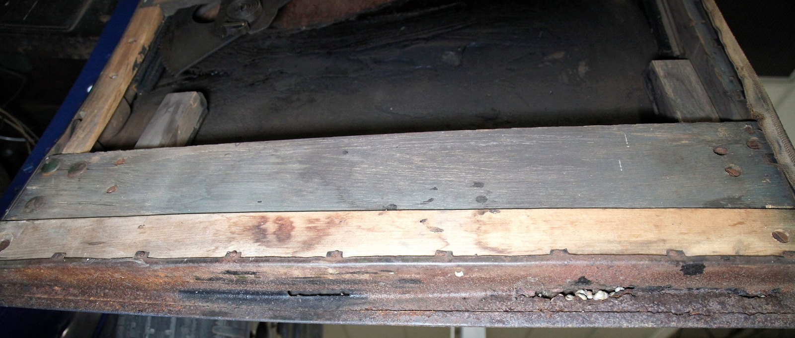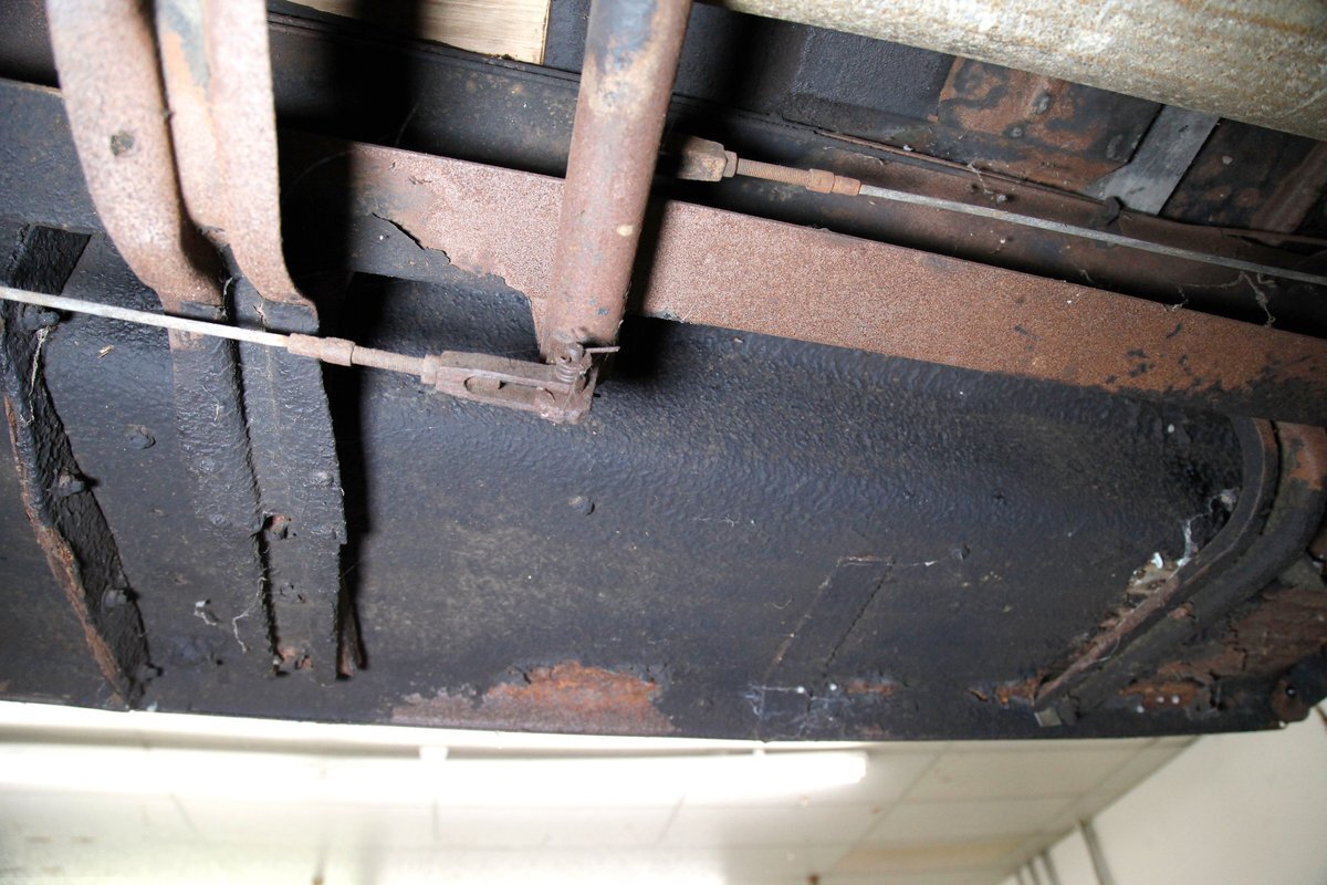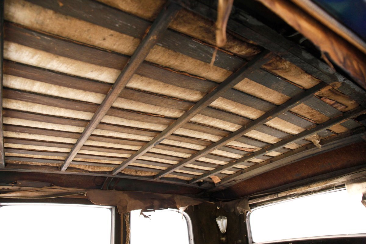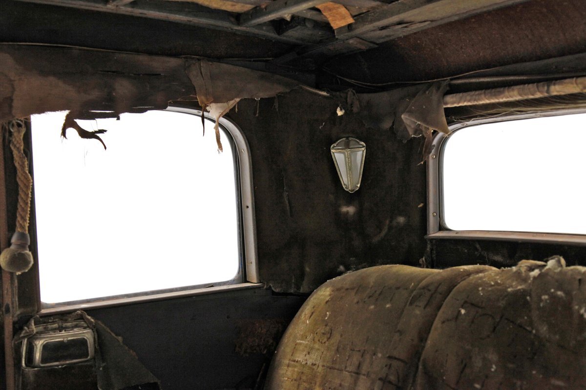 Uncovered door panels reveal the wood plank and metal construction of the era. Interesting to see how simply it was assembled and to visualize the inner workings. A saddle covered vinyl front bench sits in front of the dash, which replaces an original mohair front bench. In back is an original mohair bench which has long since rotted away and just a bit of the cloth is left with mostly stuffing and springs. If you look closely you can still see some of the luxury once surrounded by the pillar lighting corded pulls and massive leg room for the rear passengers. Rear doors give us a hint of the door panels which were covered in mohair. Wood lath covers the headliner which is the underside of the previously stated metal panel.