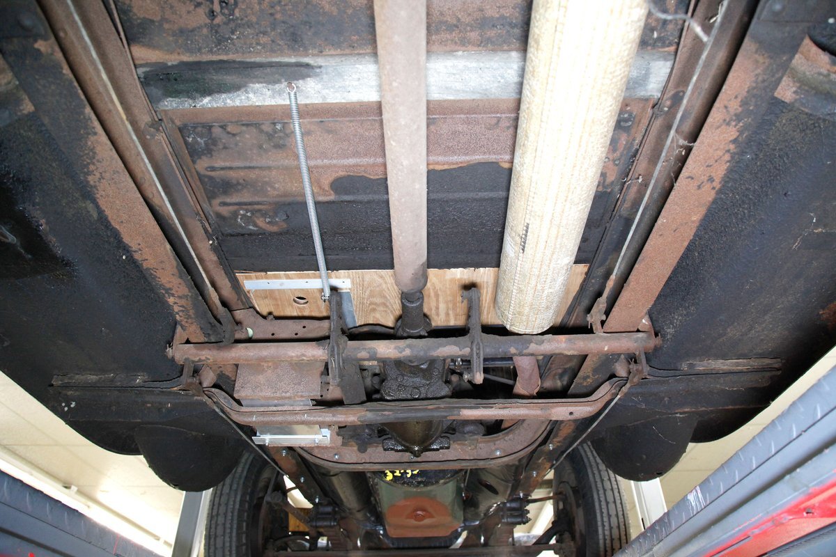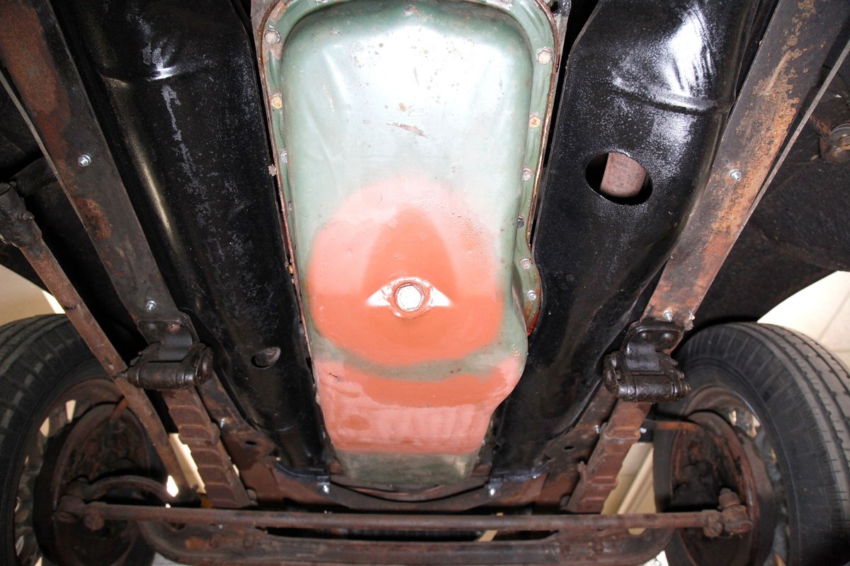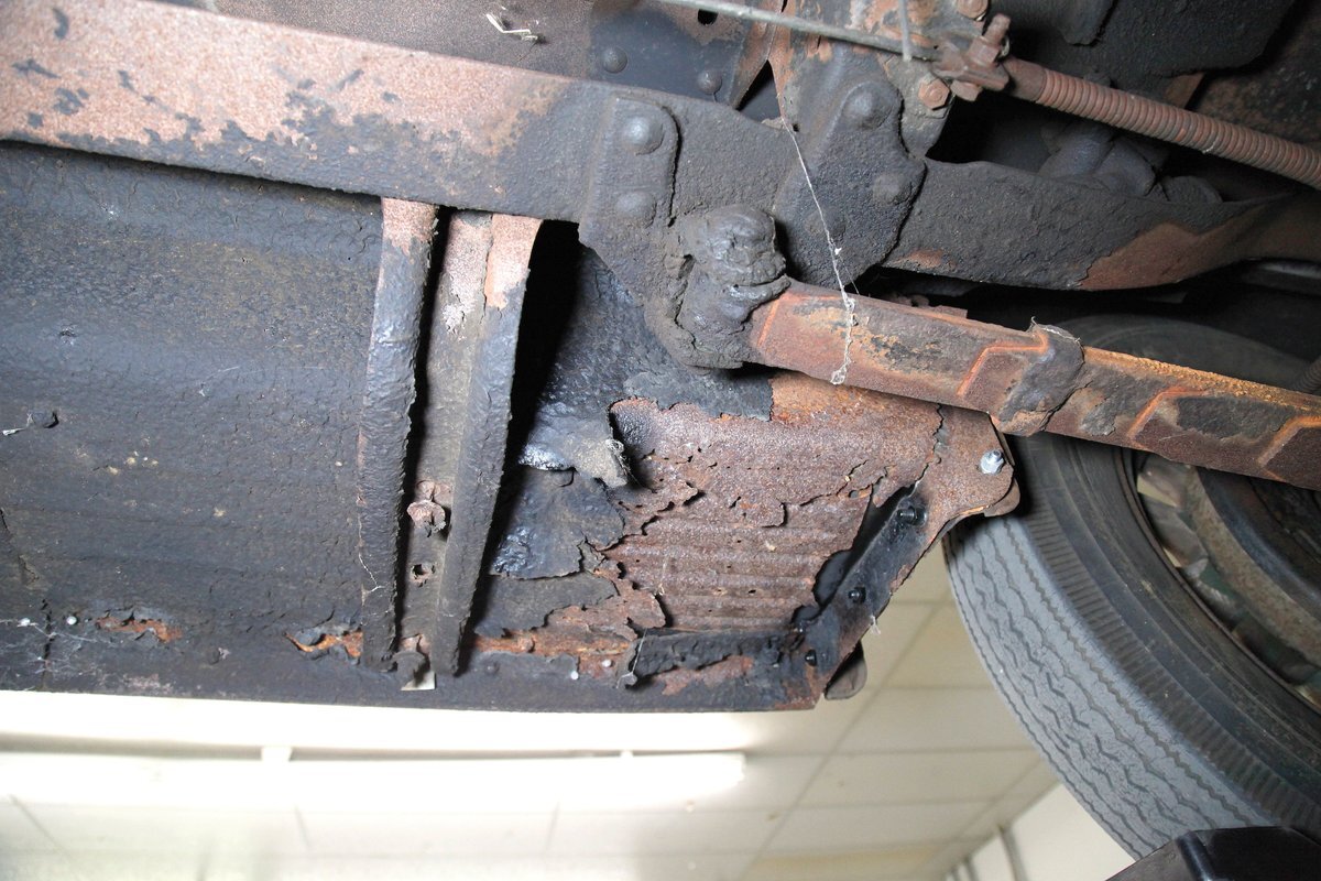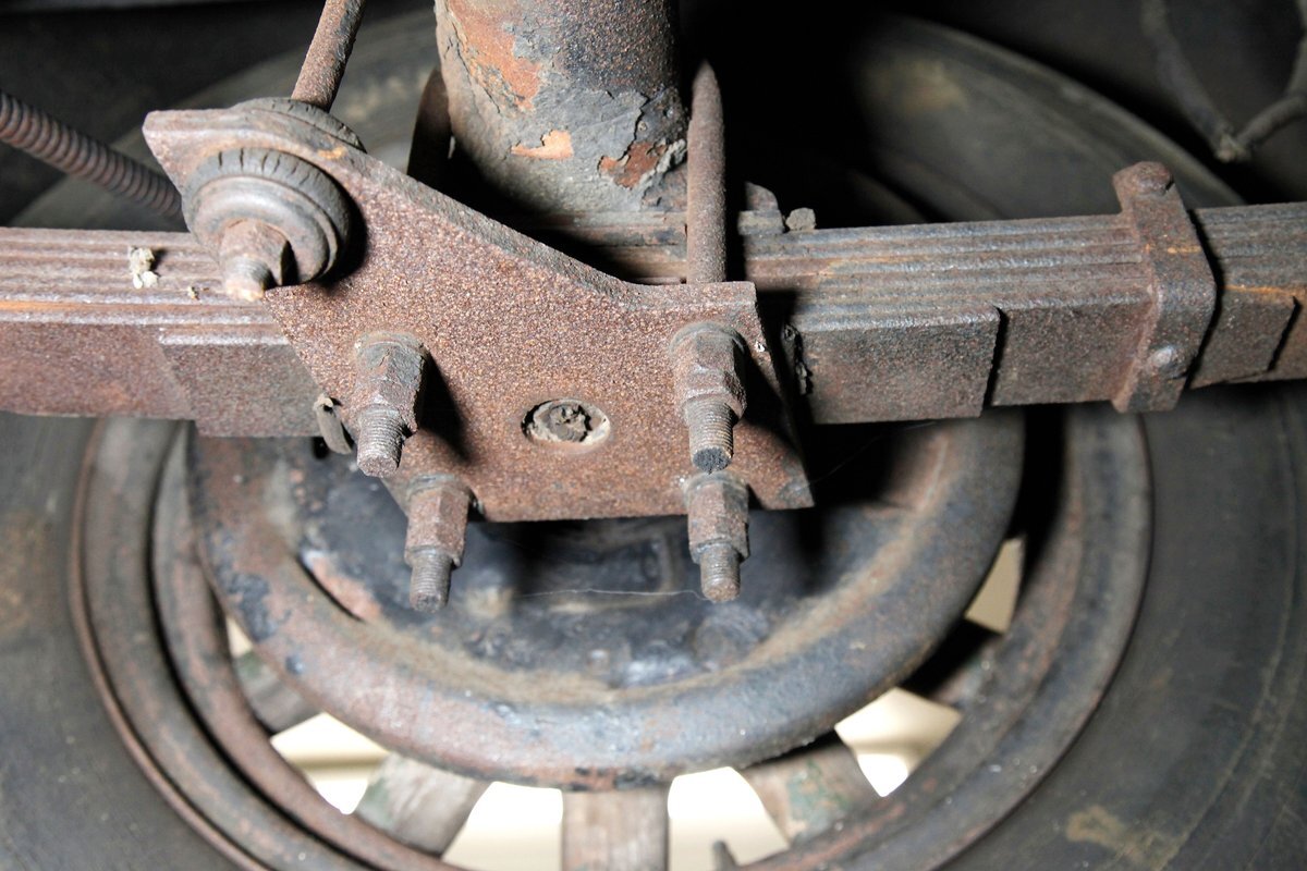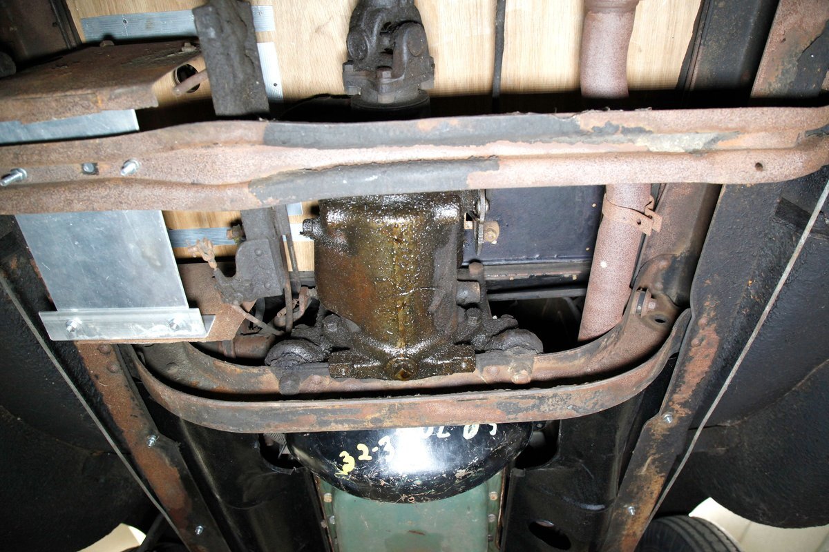 A coating of surface rust is seen on the frame and floor pans as well as suspension and rockers. There are a few small areas of invasive rust and former repairs to said rust, however, the car remains structurally sound. The running boards have been undercoated. Leaf springs and drum brakes are all around.