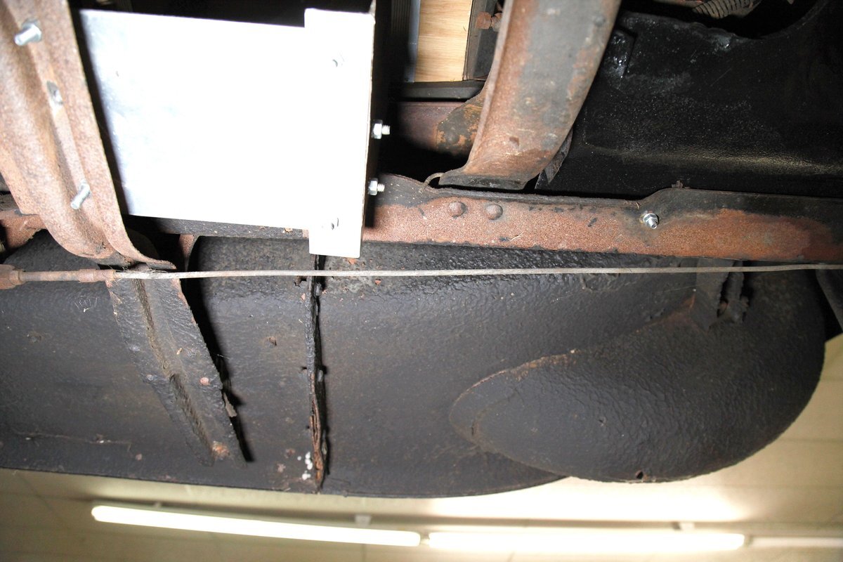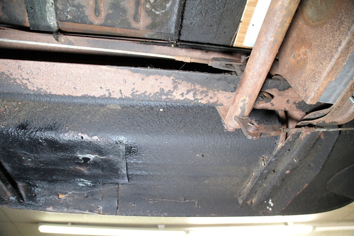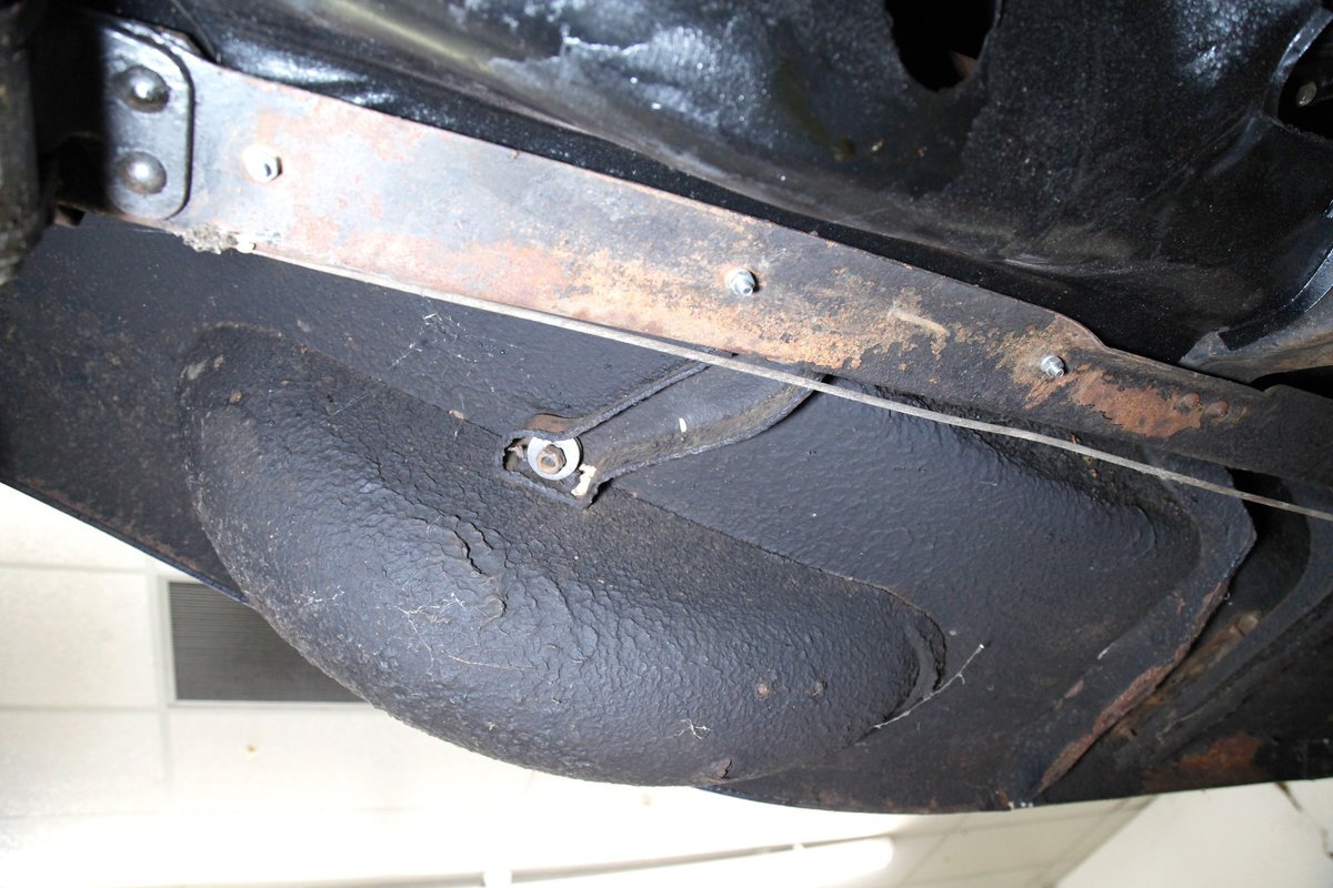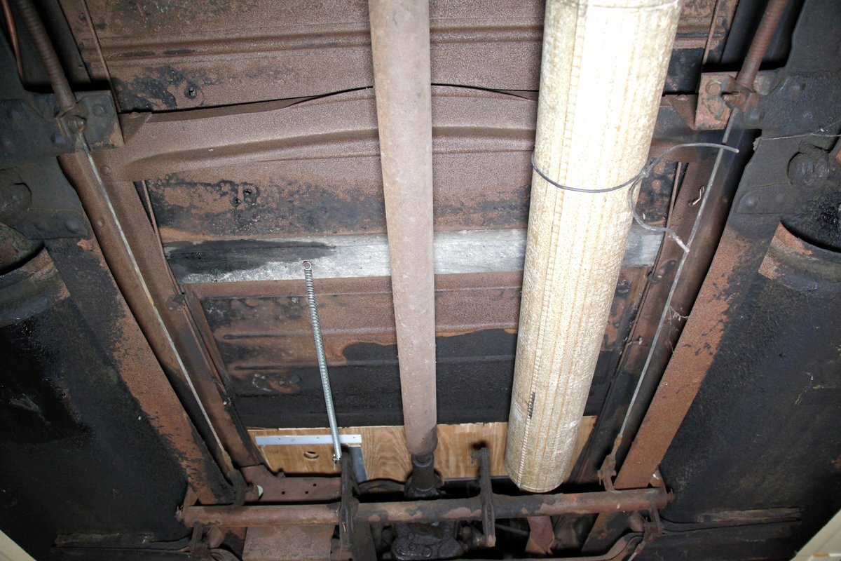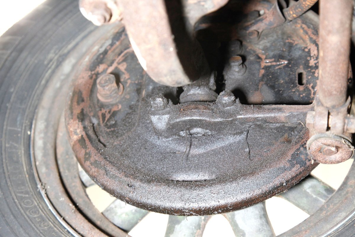 A coating of surface rust is seen on the frame and floor pans as well as suspension and rockers. There are a few small areas of invasive rust and former repairs to said rust, however, the car remains structurally sound. The running boards have been undercoated. Leaf springs and drum brakes are all around.