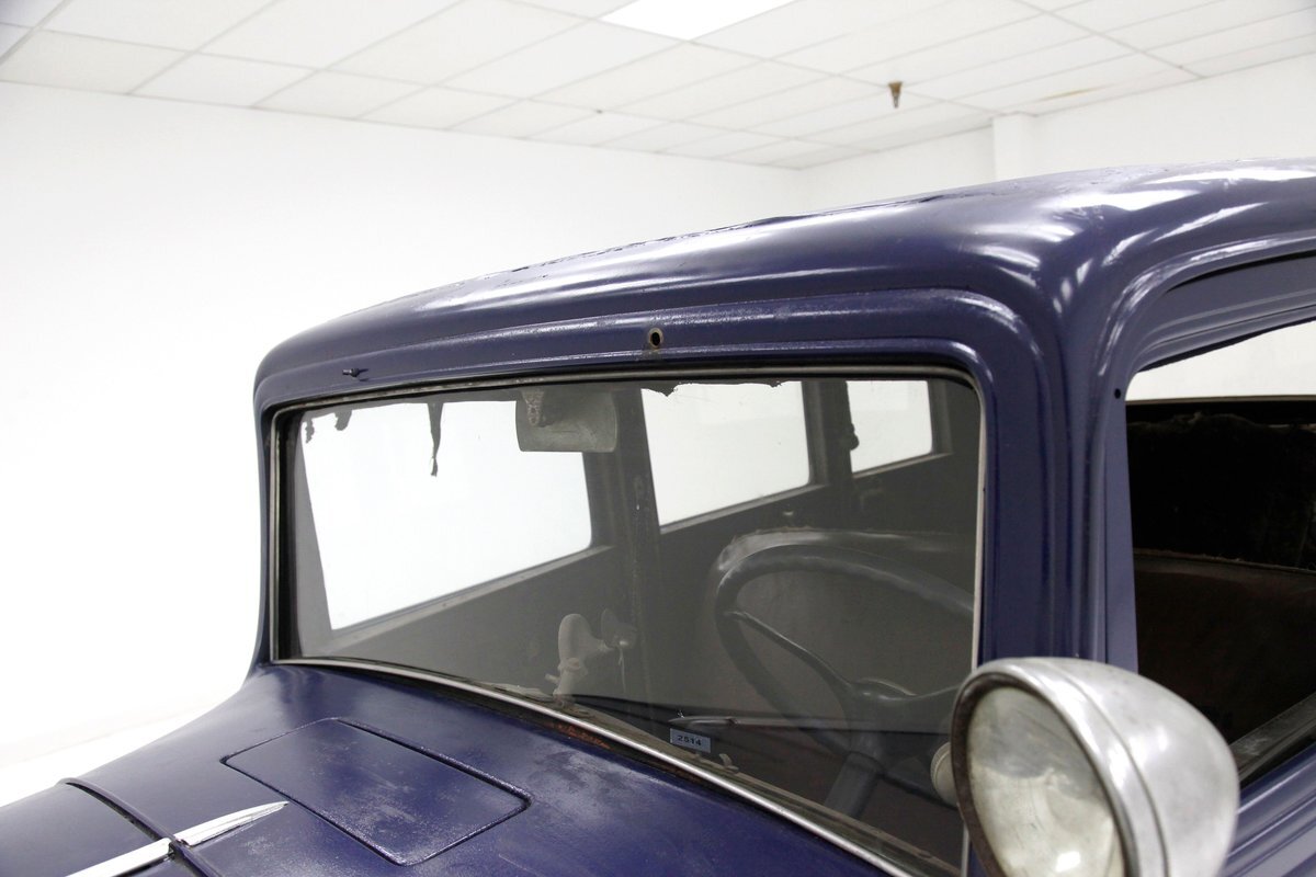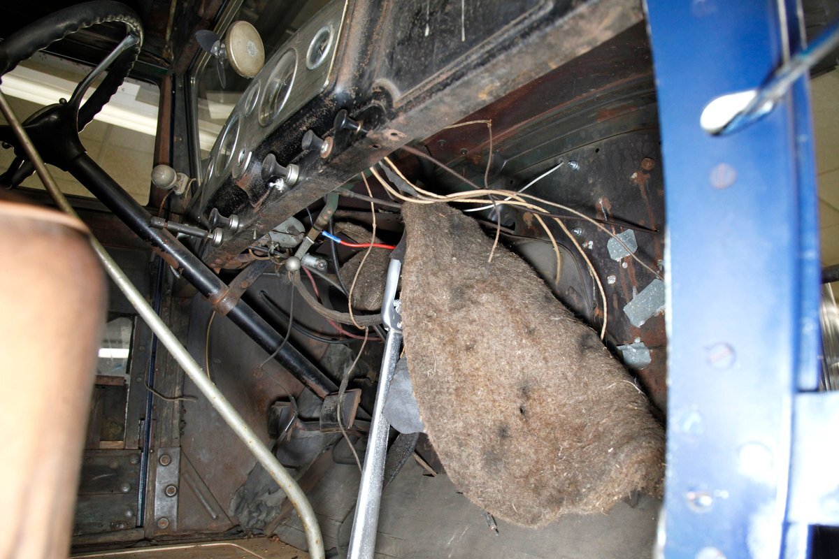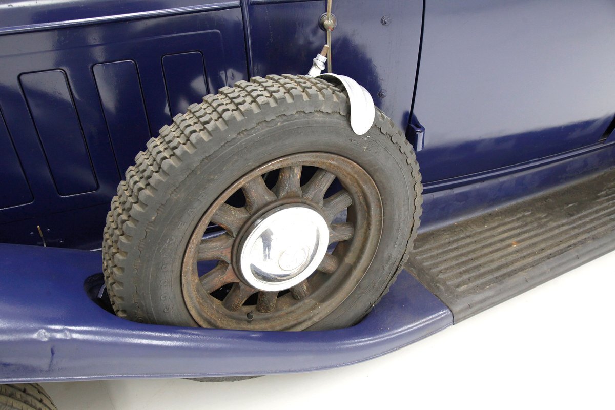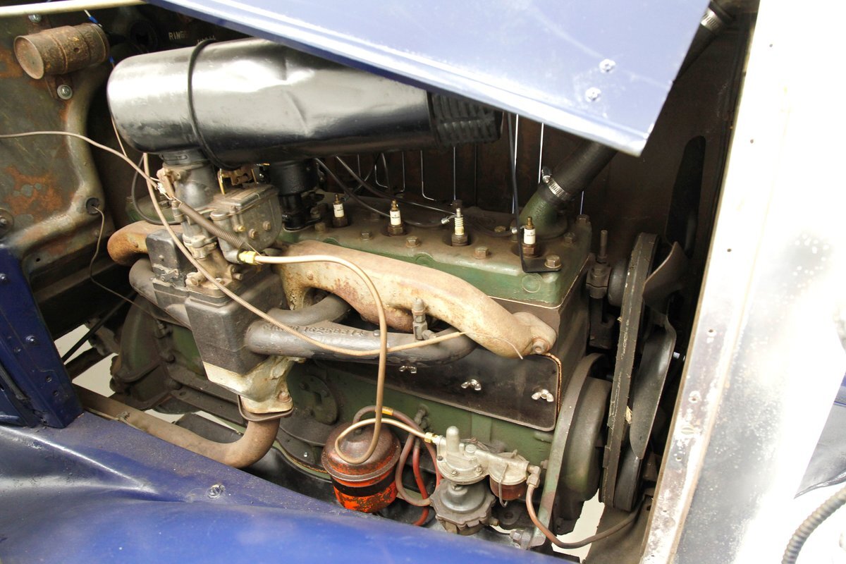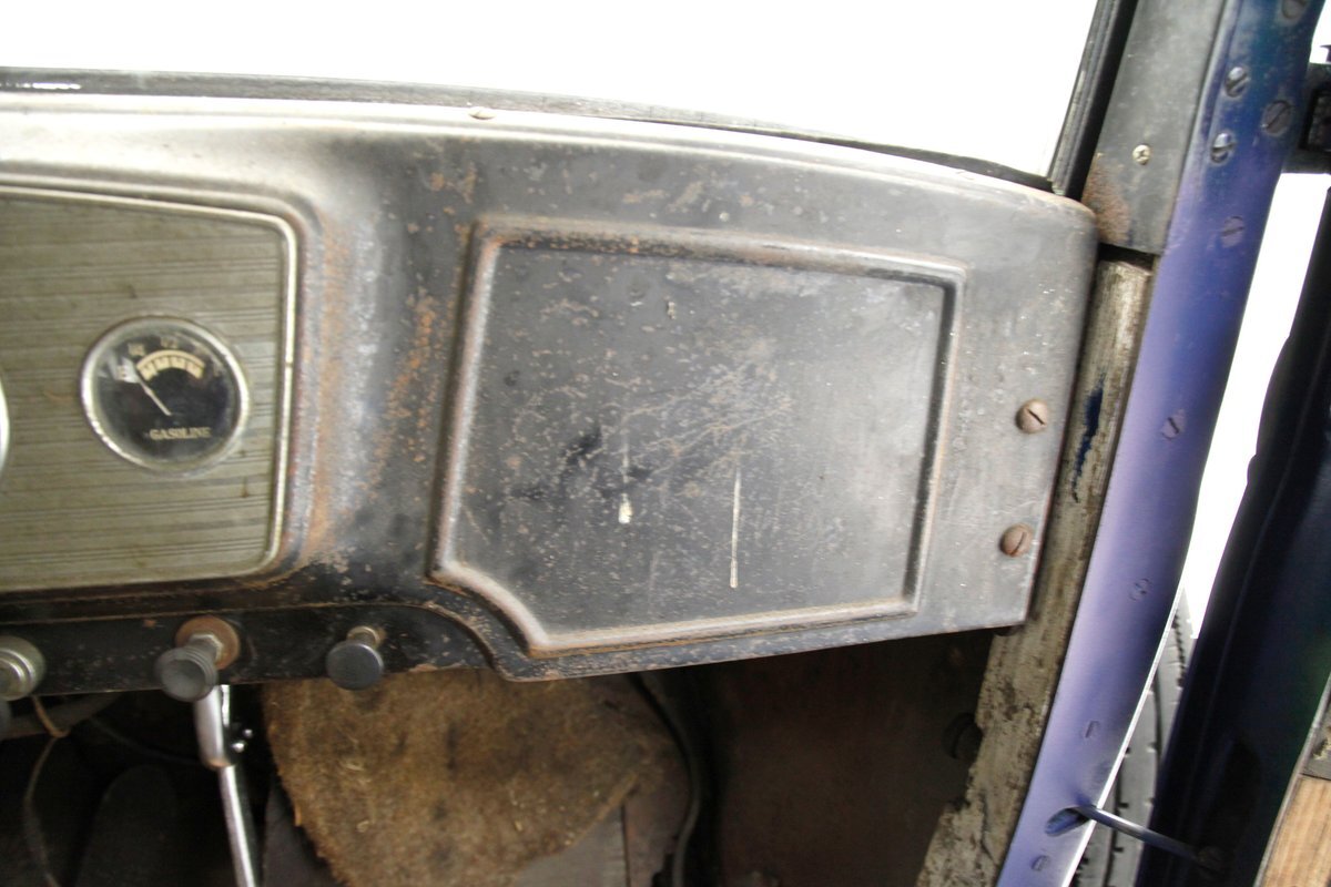 A dark blue respray that has been put on several years ago, bathes the metal on this 4 door car. Body panels show fairly straight with consistent gaps. The rounded exterior fenders have a few dents, and show extensive pitting from previous surface rust damage. Up front is a shield styled chrome surrounded radiator cover and grille in black. Flanking on either side are big round headlights holding on to each fender with a dual curved bar in chrome. On the bottom is a bumper stretching across the front and the condition of all this chrome is fair with dimpling, dulling,and pitting. As we move towards the passenger compartment, a single pane of windshield glass picks up where the hood ornament and cowl centerline leaves off. Doors are in decent condition with no pitting or rust and these utilize a central B pillar for their latches. Rounded fenders are sharing the edges of a running board on both sides. Some rust is noted where these running boards meet the rear fenders. On the back is a trunk rack in black which hovers just above the rear bumper. Taillights on metal stalks hang off of each rear fender on the edge. 17-inch wood spoked wheels and 2 spare tires are seen when moving around this car. It appears the typical canvas insert panel for the top has been replaced by sheet metal as one can witness the weld line encircling the panel on the roof.