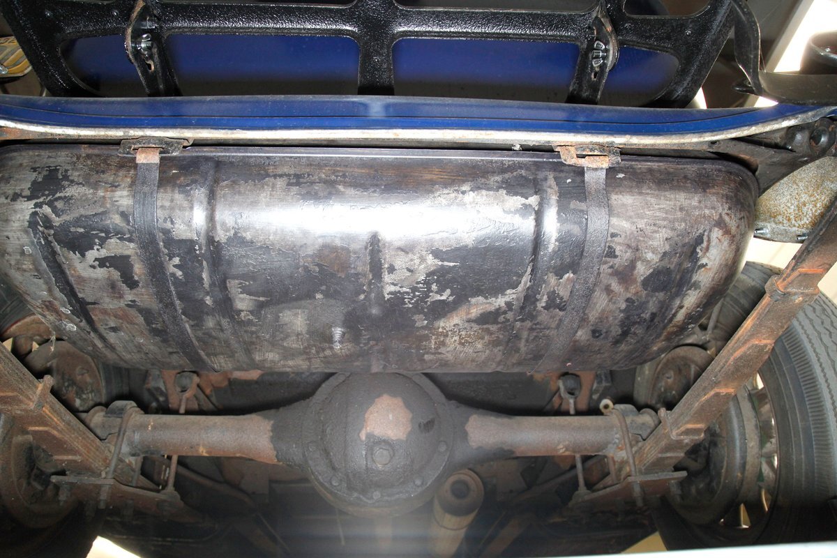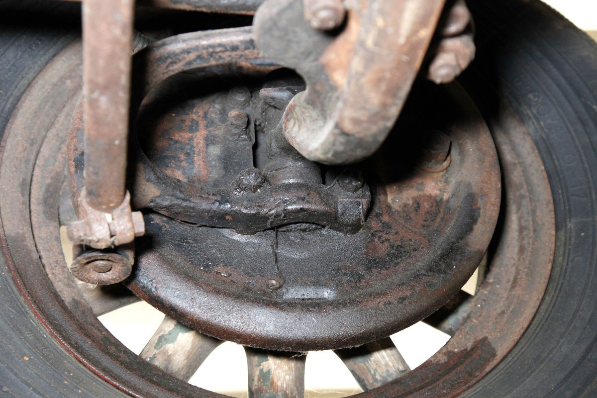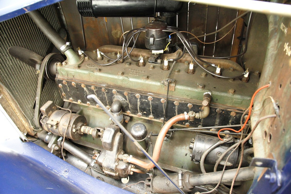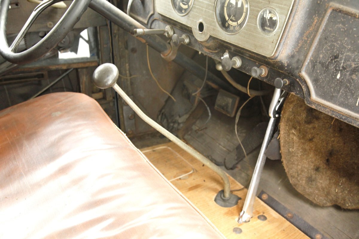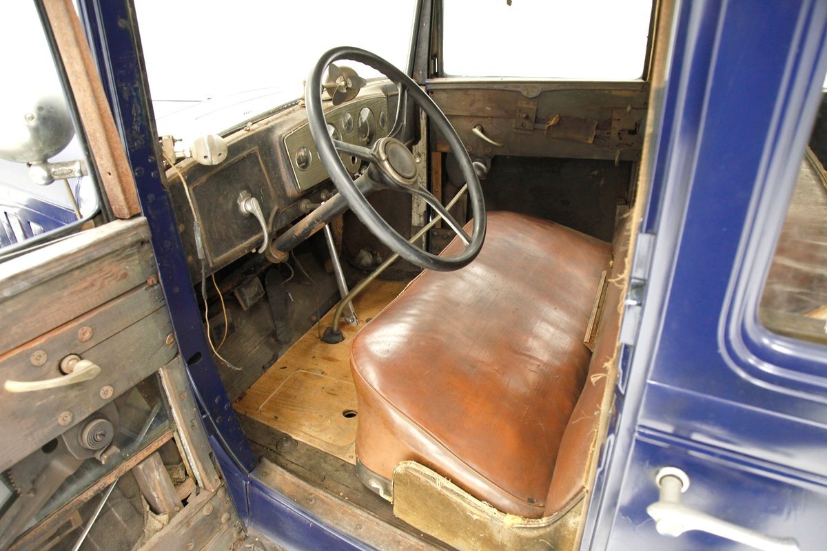 A dark blue respray that has been put on several years ago, bathes the metal on this 4 door car. Body panels show fairly straight with consistent gaps. The rounded exterior fenders have a few dents, and show extensive pitting from previous surface rust damage. Up front is a shield styled chrome surrounded radiator cover and grille in black. Flanking on either side are big round headlights holding on to each fender with a dual curved bar in chrome. On the bottom is a bumper stretching across the front and the condition of all this chrome is fair with dimpling, dulling,and pitting. As we move towards the passenger compartment, a single pane of windshield glass picks up where the hood ornament and cowl centerline leaves off. Doors are in decent condition with no pitting or rust and these utilize a central B pillar for their latches. Rounded fenders are sharing the edges of a running board on both sides. Some rust is noted where these running boards meet the rear fenders. On the back is a trunk rack in black which hovers just above the rear bumper. Taillights on metal stalks hang off of each rear fender on the edge. 17-inch wood spoked wheels and 2 spare tires are seen when moving around this car. It appears the typical canvas insert panel for the top has been replaced by sheet metal as one can witness the weld line encircling the panel on the roof.