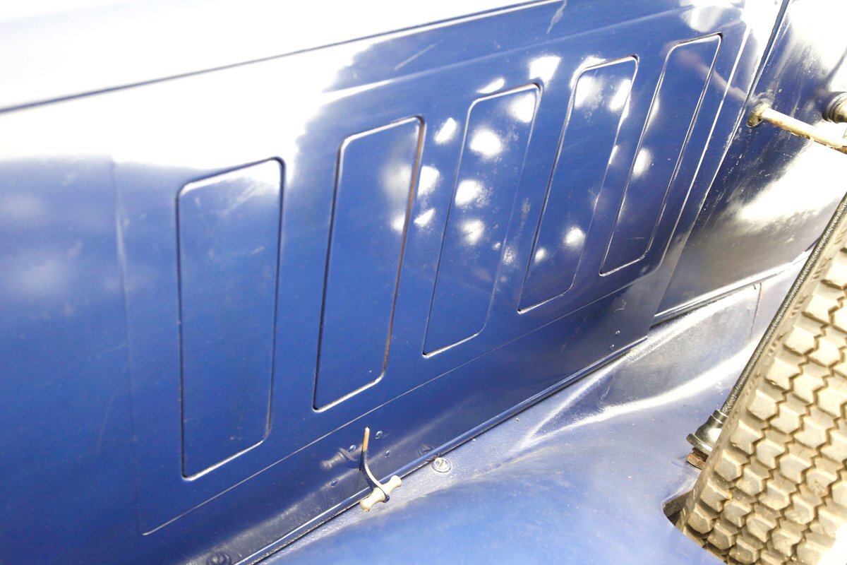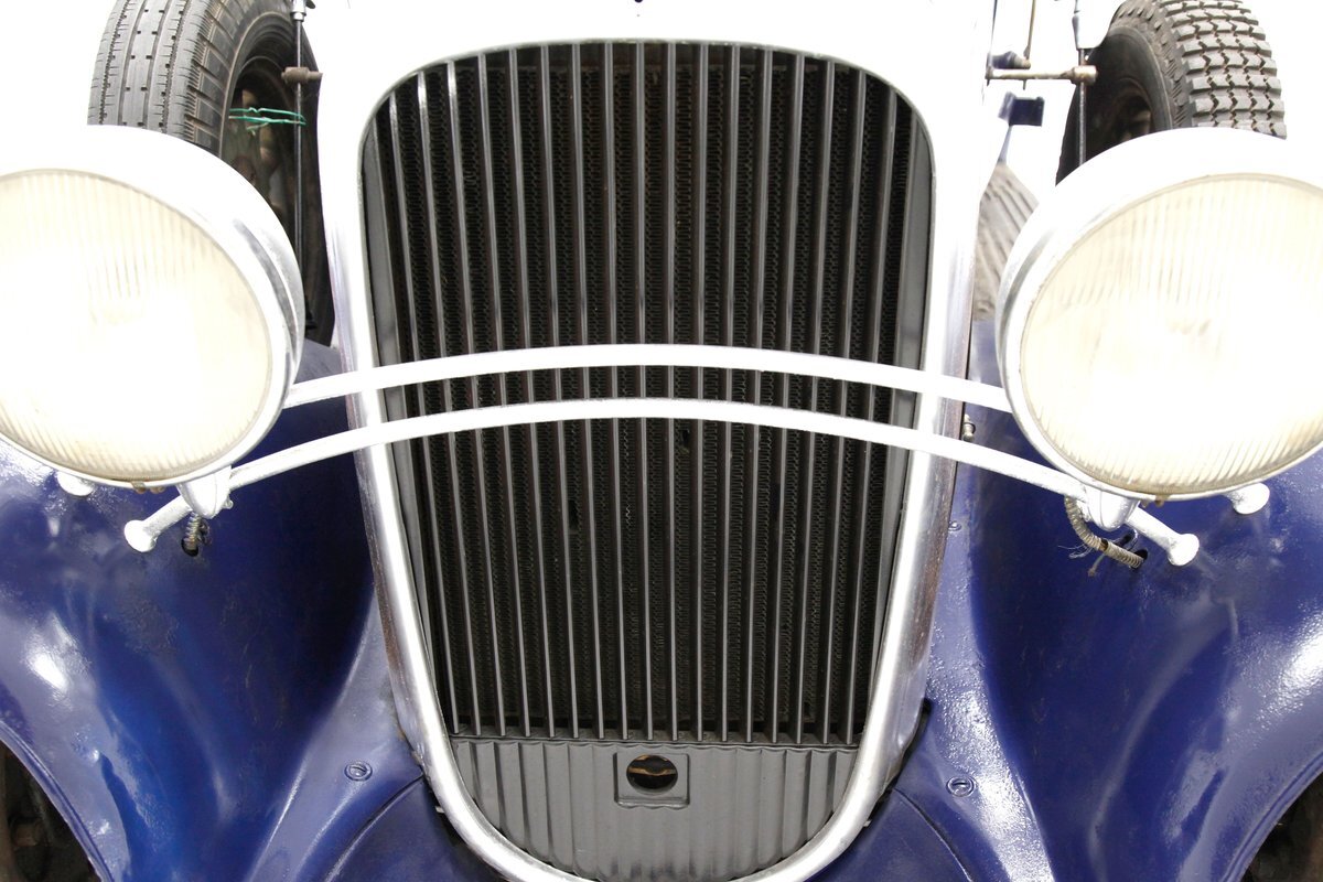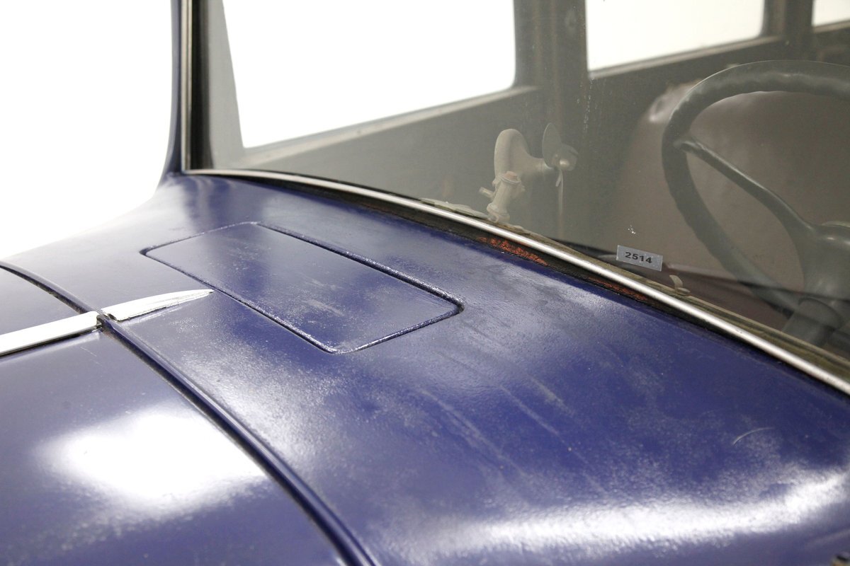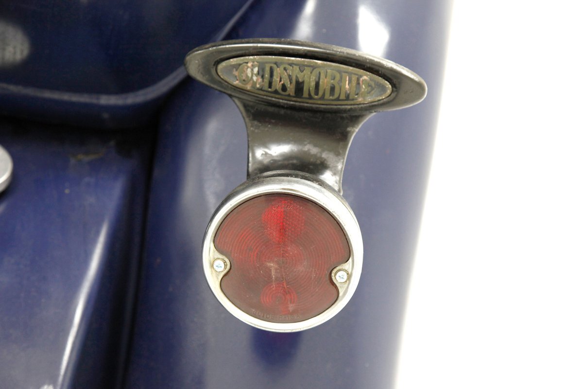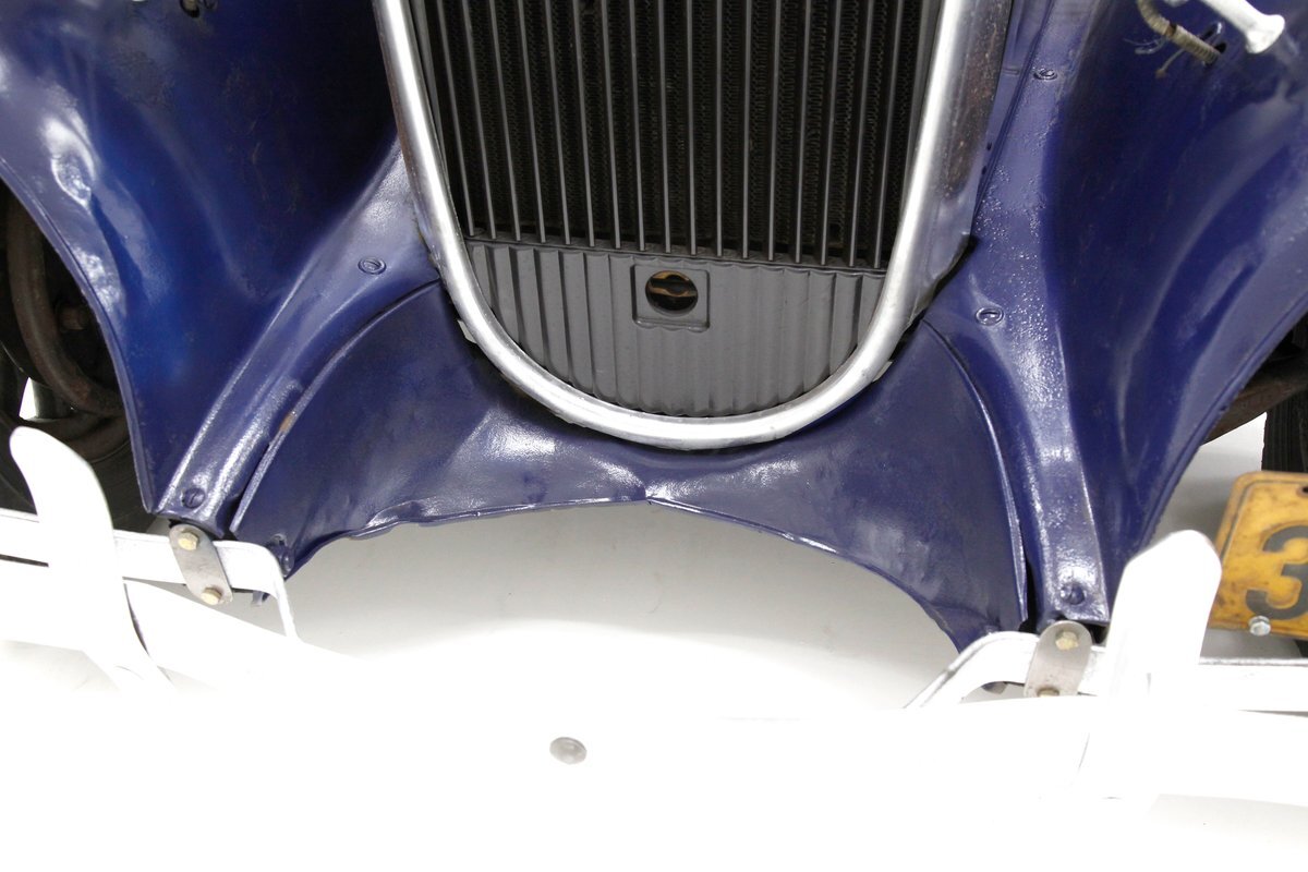 A dark blue respray that has been put on several years ago, bathes the metal on this 4 door car. Body panels show fairly straight with consistent gaps. The rounded exterior fenders have a few dents, and show extensive pitting from previous surface rust damage. Up front is a shield styled chrome surrounded radiator cover and grille in black. Flanking on either side are big round headlights holding on to each fender with a dual curved bar in chrome. On the bottom is a bumper stretching across the front and the condition of all this chrome is fair with dimpling, dulling,and pitting. As we move towards the passenger compartment, a single pane of windshield glass picks up where the hood ornament and cowl centerline leaves off. Doors are in decent condition with no pitting or rust and these utilize a central B pillar for their latches. Rounded fenders are sharing the edges of a running board on both sides. Some rust is noted where these running boards meet the rear fenders. On the back is a trunk rack in black which hovers just above the rear bumper. Taillights on metal stalks hang off of each rear fender on the edge. 17-inch wood spoked wheels and 2 spare tires are seen when moving around this car. It appears the typical canvas insert panel for the top has been replaced by sheet metal as one can witness the weld line encircling the panel on the roof.