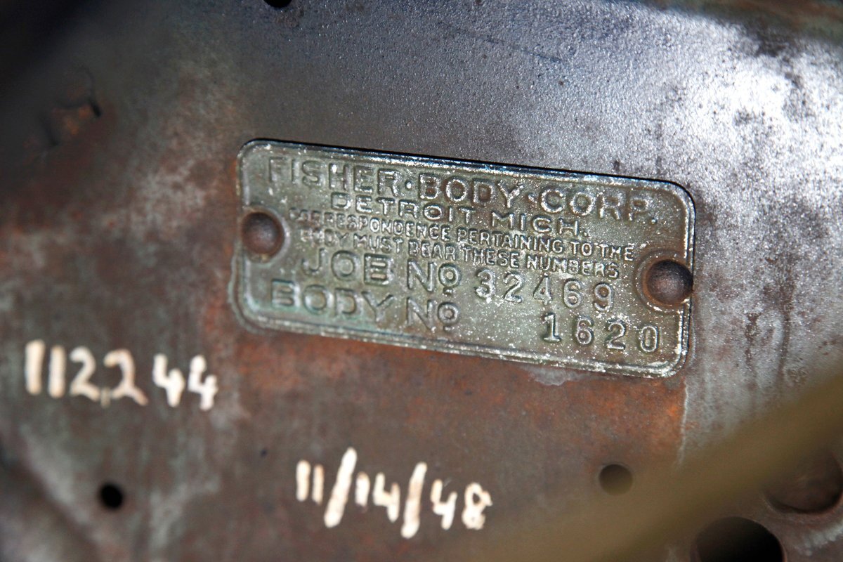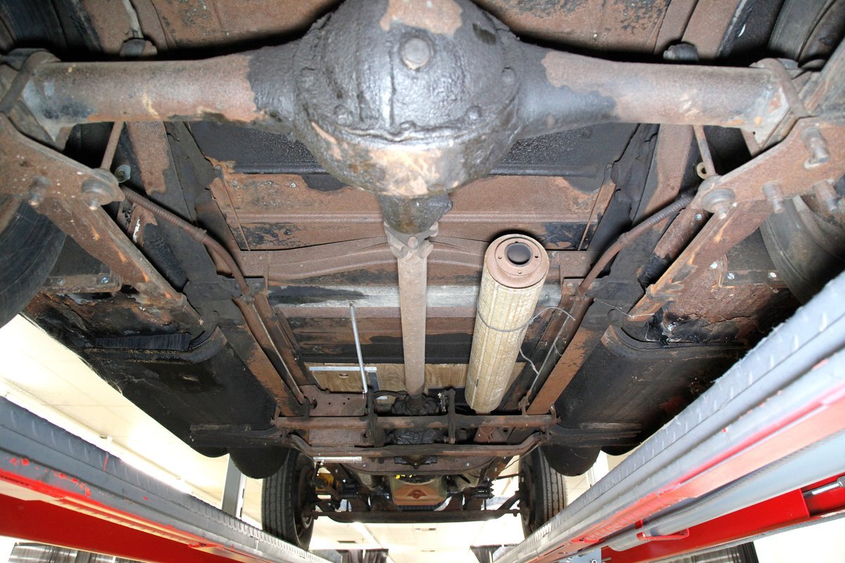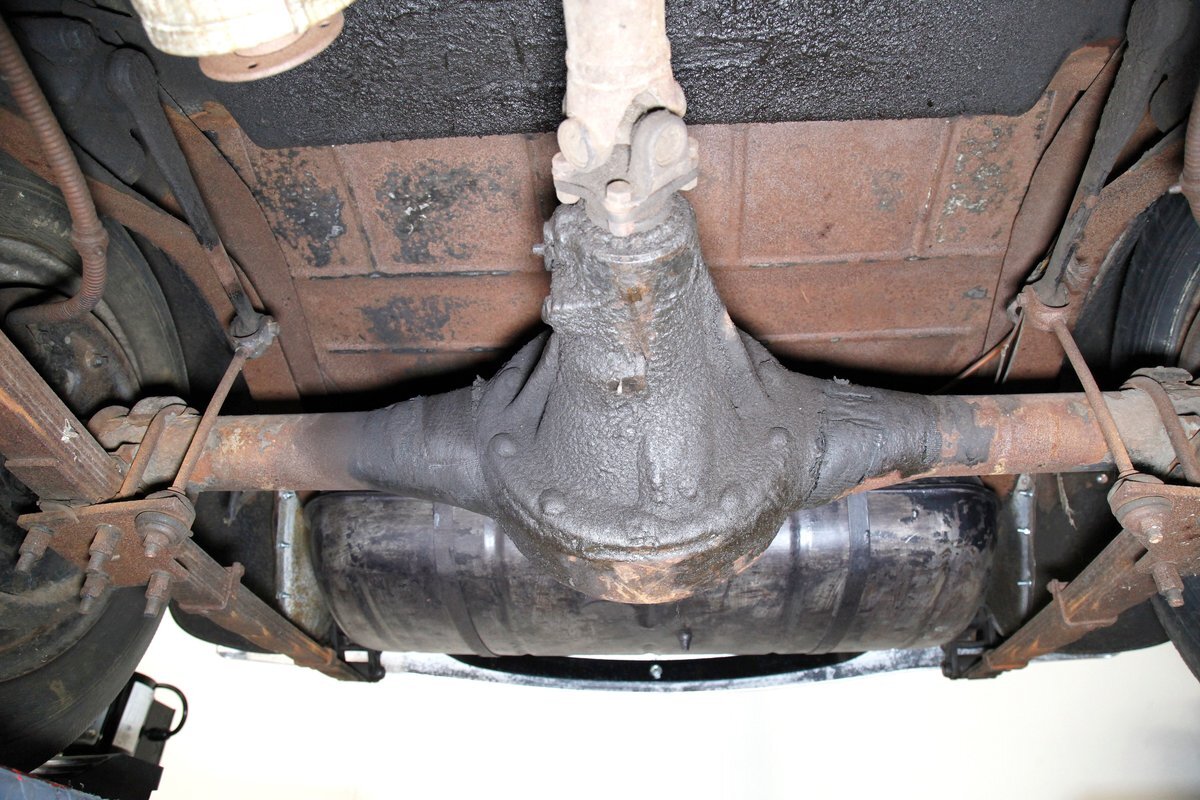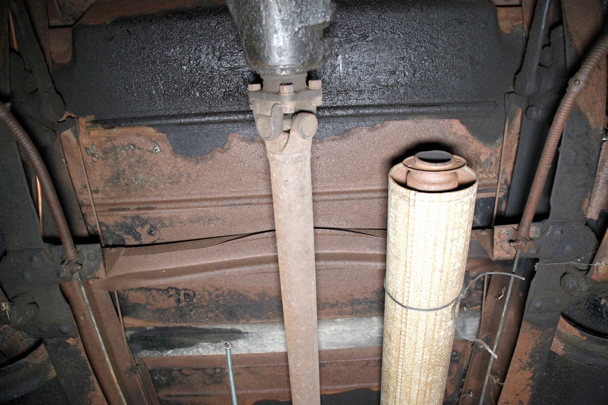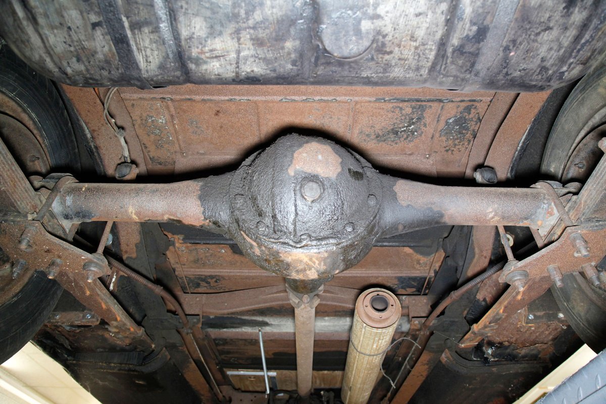 Under the large hood we see the factory specified 240ci inline 8 cylinder engine. This has plenty of surface rust and a 2-barrel carburetor on top. A 3 speed manual transmission is on back and turns the 4.56 geared rear axle.