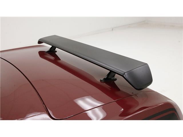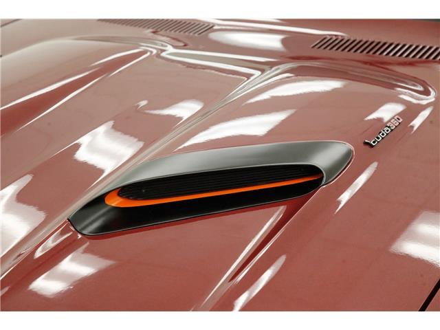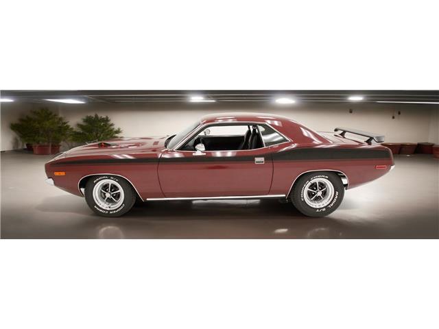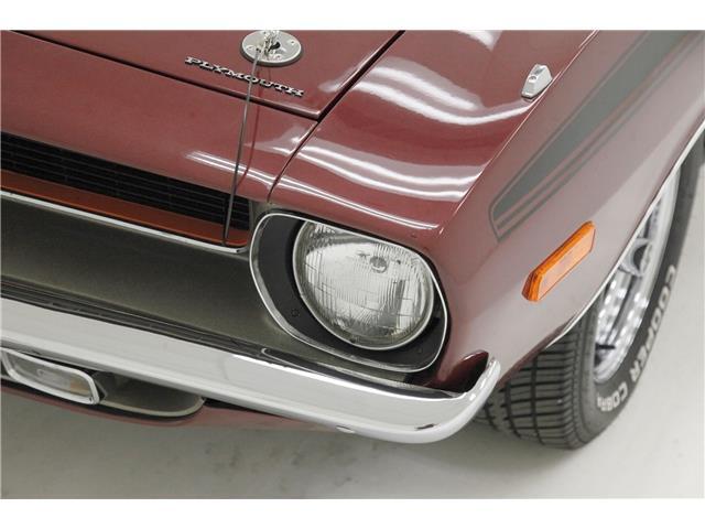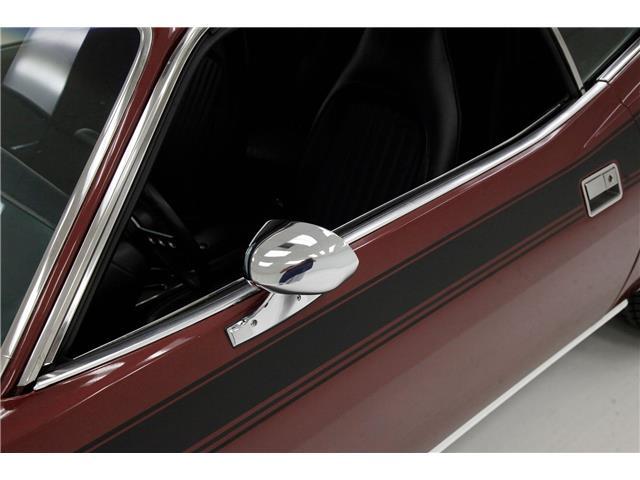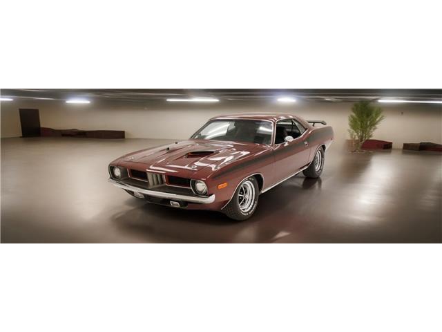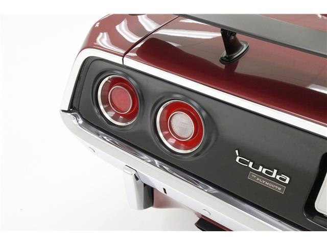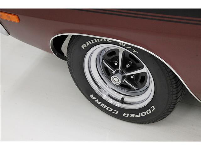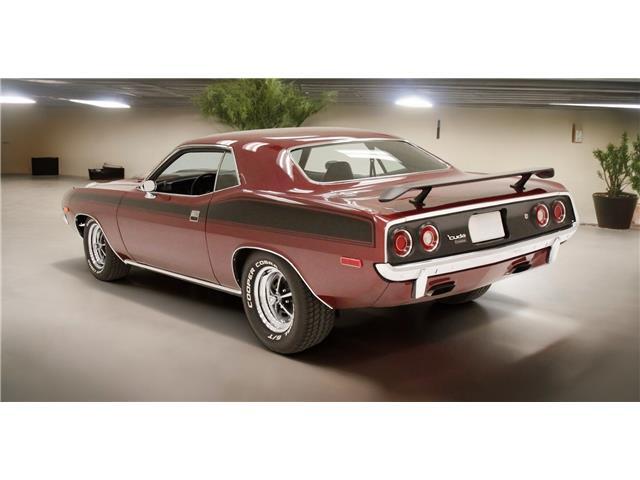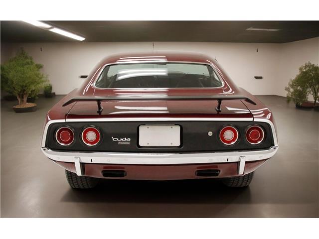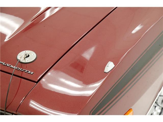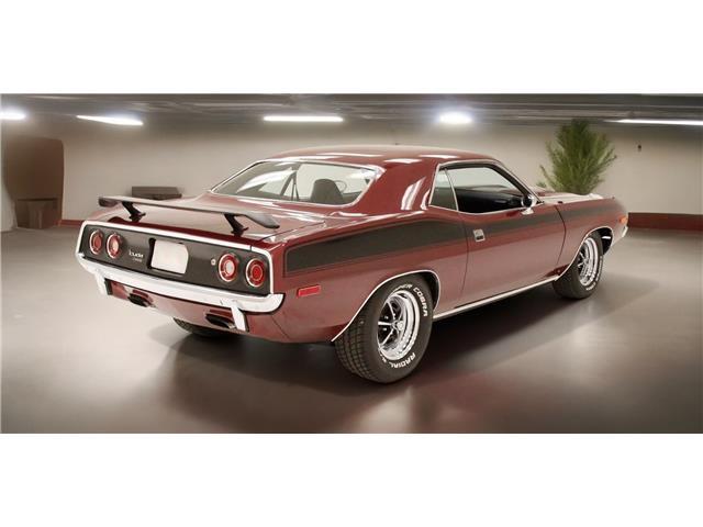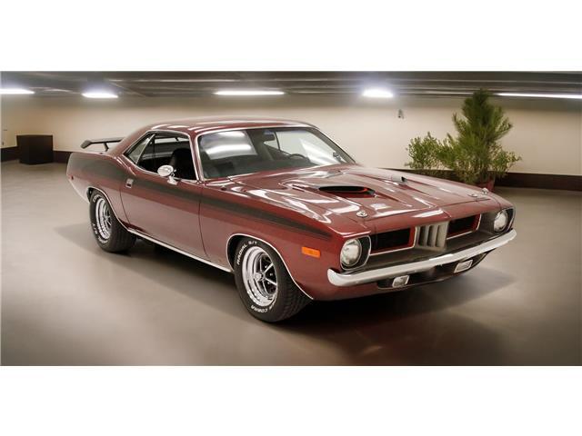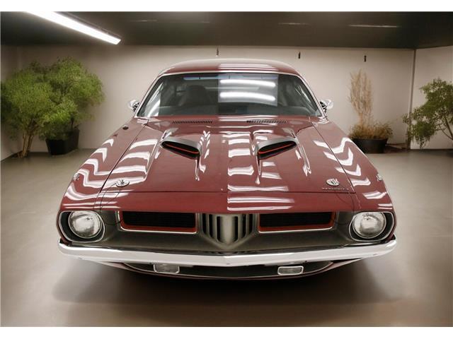 In front of the vehicle, a classic black satin grille with orange trims and silver surrounds, complemented by sleek headlights on each side, greet us with an intimidating expression. Positioned below the grille are signal markers within the lower air opening, enhanced by elegant chrome accents and a streamlined bumper. The top of the lamps is adorned with a sporty hood featuring a Burnished Red Metallic finish and matching hood pins. The hood extends towards a flawless stainless-framed windshield, with chrome sport mirrors on each side and well-aligned gaps throughout the rear quarter. The sleek design is further accentuated by the deep Burnished Red Metallic paint that covers the sides and doors. Moving towards the back, a classic black valance houses the recognizable Plymouth quad of round tail lights and a 'Cuda badge. The rear bumper is seamlessly integrated below the valance, while a Burnished Red Metallic rear roll panel with dual chrome-tipped exhaust outlets adds to the overall aesthetic. Additionally, a satin black rear spoiler sits atop the trunk lid, completing the polished look of the car. At all four corners, beautifully polished chrome and black 15-inch Magnum 500 wheels are wrapped in 235/60R15 tires in the front and larger 275/60R15 tires in the rear.