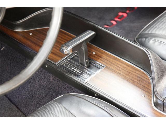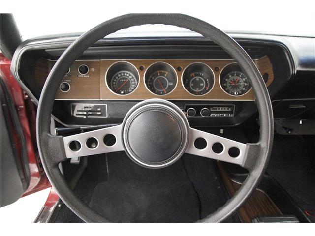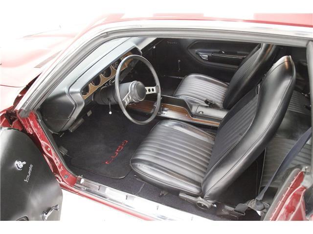 The vehicle showcases high-quality door panels made of black molded vinyl in a showroom fashion, exuding a seamless appearance complemented by chrome 'Cuda badges. The interior also boasts two slim black vinyl high back bucket seats from the 1970s, equipped with integrated headrests, tuck and roll pattern inserts, and sleek bolsters. The rear bench seat upholds the same stylish design, presenting a nearly flawless finish. The entire interior is adorned with jet black carpeting, paired with 'Cuda red embroidered floor mats, creating a serene atmosphere. The dashboard has been meticulously restored, featuring a lineup of rally gauges set within a wood applique panel and a black padded dash top. Connecting the front seats is a center console in black vinyl and wood applique, showcasing a correct T-handle topped "Slap Stick" shifter knob. Completing the vintage aesthetic is a black-rimmed two-spoke drilled wheel with a design reminiscent of the "Michelin Man." Above this nostalgic display is a snug black vinyl headliner, adding a finishing touch to the overall 1970s theme.