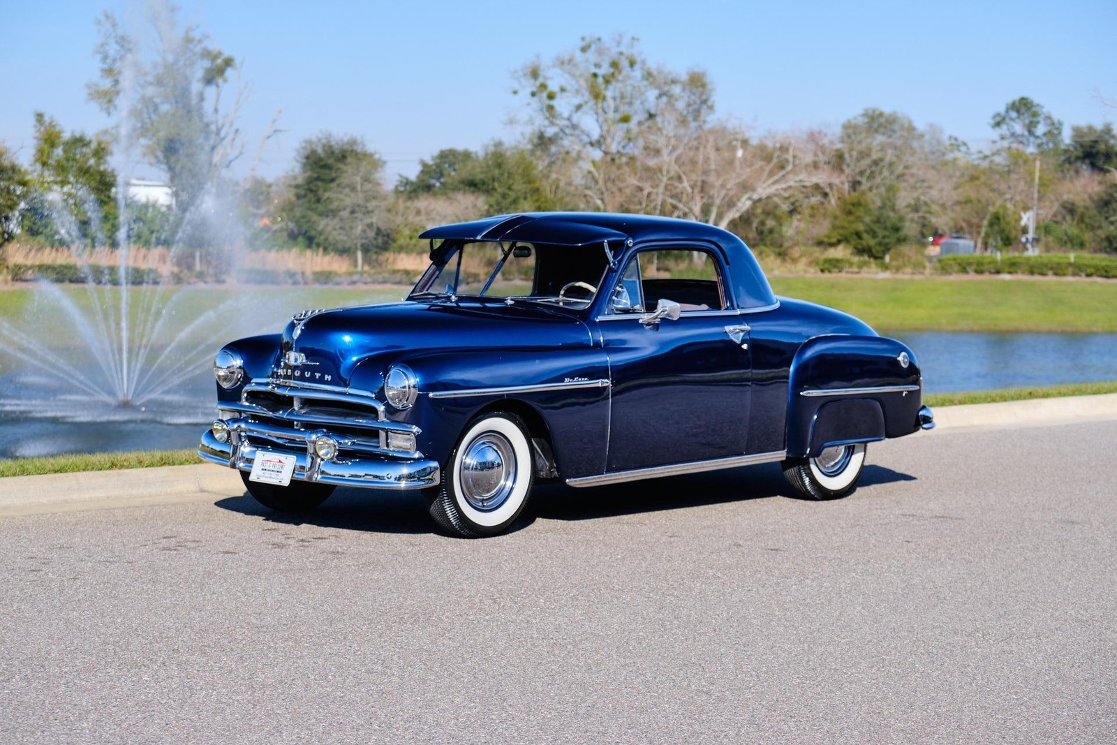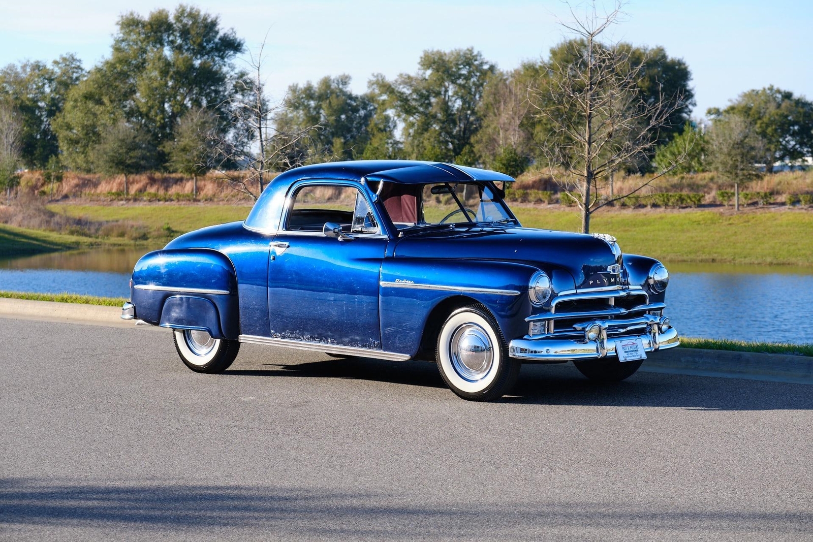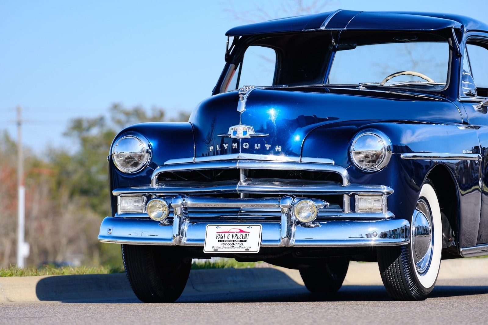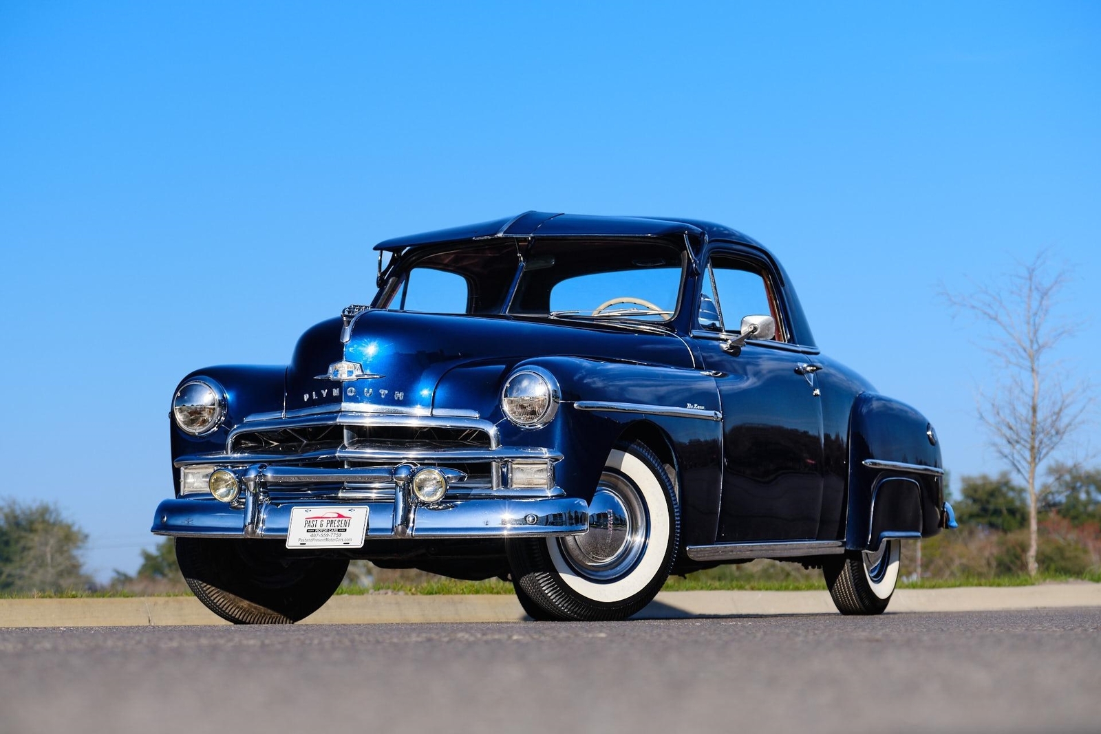 1950 Plymouth Business Coupe, The Plymouth P20 platform was introduced for the 1950 model year. The business coupe was a trim level, powered by an Inline 6 engine L-Head. Displacement: 217.8 cu in. 3.6 L. Power: 97 HP @ 3600 RPM. Bore: 3.3 inch. Stroke: 4.4 in Compression: 7.0:1 Main Bearings: 4 Cylinder Block: Cast-iron, Factory carburetor was a Carter BB-D6H1 1-barrel carburetor. Very original engine & parts including oil bath air cleaner. 3 speed manual transmission. Paint and body - older paint job which is actually 1949 New Brunswick Blue code 606 with a handful of metallic thrown in to give her a nice glow. Very good condition wide mouth 3 horizontal piece chrome grill with running lights tastefully placed. Straight lines, great gaps, Correct trim pieces and emblems. Split front windshield, dual wipers. Exterior Sun visor across the top of the front windshield, is not only functional, but creates an iconic antique look. Fender skirts, nice stainless steel rocker panels, both front and rear bumpers have chrome bumper guards. Interior - absolutely stunning real wood grain gauge cluster and dash. Burgundy and Gray two-tone seats and door panels. Carpeting and headliner are in very good condition. All the interior knobs crank handles, etc. are in good condition. Beautiful large three spoke Ebony, steering wheel with woodgrain surround around the horn button with the Plymouth logo. Factory original chrome push button AM radio. Factory original clock. Functional placement of the interior controls plus a very plush luxury looking interior. Steel rims are painted to match the color of the car. Beautiful chrome, beauty ring. “Moon” hub caps. Wide white wall radial tires. The spare is a matching wheel and tire to the four wheels on the car. No driving around with a strange looking doughnut spare for a flat repair. While we do our best to provide the highest quality muscle cars with an honest and reliable description and realize the importance of transparency when selling vehicles. That being said, we have not built, modified, changed or personally owned this vehicle. Whether this vehicle is consigned or owned by Past & Present Motor Cars we do not know the vehicles complete history since new. We want to be clear and try to answer any questions our customers might have prior to purchasing. Additionally, we not only welcome but we encourage 3rd party independent inspections. Please inquire prior to purchase to make sure the advertised vehicle has not already been sold. We list our vehicles on multiple websites and a vehicle can sell at any time. If a customer chooses to purchase sight unseen (many of our customers choose this option) the customer accepts the vehicle AS IS and WHERE IS and understands we cannot address concerns after purchase. For this reason, it's important all concerns are addressed prior to purchase. We make every effort to present accurate and reliable information, but use of this information is voluntary, and should only be deemed reliable after an independent review of its accuracy, completeness, and timeliness. It is the sole responsibility of the customer to verify the existence of options, accessories and the vehicle condition before time of sale. Financing is Available with low rates and Vehicle Shipping is available from our Showroom to your Garage. A Classic Car Warranty is Available for Purchase from a 3rd Party. Please speak to our Sales Associate or Company Representative for more information. Our team is working and available anytime by Phone or Text for your convenience at407-559-7759. Thank you for your interest!