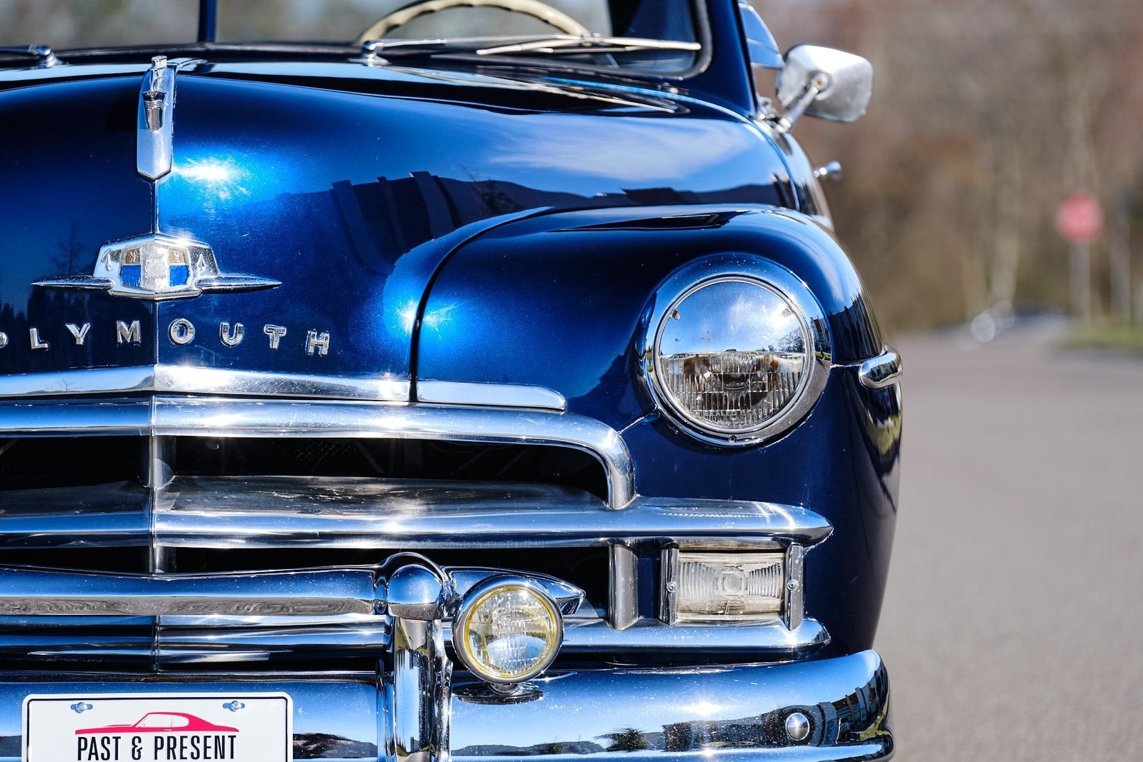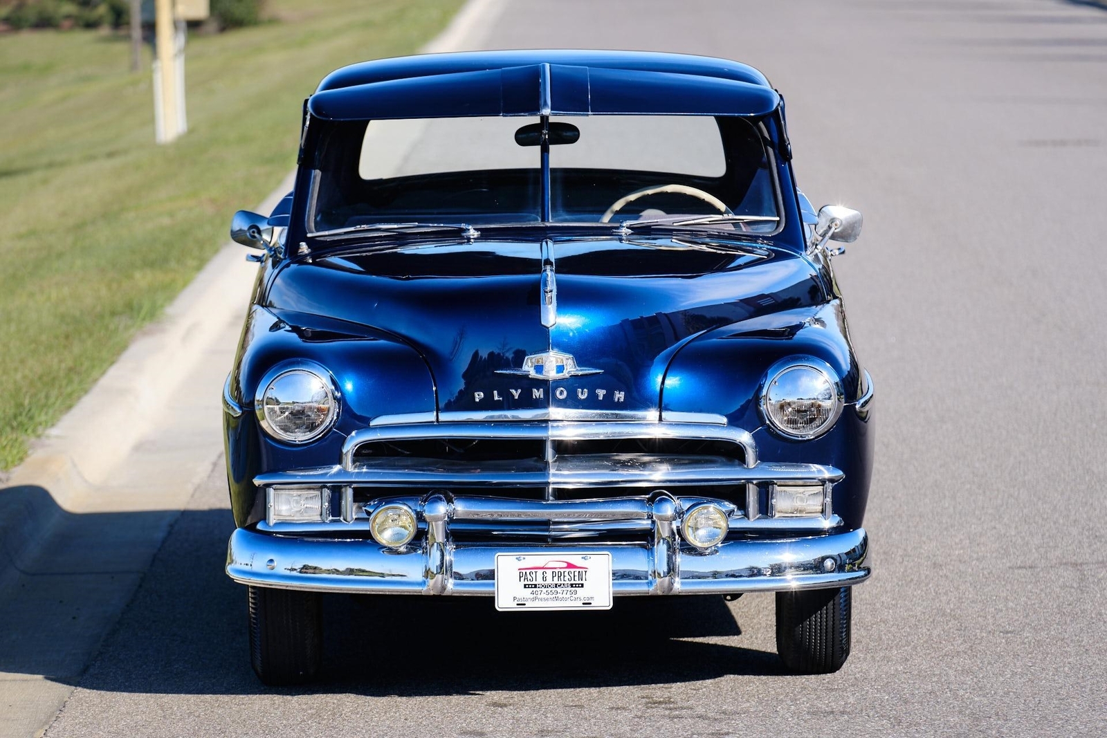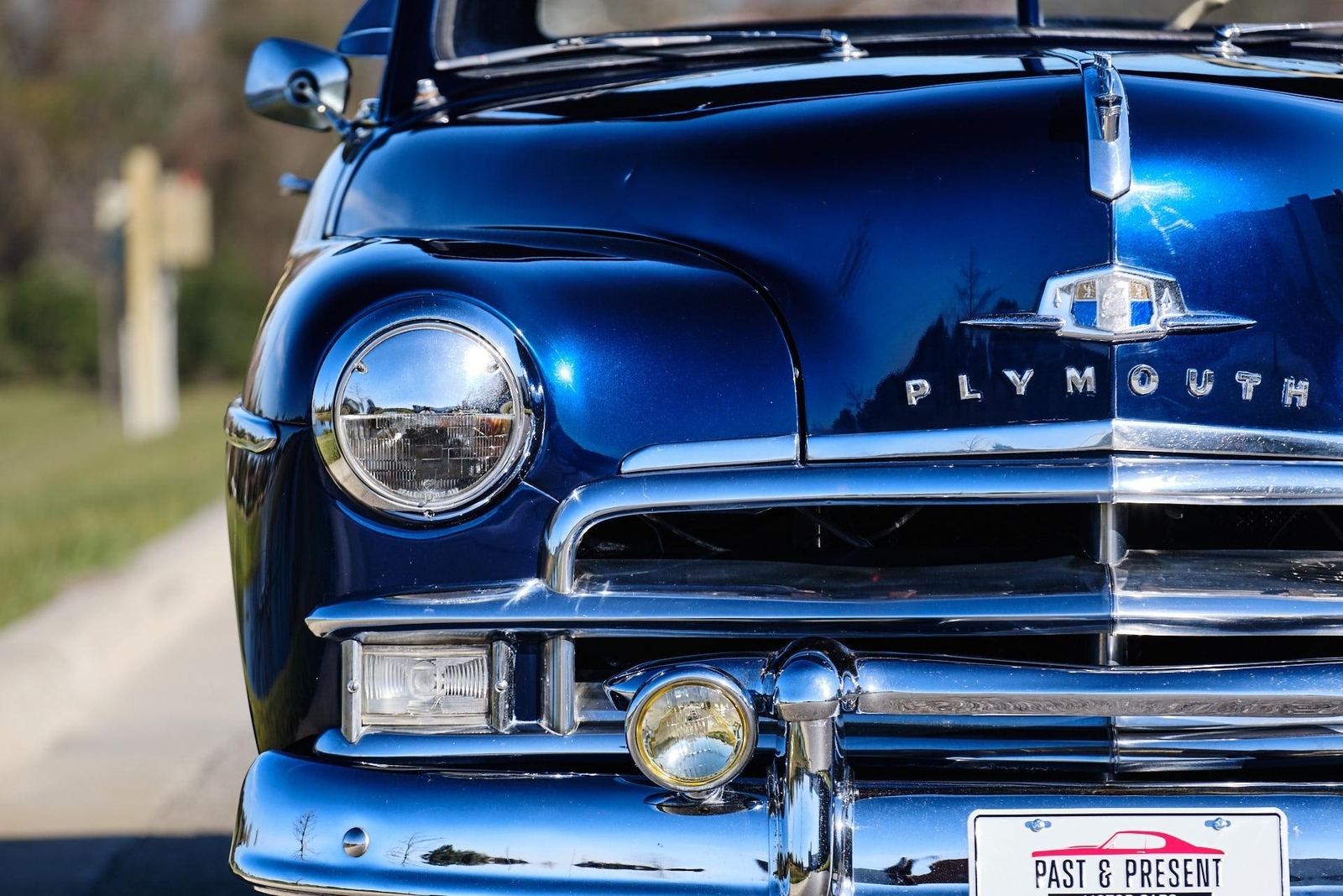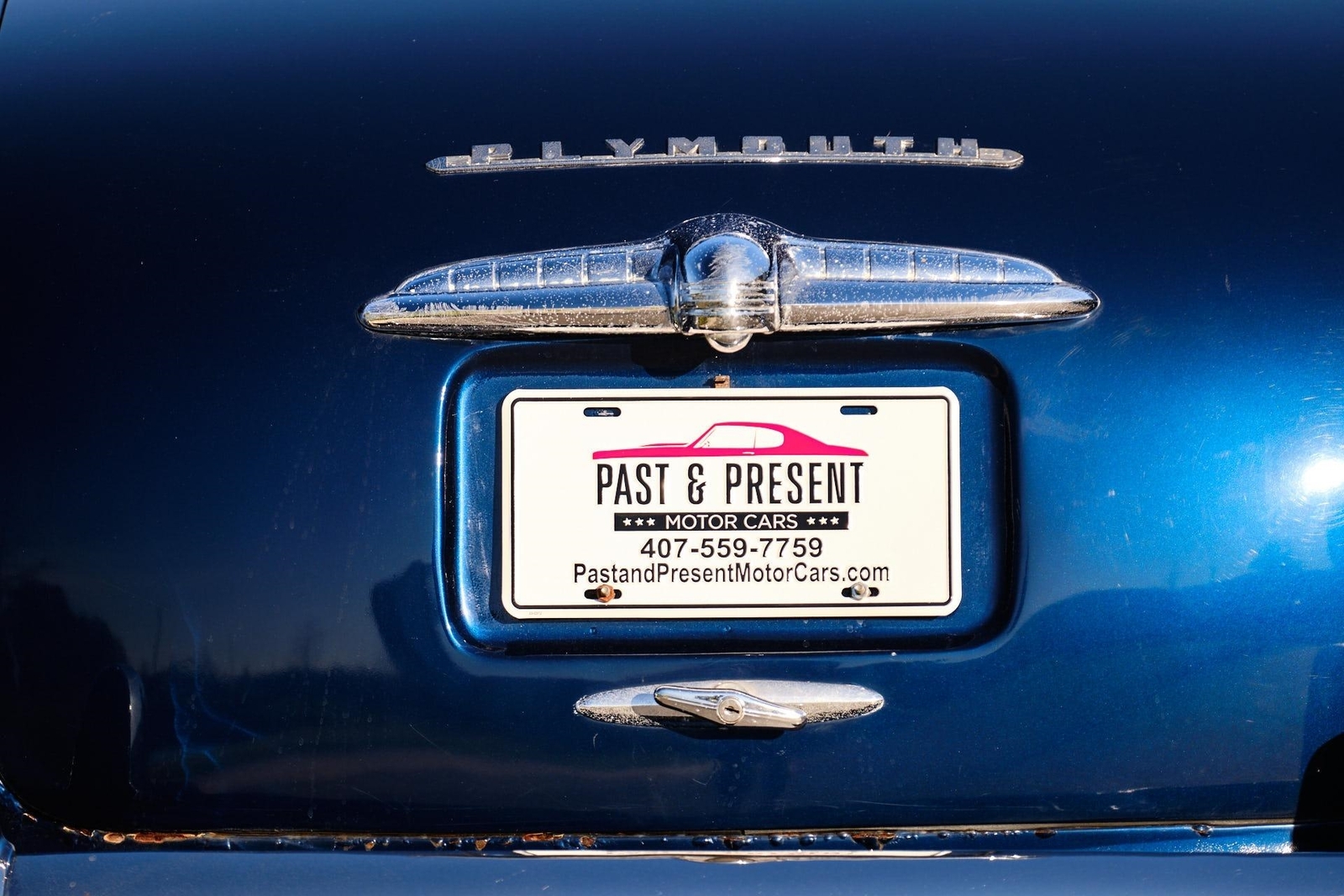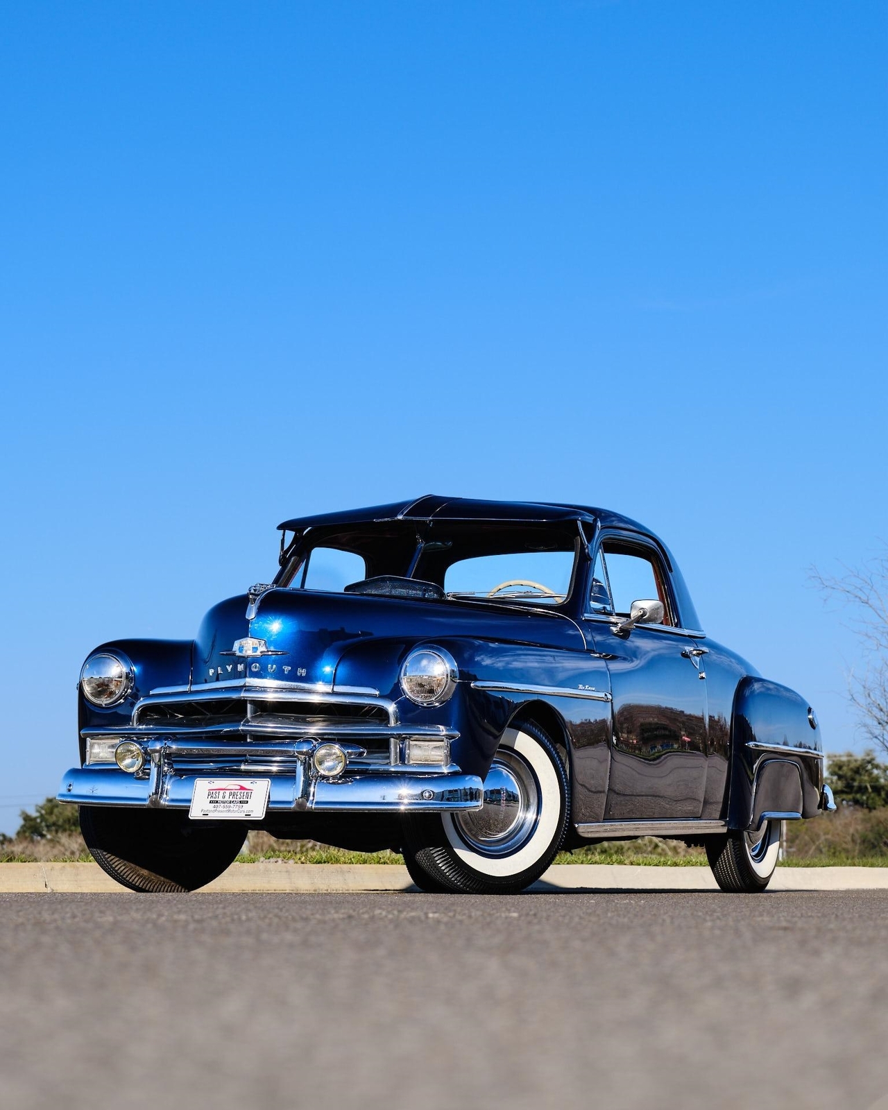 1950 Plymouth Business Coupe, The Plymouth P20 platform was introduced for the 1950 model year. The business coupe was a trim level, powered by an Inline 6 engine L-Head. Displacement: 217.8 cu in. 3.6 L. Power: 97 HP @ 3600 RPM. Bore: 3.3 inch. Stroke: 4.4 in Compression: 7.0:1 Main Bearings: 4 Cylinder Block: Cast-iron, Factory carburetor was a Carter BB-D6H1 1-barrel carburetor. Very original engine & parts including oil bath air cleaner. 3 speed manual transmission. Paint and body - older paint job which is actually 1949 New Brunswick Blue code 606 with a handful of metallic thrown in to give her a nice glow. Very good condition wide mouth 3 horizontal piece chrome grill with running lights tastefully placed. Straight lines, great gaps, Correct trim pieces and emblems. Split front windshield, dual wipers. Exterior Sun visor across the top of the front windshield, is not only functional, but creates an iconic antique look. Fender skirts, nice stainless steel rocker panels, both front and rear bumpers have chrome bumper guards. Interior - absolutely stunning real wood grain gauge cluster and dash. Burgundy and Gray two-tone seats and door panels. Carpeting and headliner are in very good condition. All the interior knobs crank handles, etc. are in good condition. Beautiful large three spoke Ebony, steering wheel with woodgrain surround around the horn button with the Plymouth logo. Factory original chrome push button AM radio. Factory original clock. Functional placement of the interior controls plus a very plush luxury looking interior. Steel rims are painted to match the color of the car. Beautiful chrome, beauty ring. “Moon” hub caps. Wide white wall radial tires. The spare is a matching wheel and tire to the four wheels on the car. No driving around with a strange looking doughnut spare for a flat repair. While we do our best to provide the highest quality muscle cars with an honest and reliable description and realize the importance of transparency when selling vehicles. That being said, we have not built, modified, changed or personally owned this vehicle. Whether this vehicle is consigned or owned by Past & Present Motor Cars we do not know the vehicles complete history since new. We want to be clear and try to answer any questions our customers might have prior to purchasing. Additionally, we not only welcome but we encourage 3rd party independent inspections. Please inquire prior to purchase to make sure the advertised vehicle has not already been sold. We list our vehicles on multiple websites and a vehicle can sell at any time. If a customer chooses to purchase sight unseen (many of our customers choose this option) the customer accepts the vehicle AS IS and WHERE IS and understands we cannot address concerns after purchase. For this reason, it's important all concerns are addressed prior to purchase. We make every effort to present accurate and reliable information, but use of this information is voluntary, and should only be deemed reliable after an independent review of its accuracy, completeness, and timeliness. It is the sole responsibility of the customer to verify the existence of options, accessories and the vehicle condition before time of sale. Financing is Available with low rates and Vehicle Shipping is available from our Showroom to your Garage. A Classic Car Warranty is Available for Purchase from a 3rd Party. Please speak to our Sales Associate or Company Representative for more information. Our team is working and available anytime by Phone or Text for your convenience at407-559-7759. Thank you for your interest!