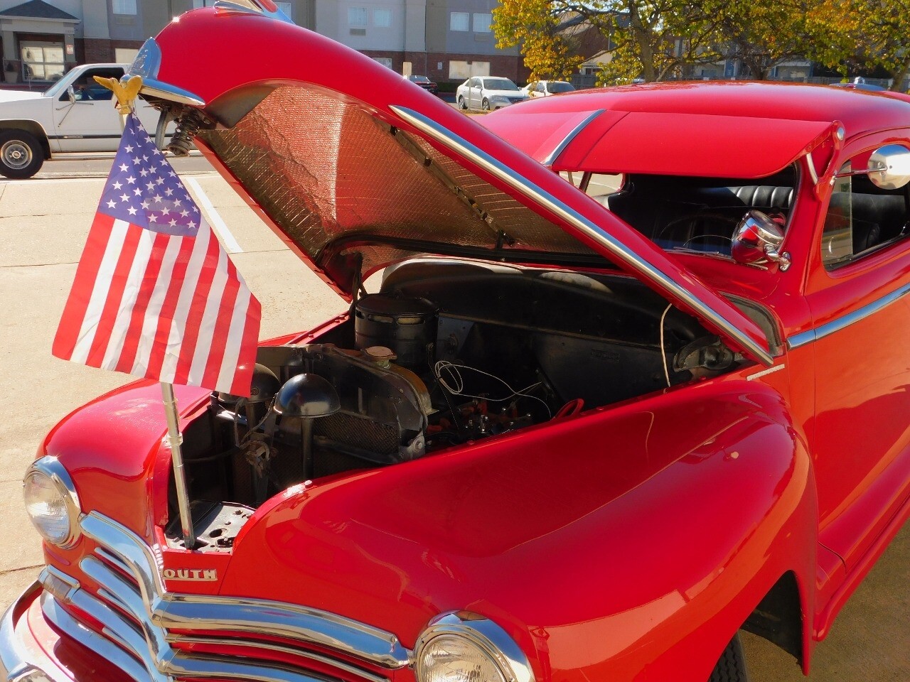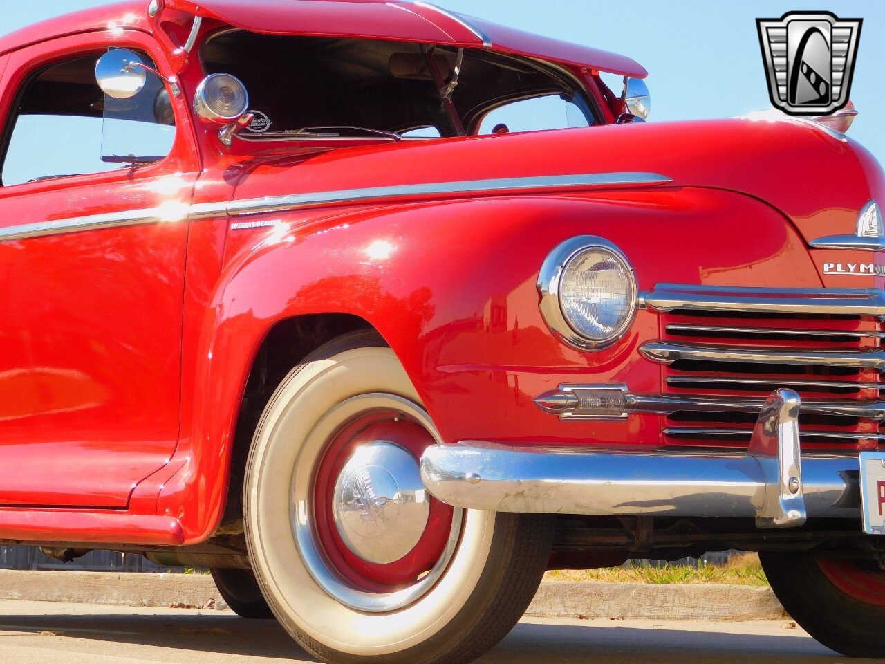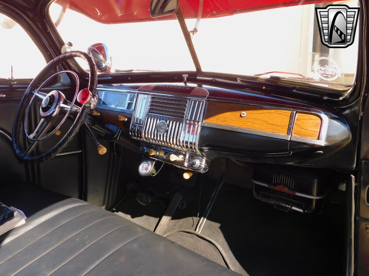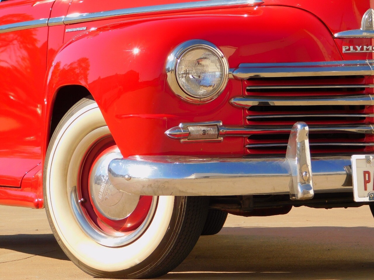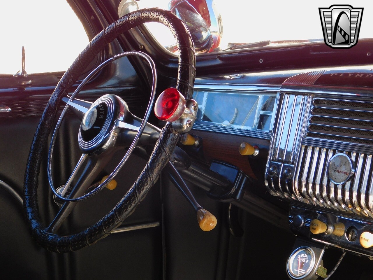This car is prime example of the after war time Plymouths, painted in a nice bright red with nice details all around. We start in the front with chromed grill, bumper headlight rings and culminates up the prominent hood feature. Side chrome trim pieces abound and finishes with the rear chrome bumper. The major features of the outside include the adjustable color matched sun visor the extra A piler lights and customized side rear view mirrors.