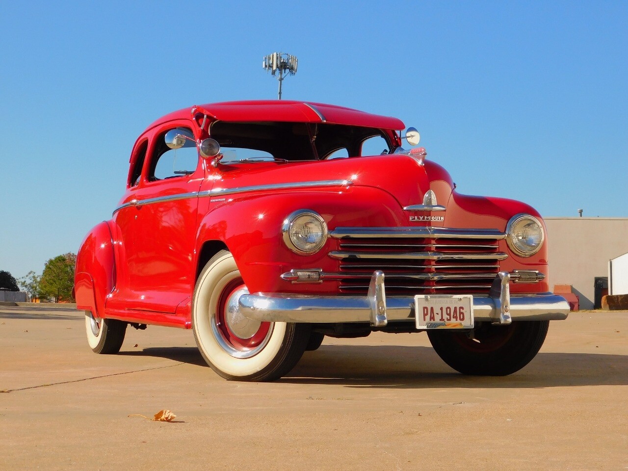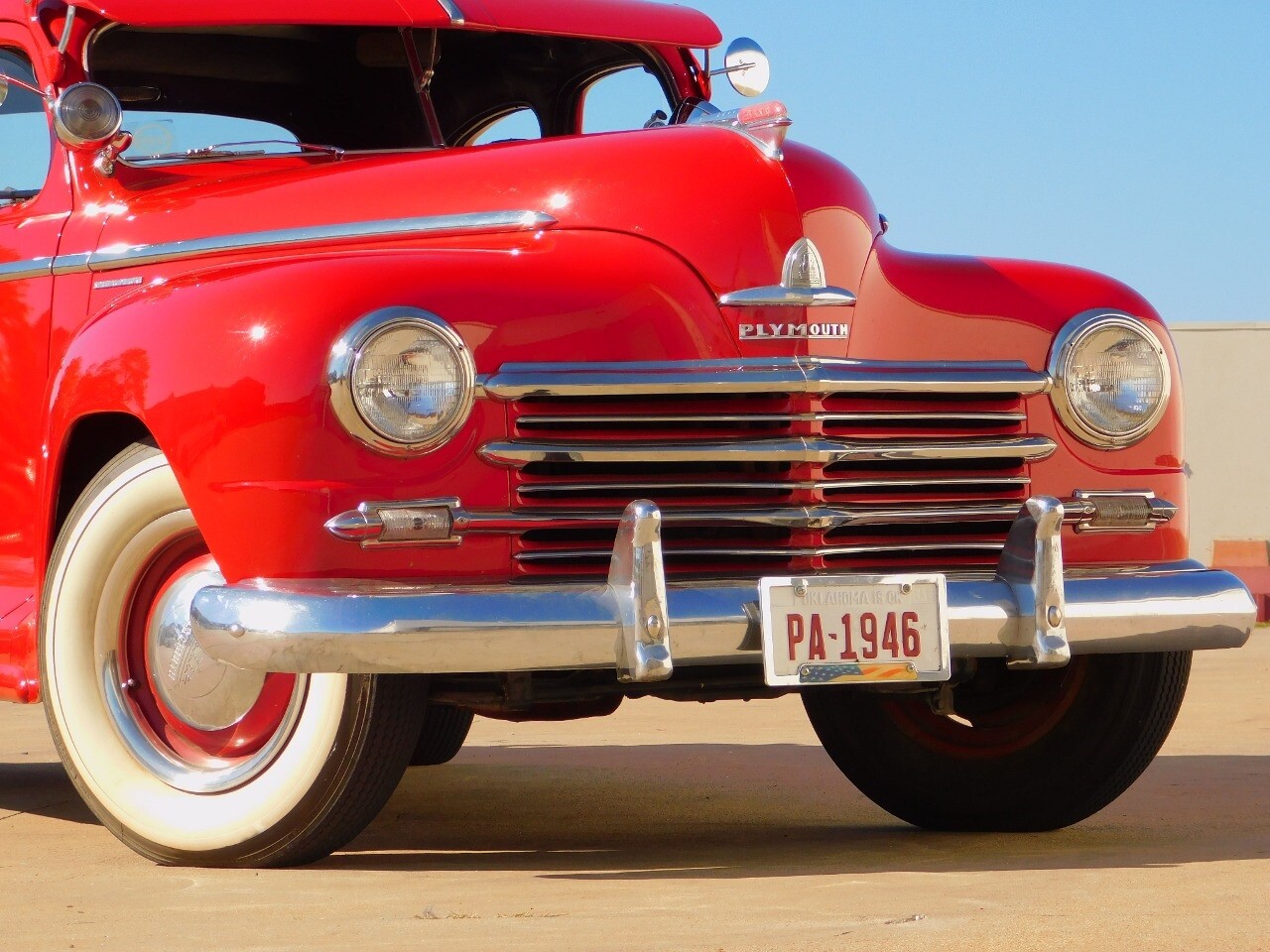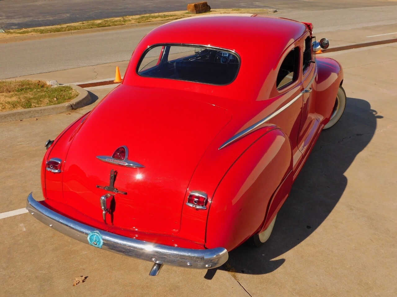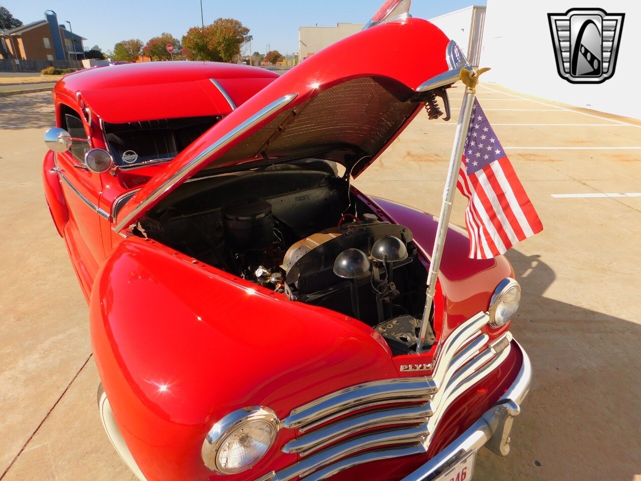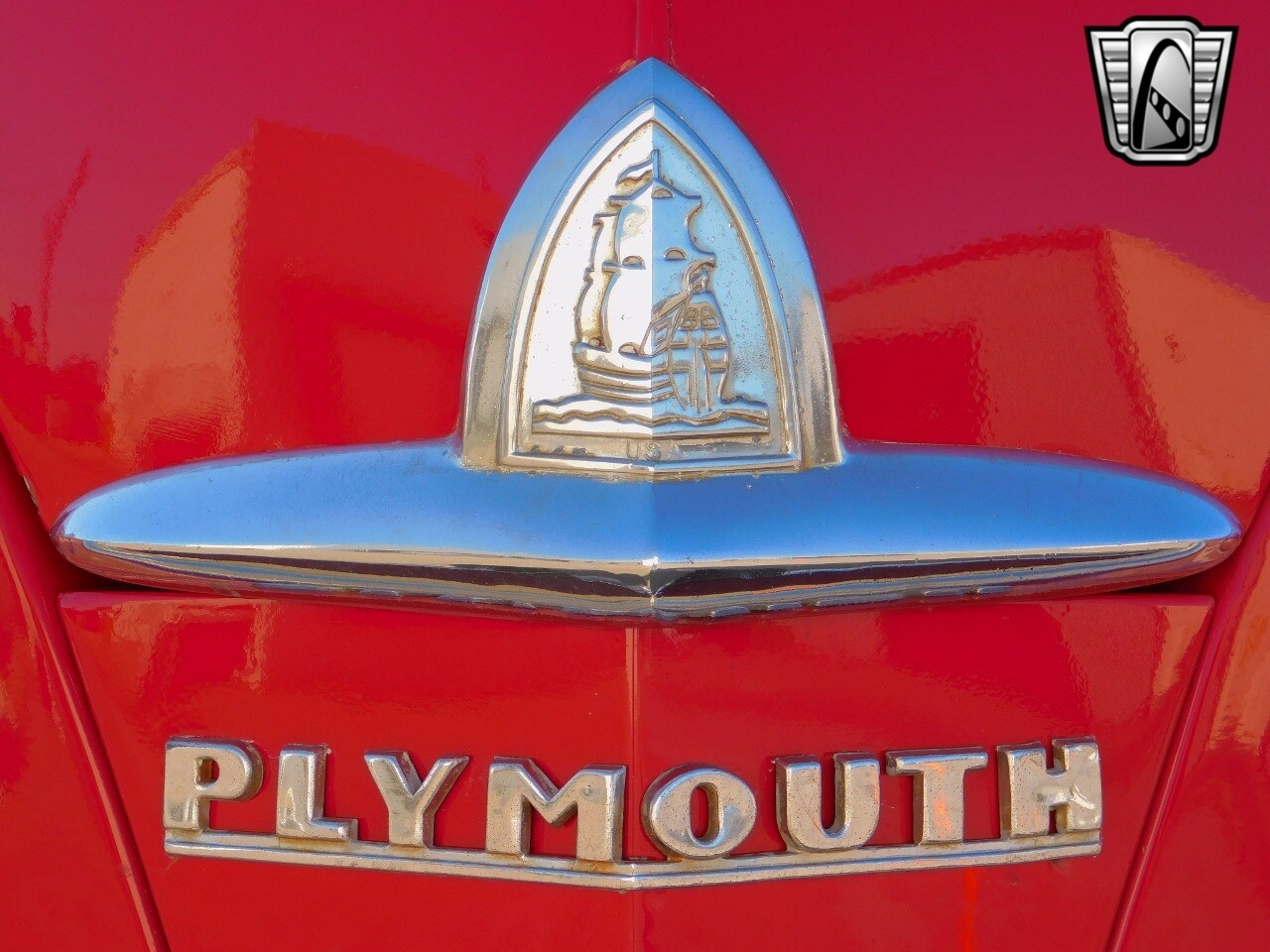 This car is prime example of the after war time Plymouths, painted in a nice bright red with nice details all around. We start in the front with chromed grill, bumper headlight rings and culminates up the prominent hood feature. Side chrome trim pieces abound and finishes with the rear chrome bumper. The major features of the outside include the adjustable color matched sun visor the extra A piler lights and customized side rear view mirrors.