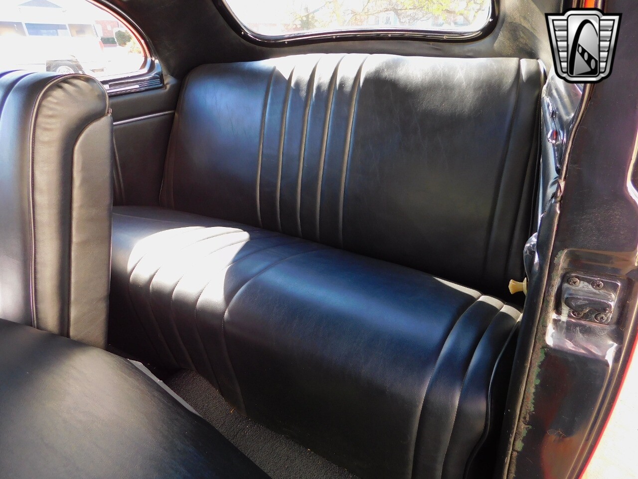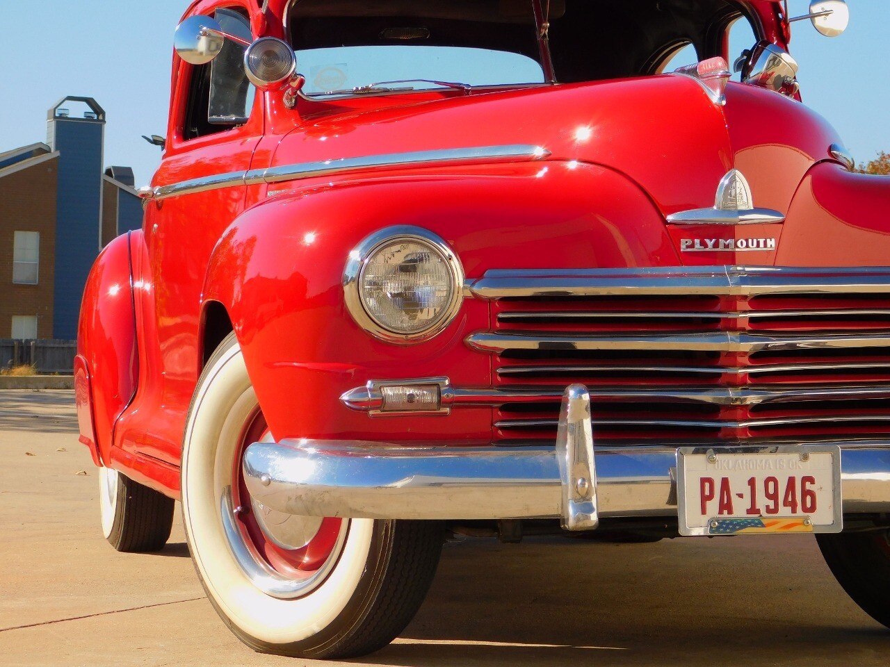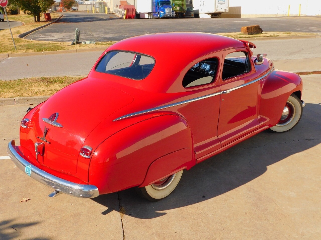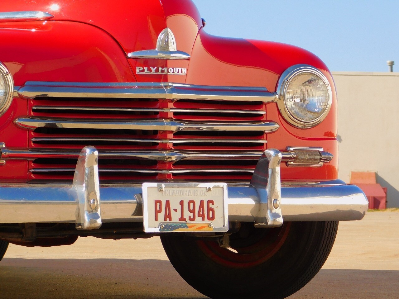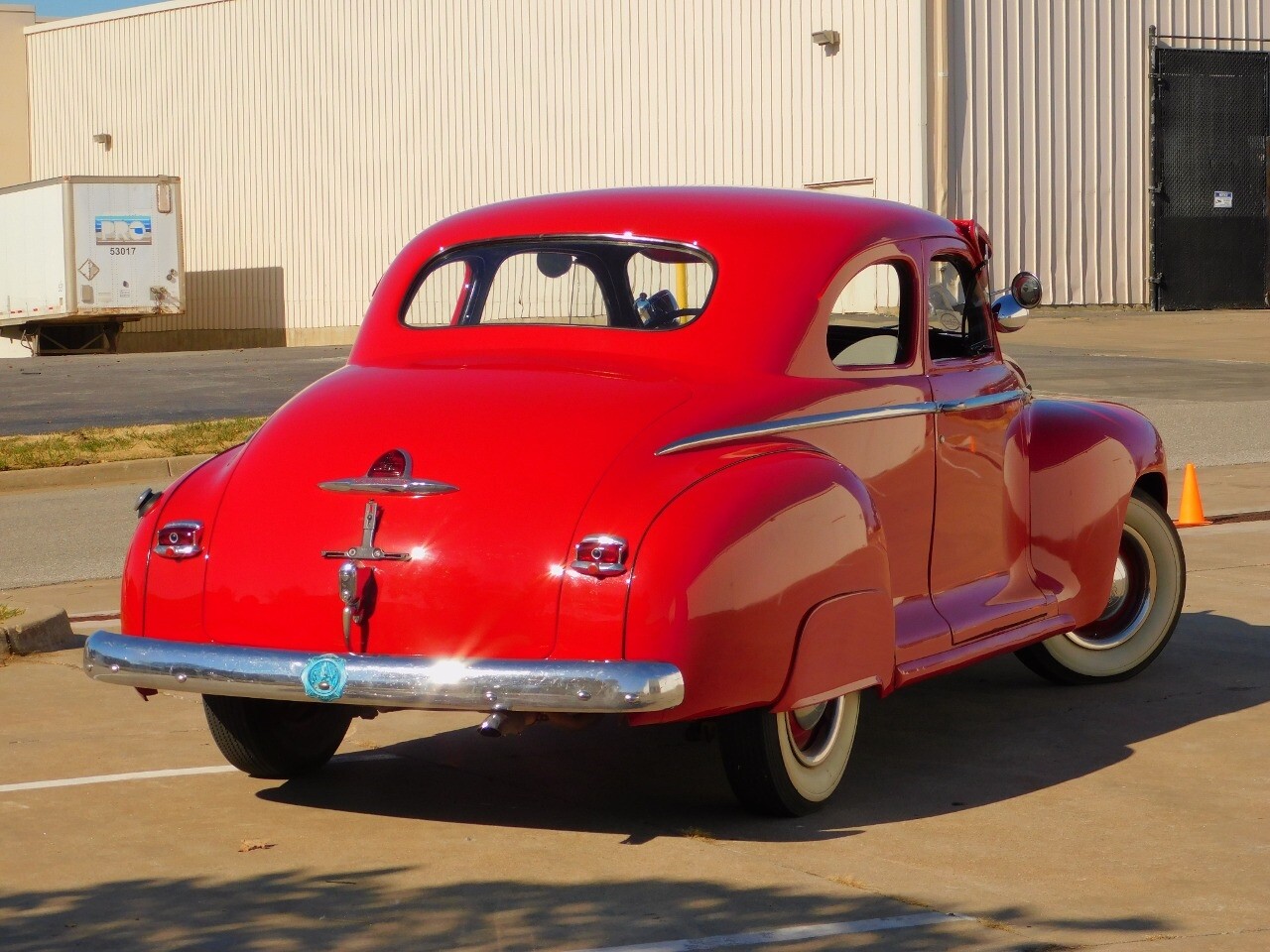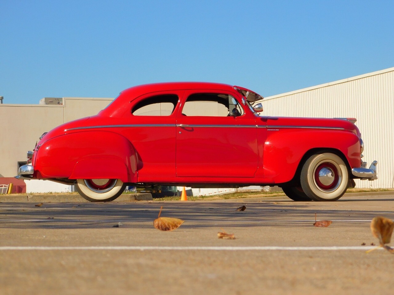 This car is prime example of the after war time Plymouths, painted in a nice bright red with nice details all around. We start in the front with chromed grill, bumper headlight rings and culminates up the prominent hood feature. Side chrome trim pieces abound and finishes with the rear chrome bumper. The major features of the outside include the adjustable color matched sun visor the extra A piler lights and customized side rear view mirrors.