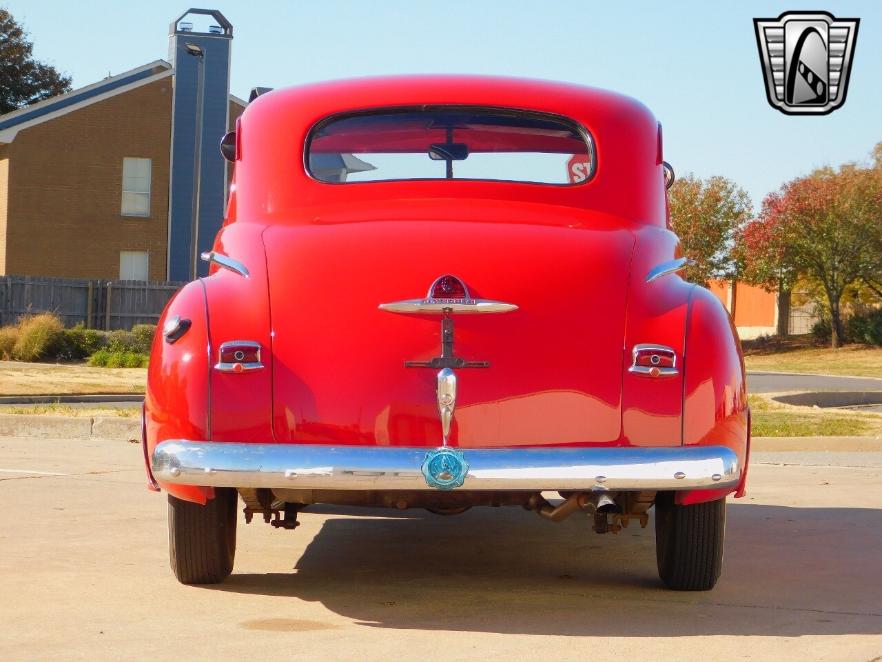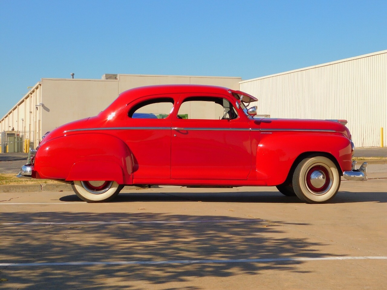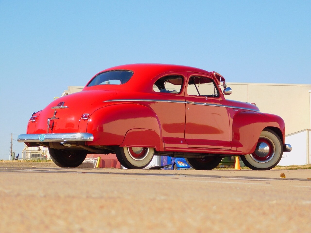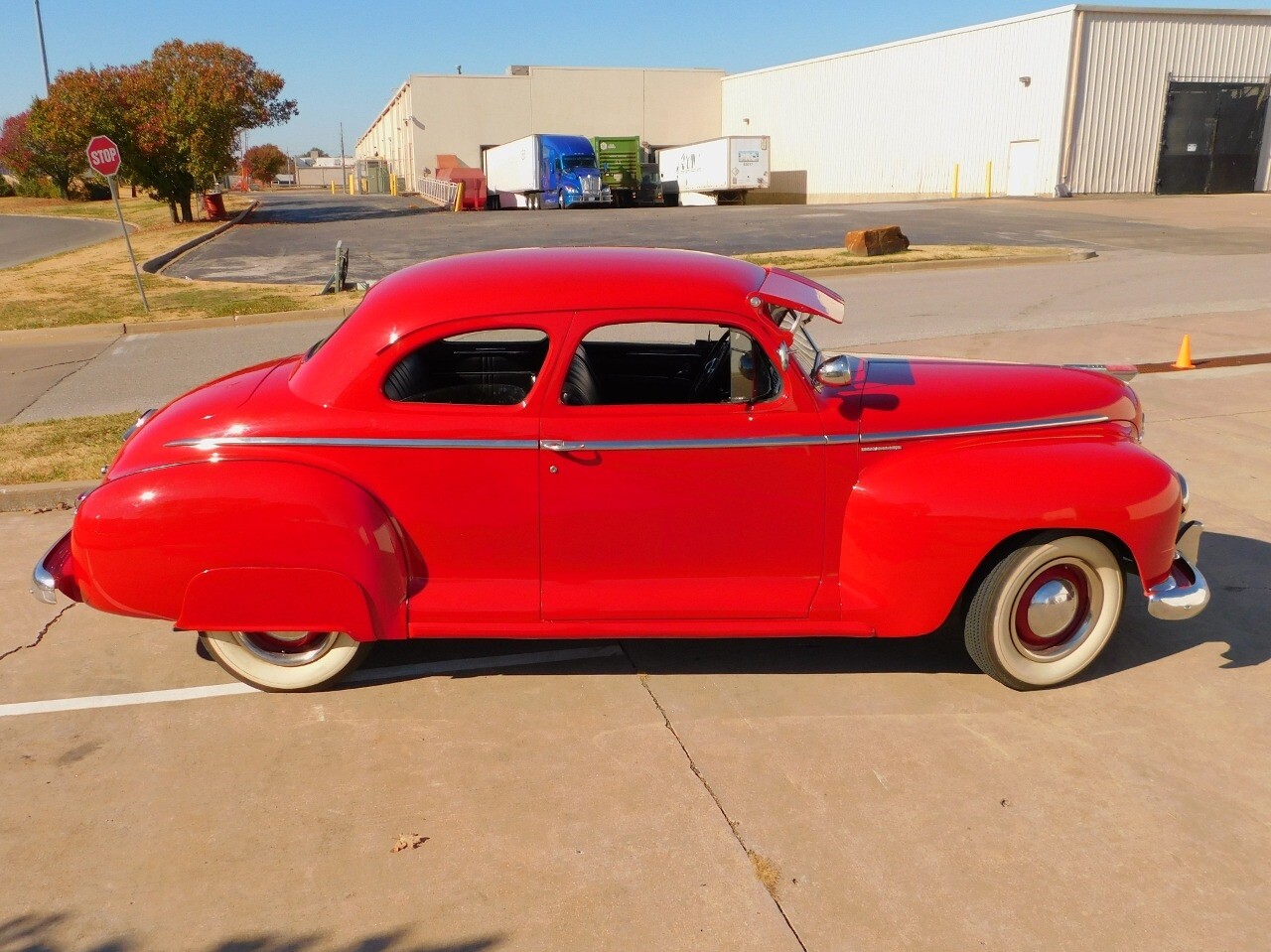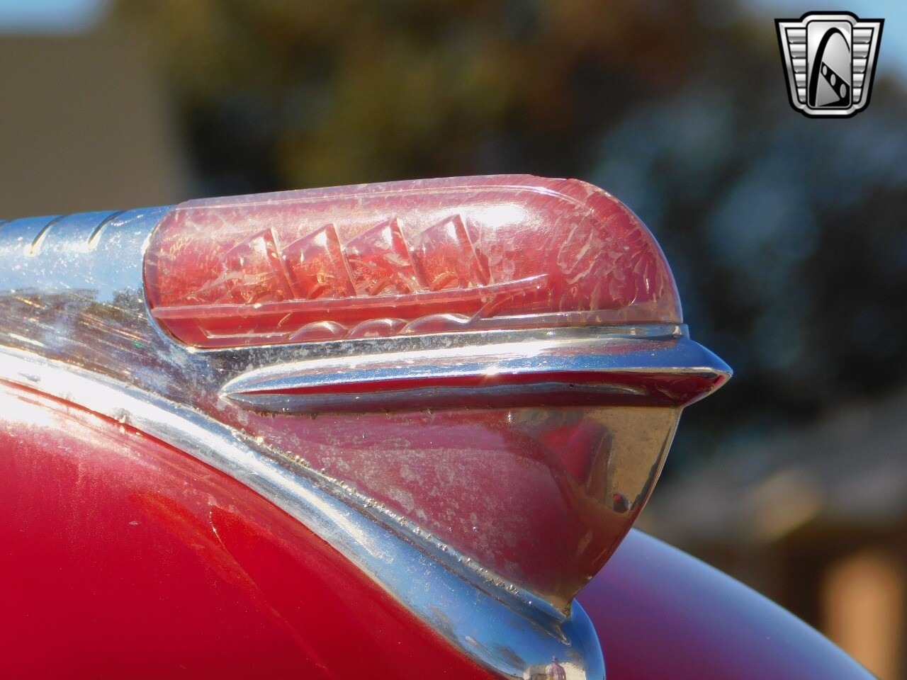 This car is prime example of the after war time Plymouths, painted in a nice bright red with nice details all around. We start in the front with chromed grill, bumper headlight rings and culminates up the prominent hood feature. Side chrome trim pieces abound and finishes with the rear chrome bumper. The major features of the outside include the adjustable color matched sun visor the extra A piler lights and customized side rear view mirrors.