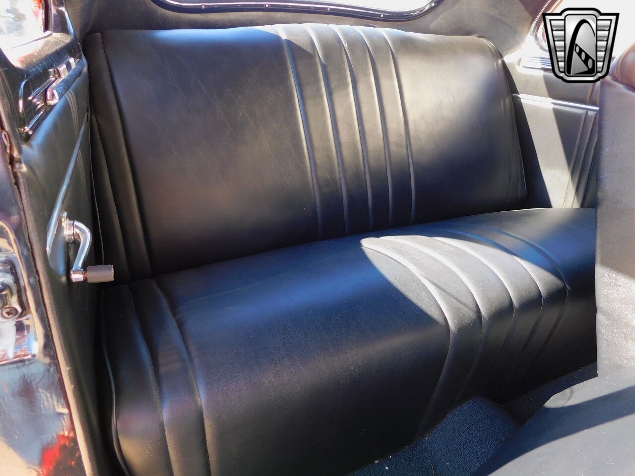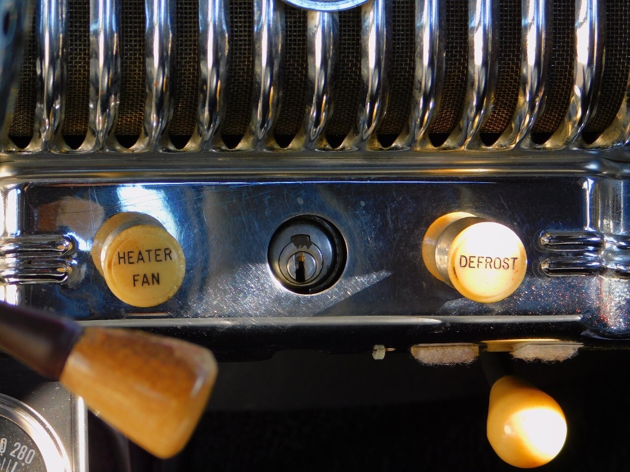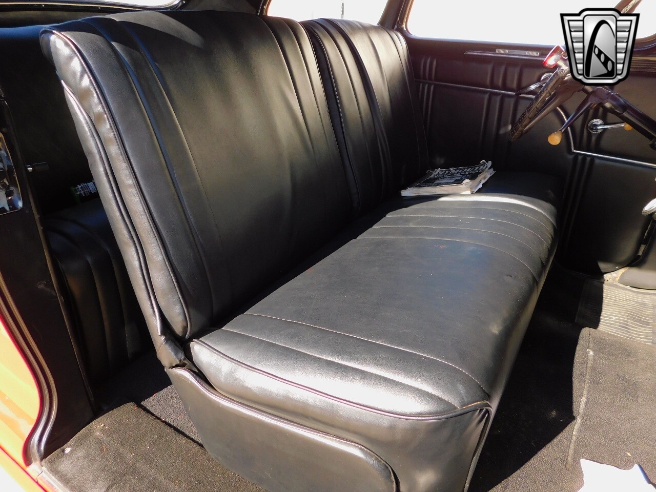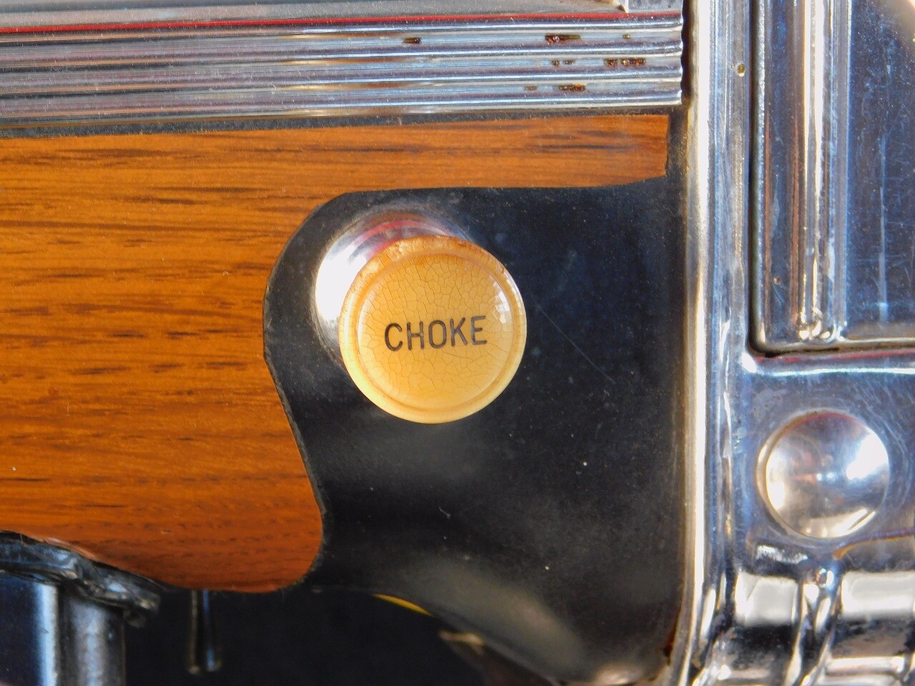 The interior very chic for the day in black. The dash is black with chrome switches and accents with wood inlay panels. Black vinyl bench seating and the oversized steering wheel is also black with chrome.