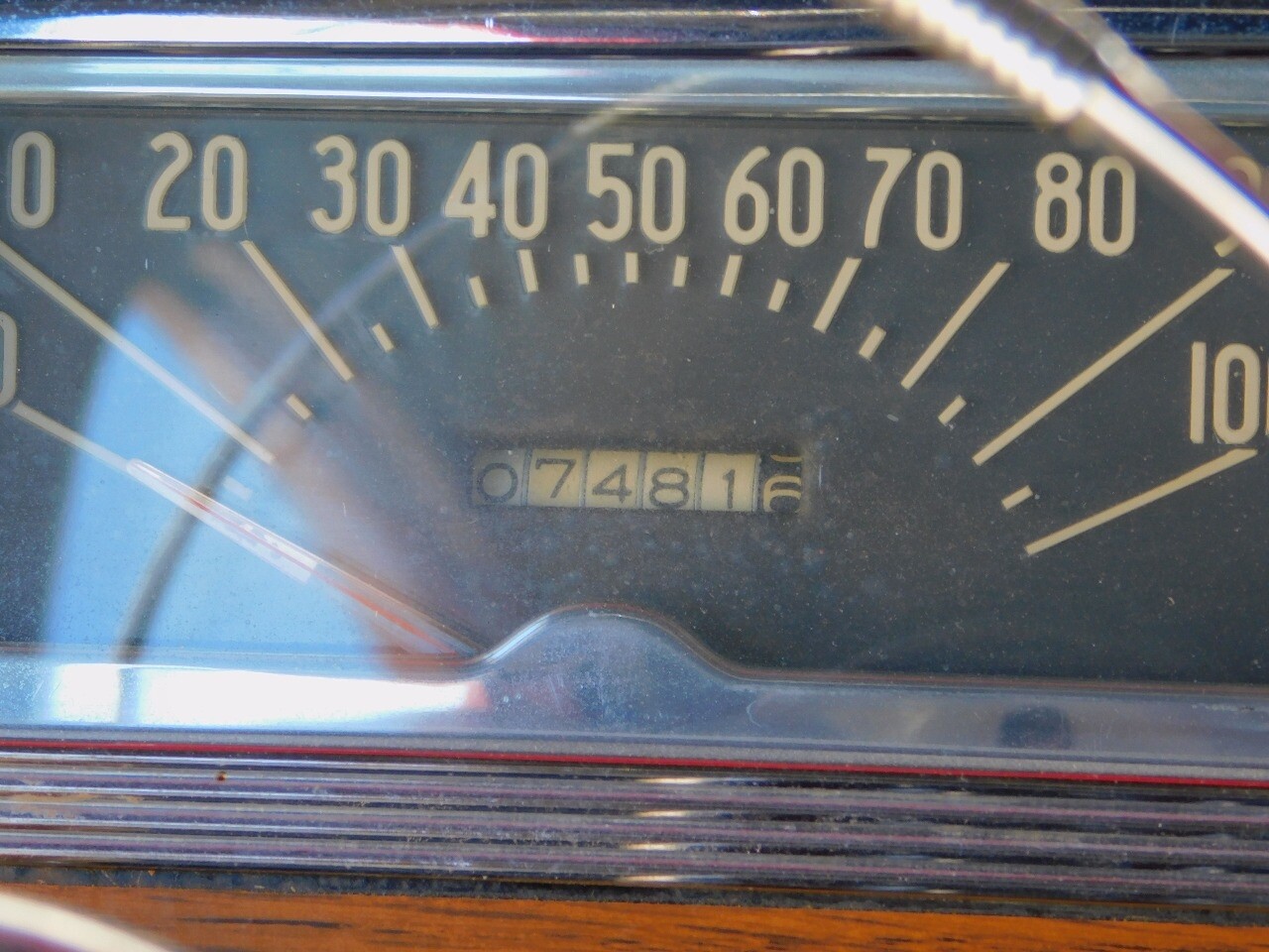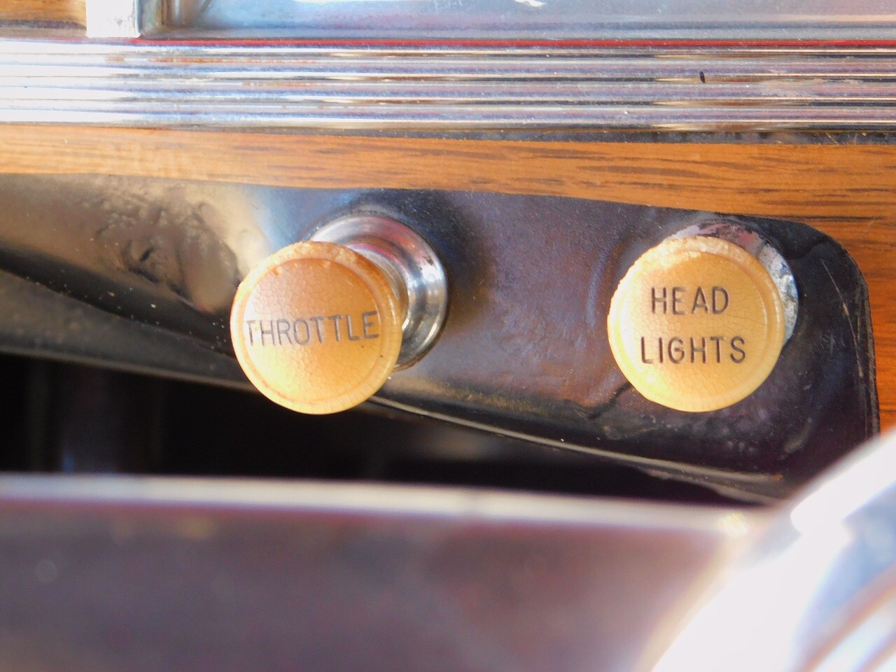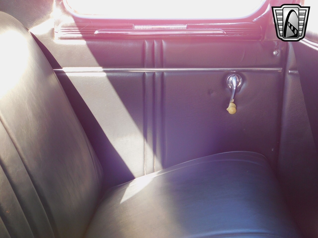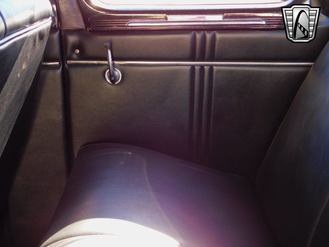 The interior very chic for the day in black. The dash is black with chrome switches and accents with wood inlay panels. Black vinyl bench seating and the oversized steering wheel is also black with chrome.
