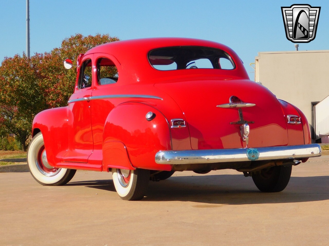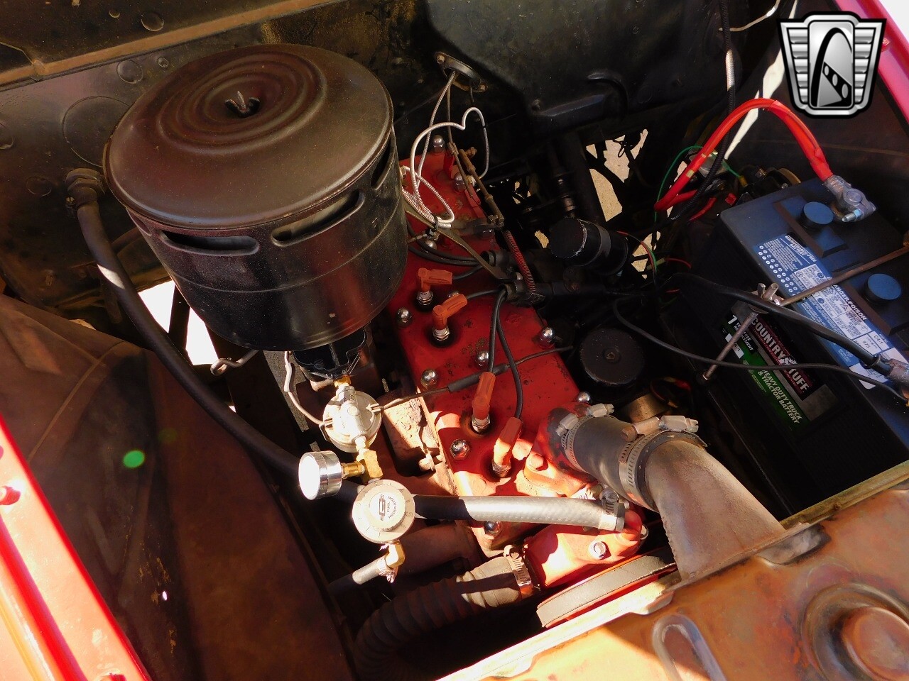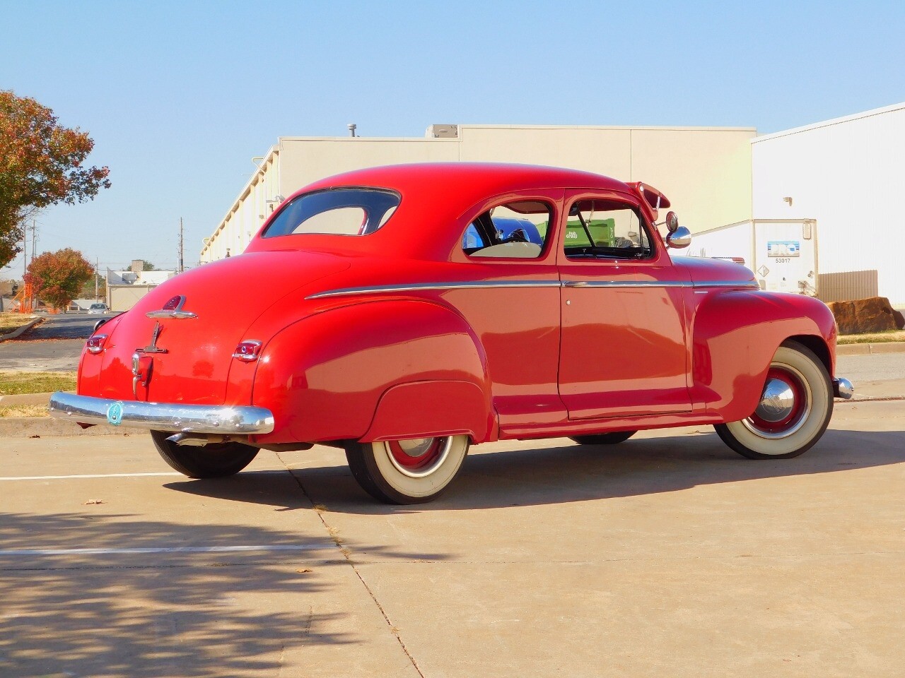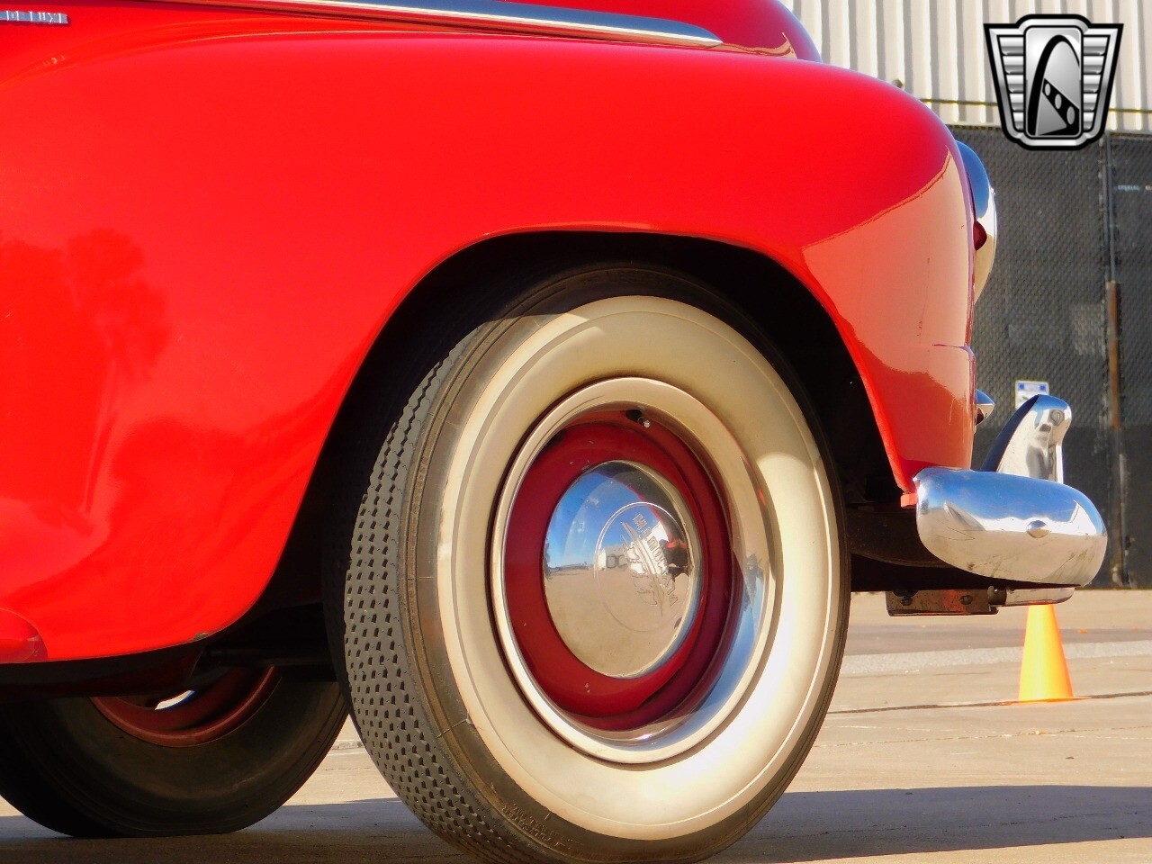 The car is powered by a quiet inline 6 cylinder engine mated to a 3 speed transmission on the column. Power is transferred to the rear wheels and put down to the pavement with color matching red wheels with white walled tires accentuated with the chrome hub caps and beauty rings.