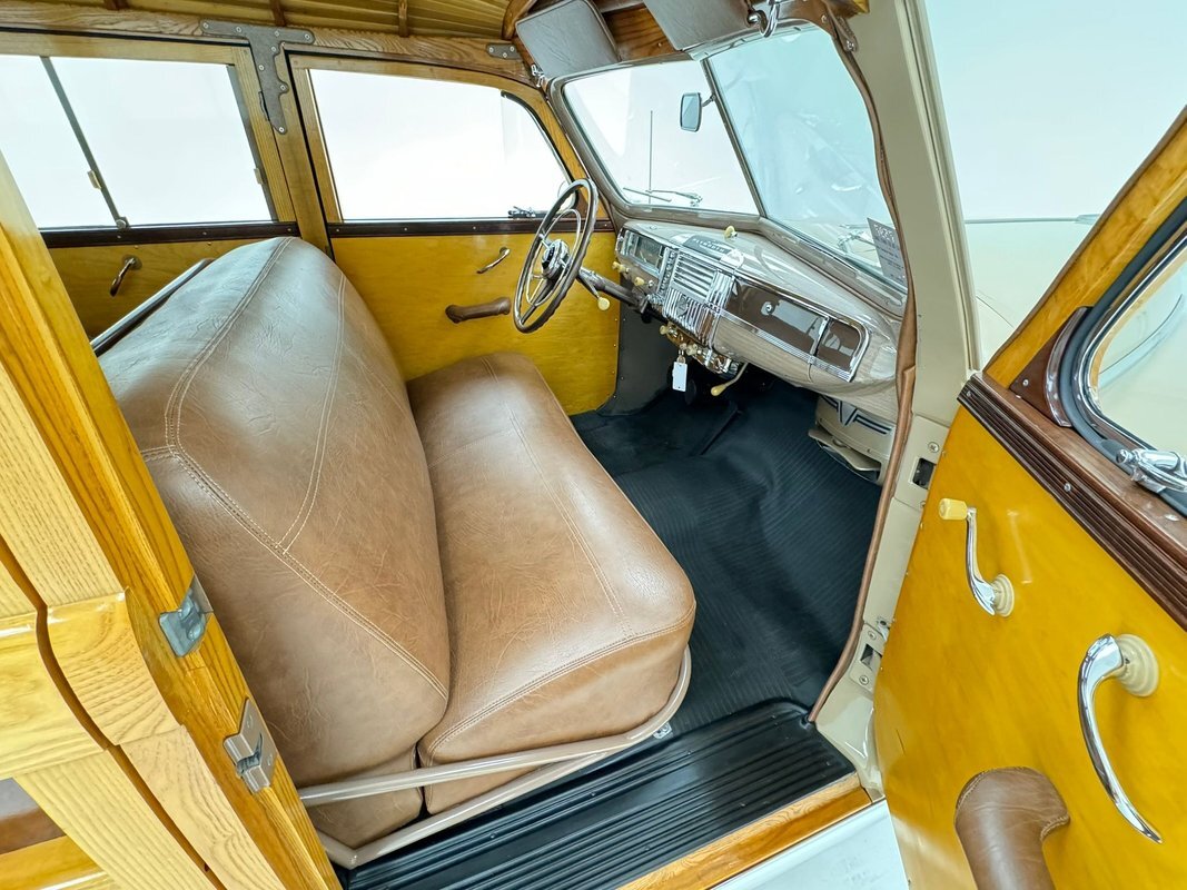 Inside, between the wood paneled door inserts there are three saddle colored vinyl covered bench seats, and the rear two come with one wider than the other. These are removable to accommodate passenger and cargo needs. These are all overstuffed and stitched and are mounted in tubular tan painted steel frames. The spare tire is seen behind the drivers bench and is covered. A large faux woodgrain painted metal dash fronts the driver's bench and is loaded with Art Deco styled chrome gauges, speaker ribs, radio and climate controls all just beautifully polished. This Art Deco styled gauge cluster features square and rectangular black face gauges. A few warm cream bakelite knobs are also seen on the dash lower. A 3 on the tree manual transmission and the original steering wheel is in excellent condition. The interior roof is wood lath strips with structural arches, in all wood and all varnished. Just beautiful.