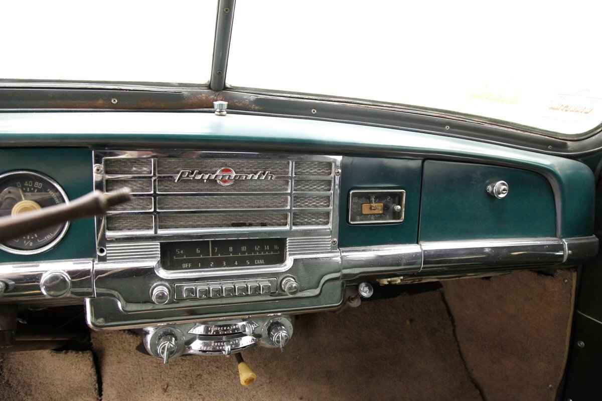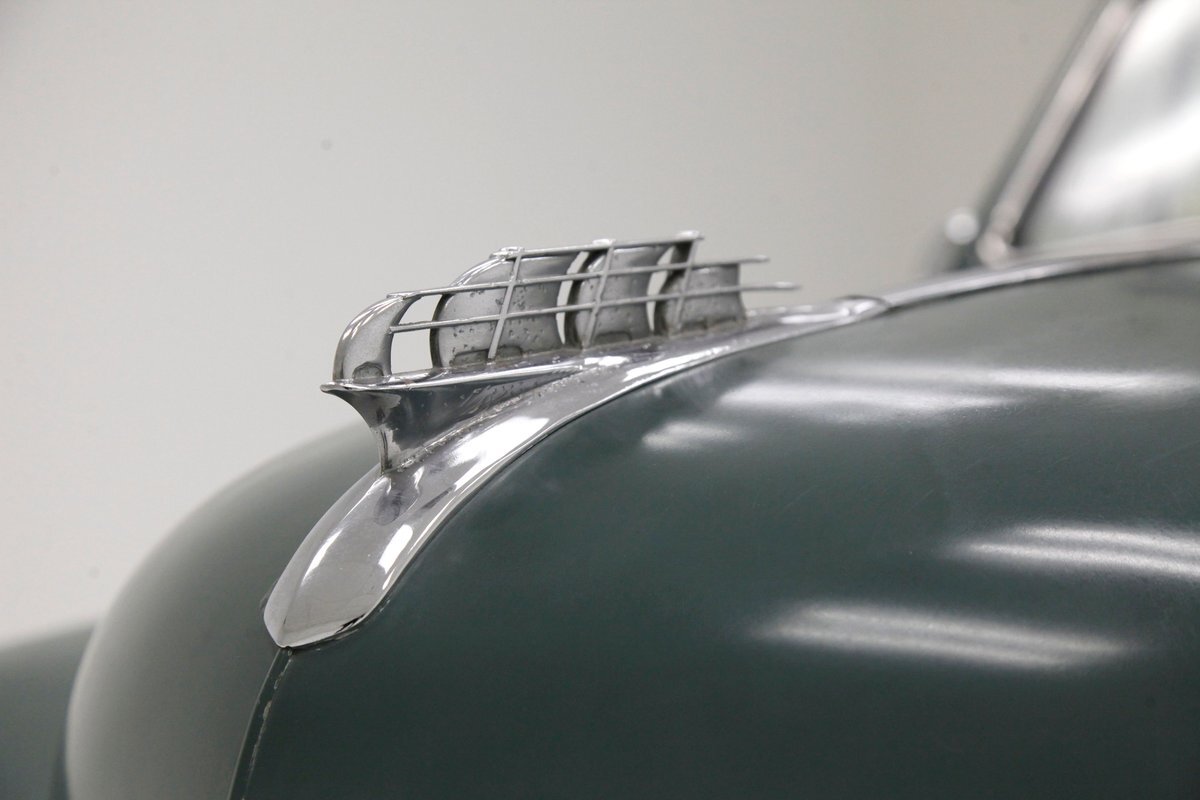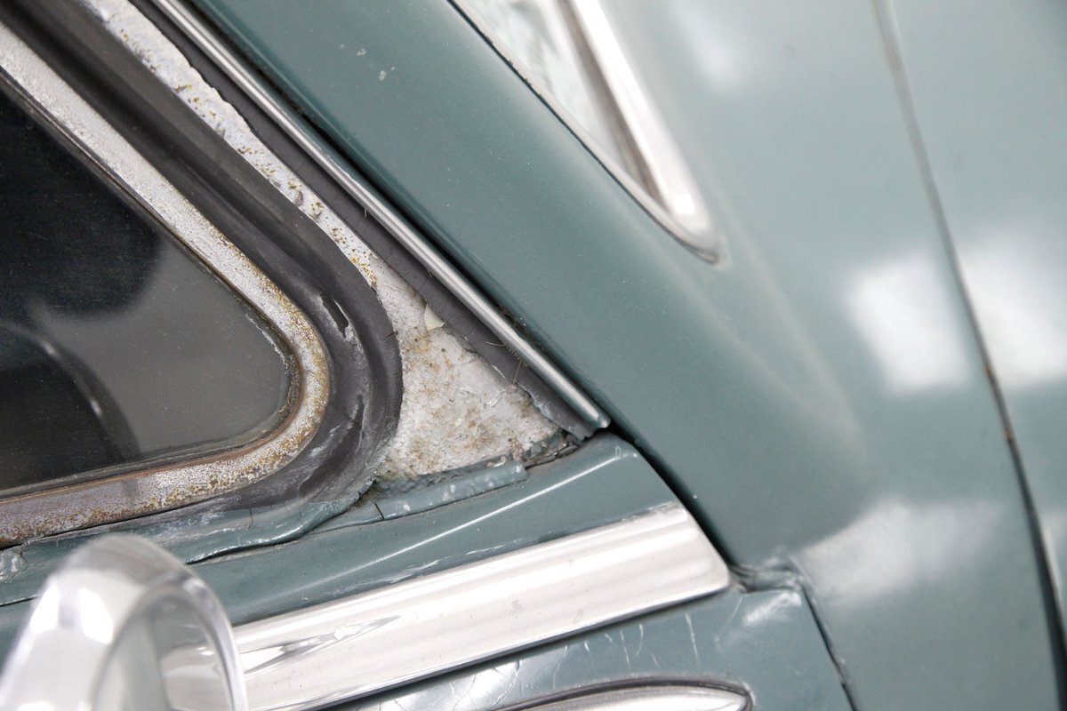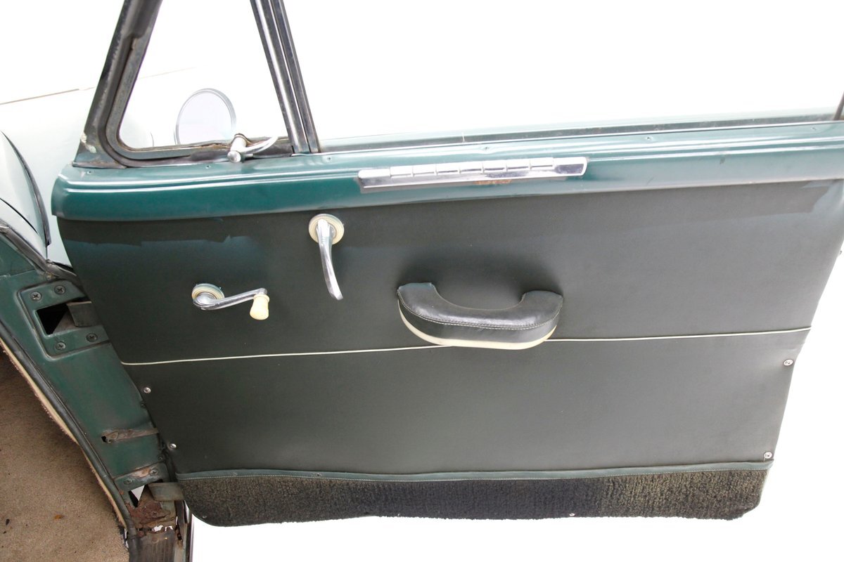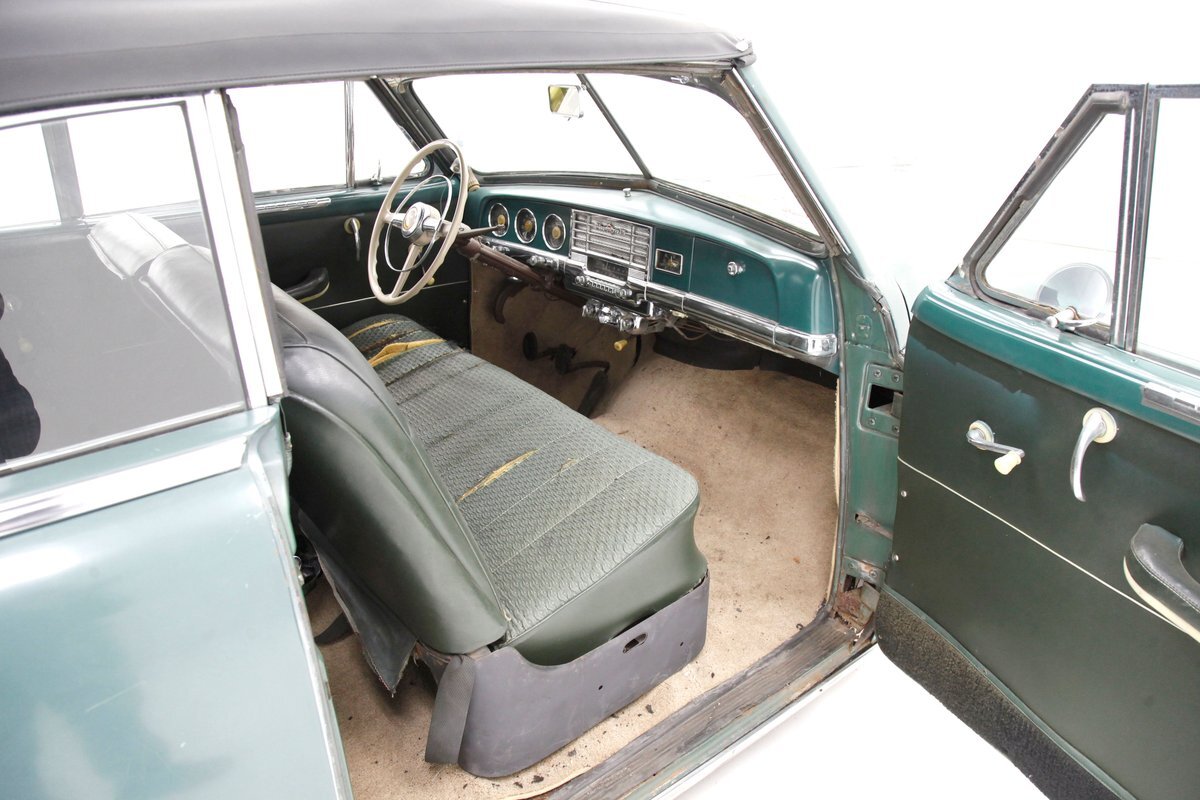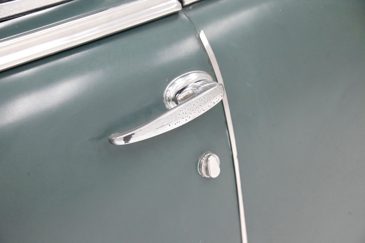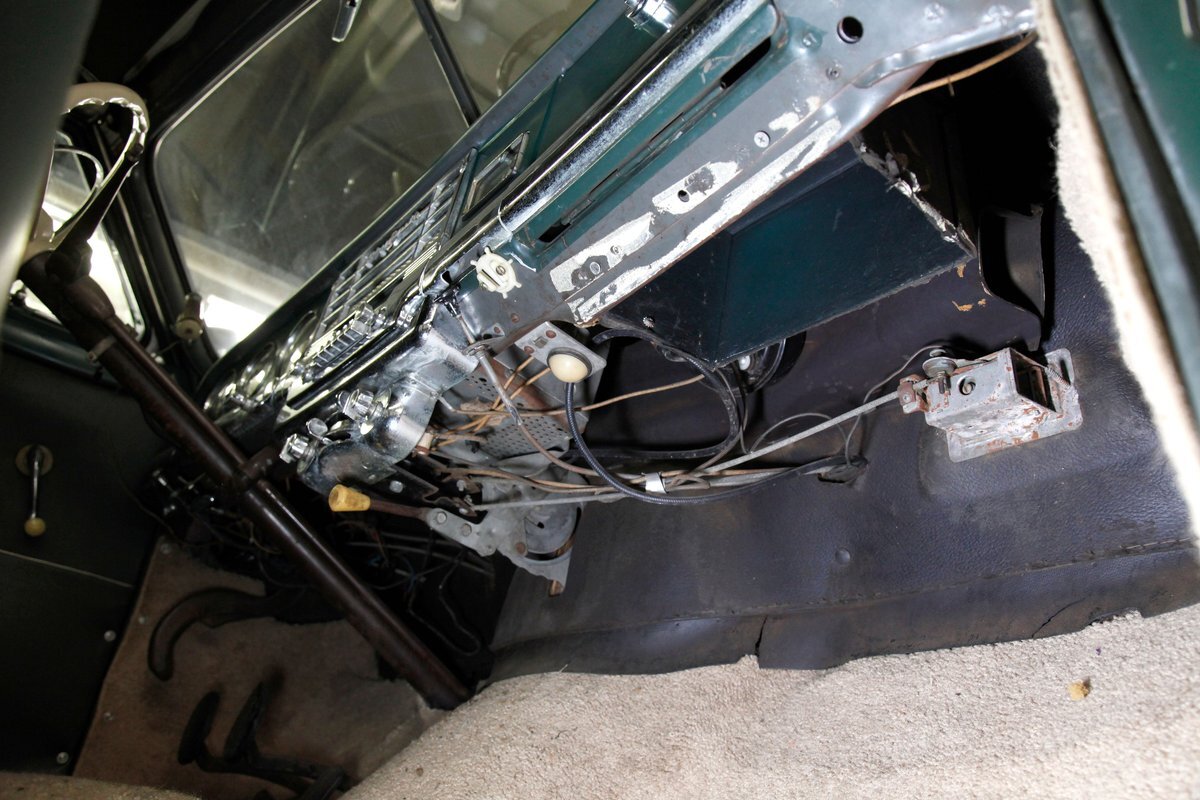 Knitted green broadcloth with smooth dark green vinyl bolsters and tops covers the front and rear benches. These present with some seam splitting, tears and light soiling. The bench in back is flanked by smooth dark green panels dressed with bakelite and chrome cranks. The door panels are covered in more dark green vinyl. They have some art deco inspired chrome as well as shiny chrome handles and cranks with cream bakelite escutcheons and knobs showing nicely on this dark green background. Up front, the full metal dash is finished in Kitchener Green and there are also plenty of beautifully chromed bezels and a horizontally mounted radio and central speaker cover that has shades of an old jukebox. Another small curved chromed panel hangs below the dash, and houses more bakelite knobs. This dash is very inspiring and clean, but the chome does present with some pitting. The Kitchener Green also shows up on the door sills and center framing for the windshield. Tan carpet floats this Art Deco interior and a big cream bakelite steering wheel is fronting the dash and it also has plenty of chromed embellishments.