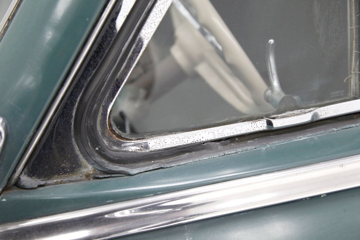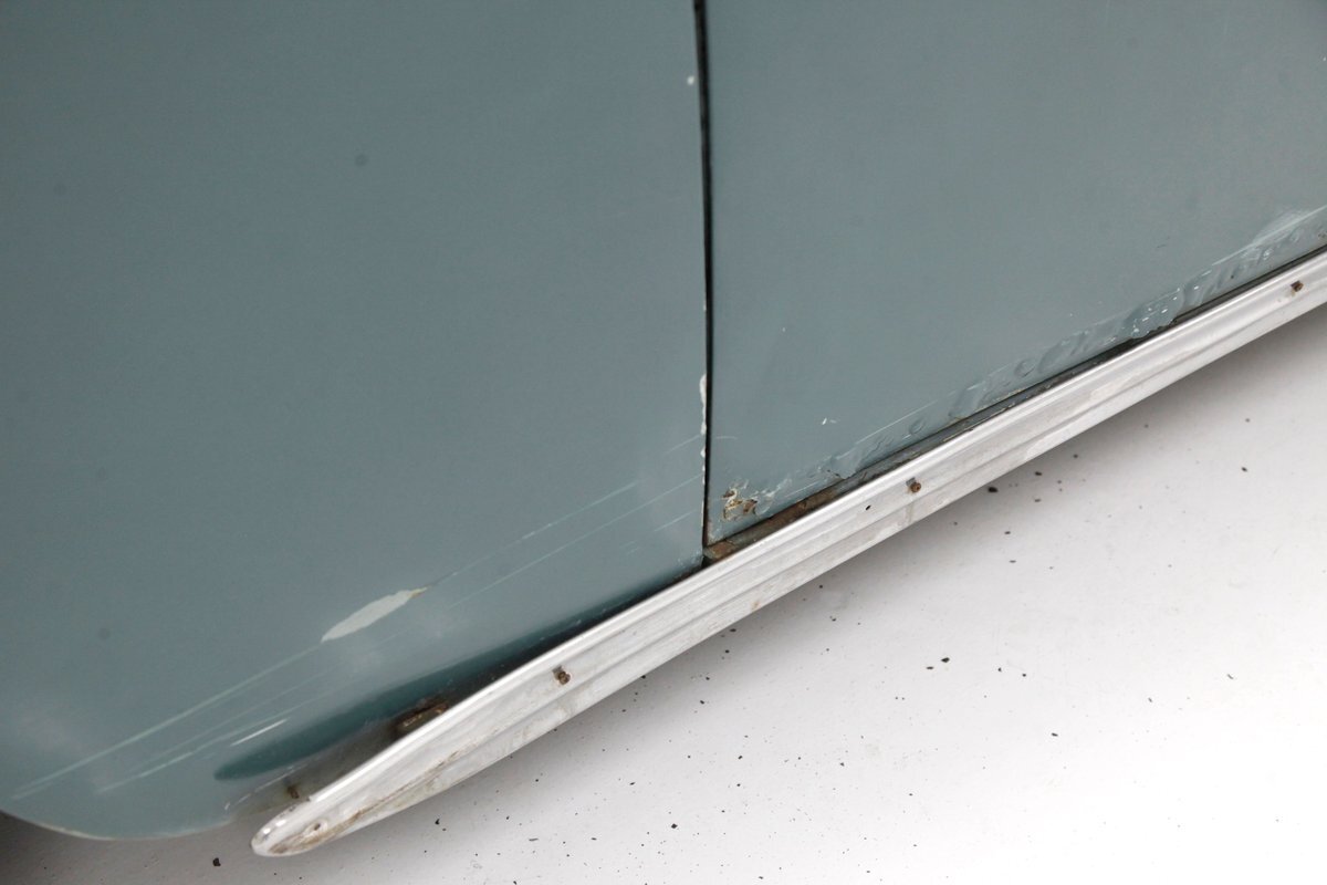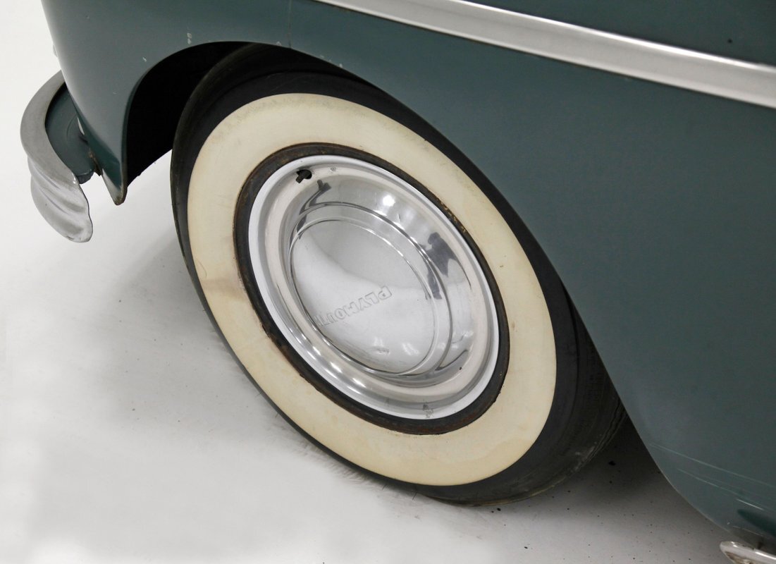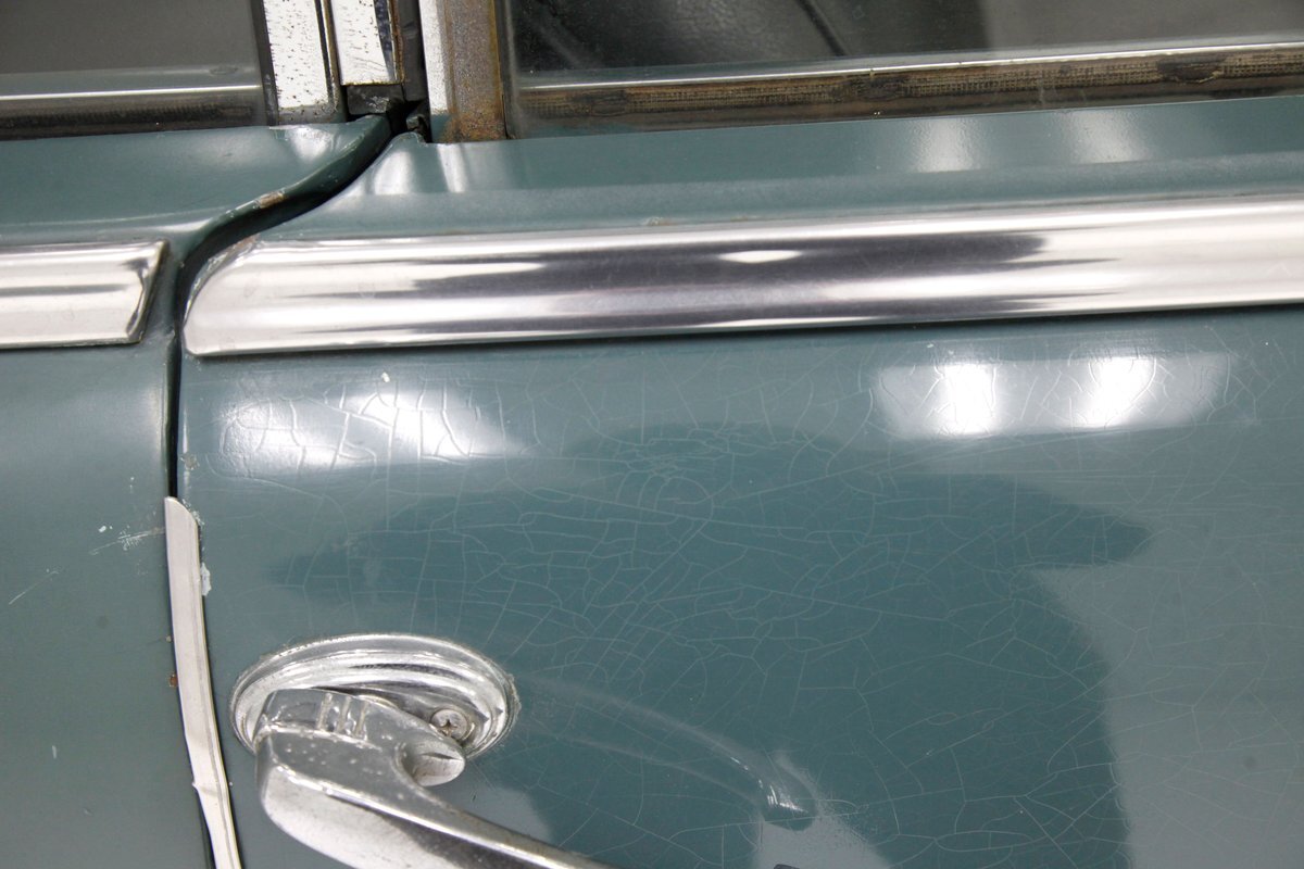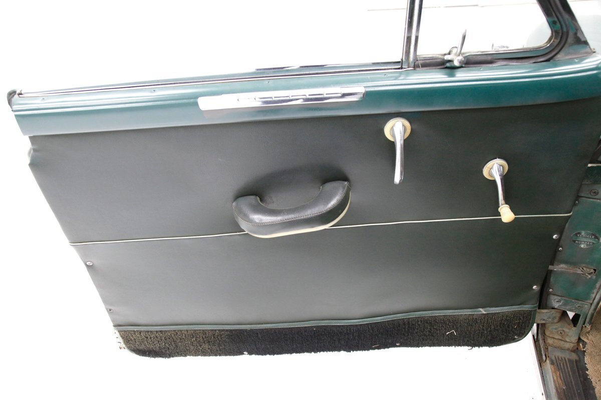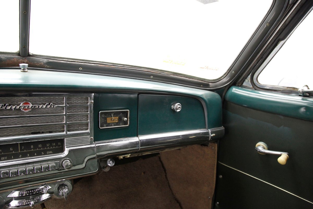 Knitted green broadcloth with smooth dark green vinyl bolsters and tops covers the front and rear benches. These present with some seam splitting, tears and light soiling. The bench in back is flanked by smooth dark green panels dressed with bakelite and chrome cranks. The door panels are covered in more dark green vinyl. They have some art deco inspired chrome as well as shiny chrome handles and cranks with cream bakelite escutcheons and knobs showing nicely on this dark green background. Up front, the full metal dash is finished in Kitchener Green and there are also plenty of beautifully chromed bezels and a horizontally mounted radio and central speaker cover that has shades of an old jukebox. Another small curved chromed panel hangs below the dash, and houses more bakelite knobs. This dash is very inspiring and clean, but the chome does present with some pitting. The Kitchener Green also shows up on the door sills and center framing for the windshield. Tan carpet floats this Art Deco interior and a big cream bakelite steering wheel is fronting the dash and it also has plenty of chromed embellishments.