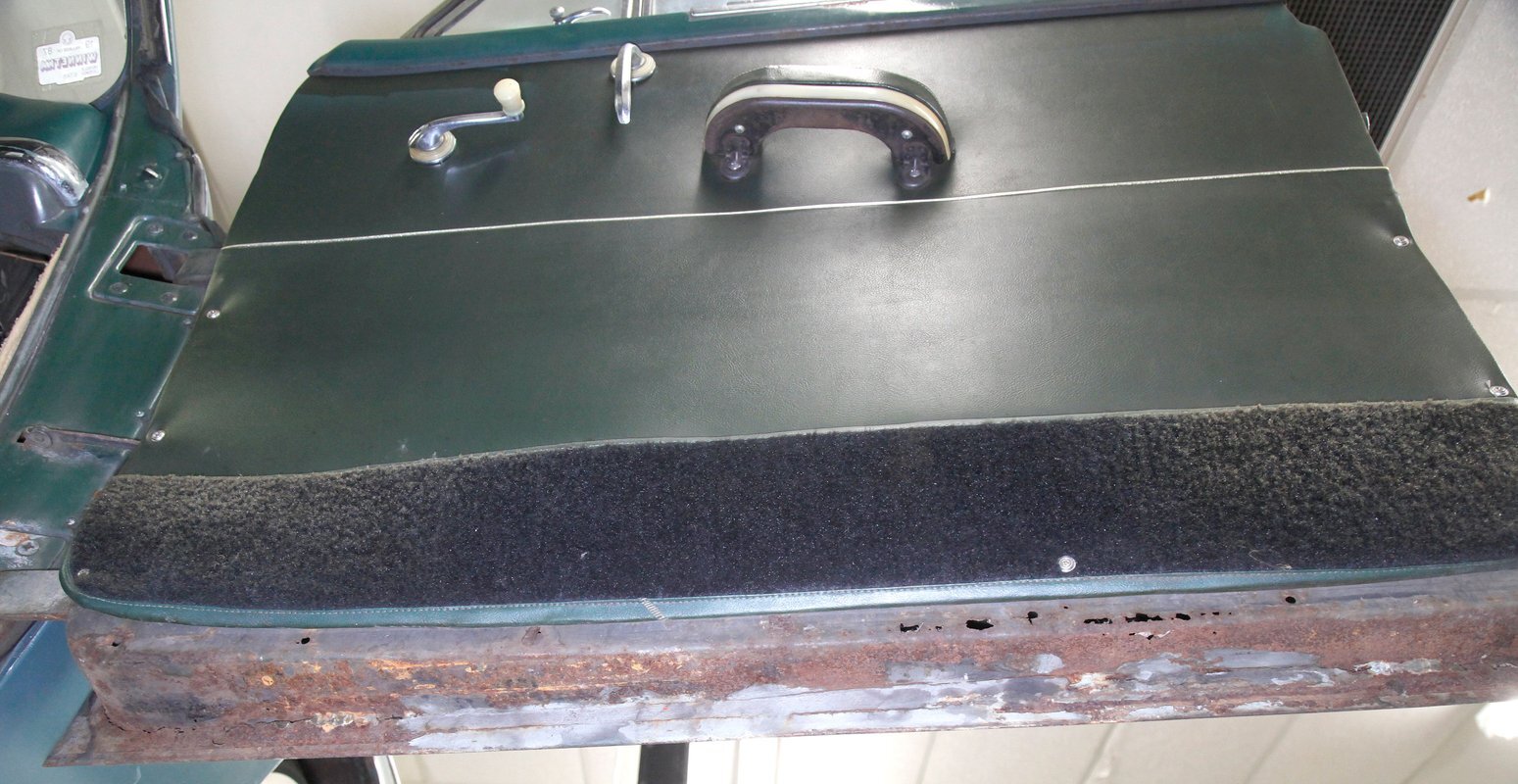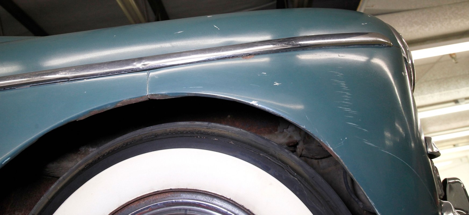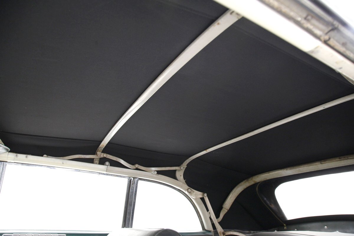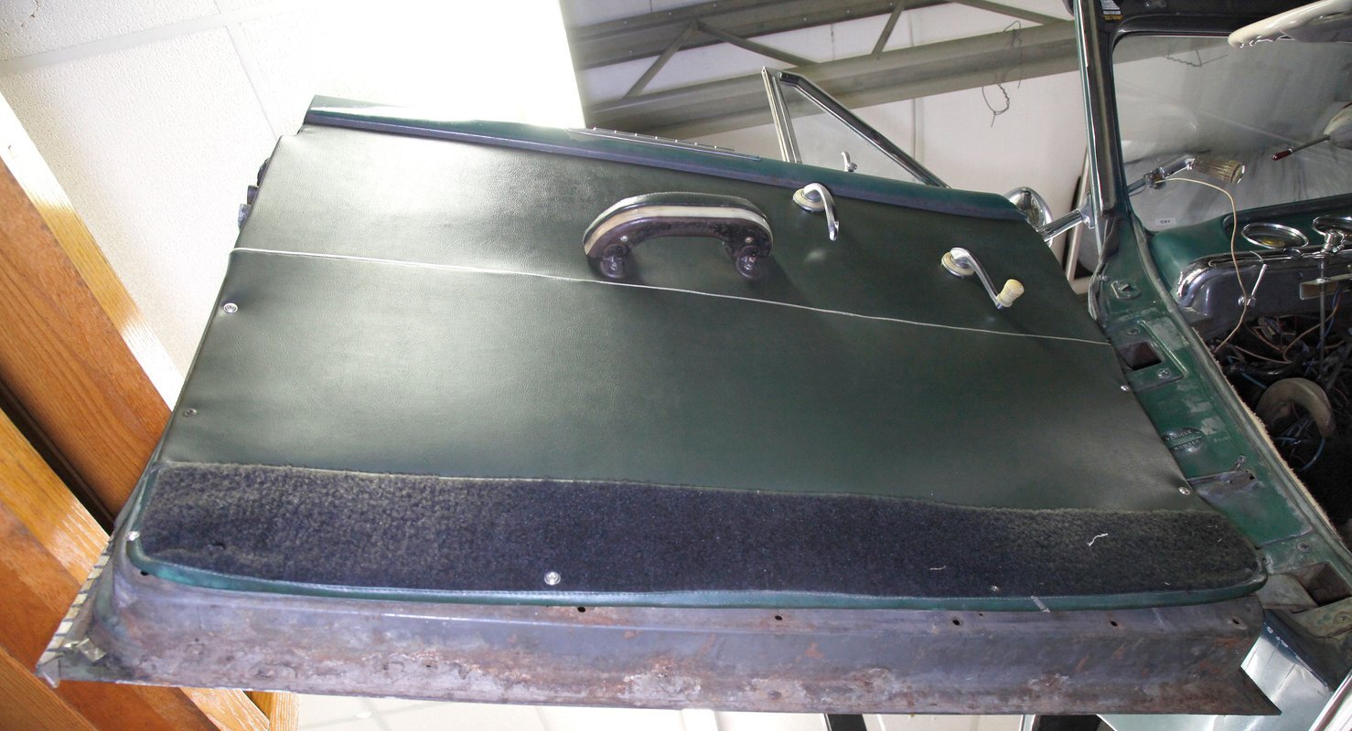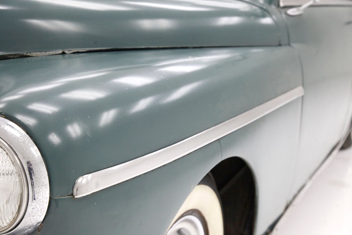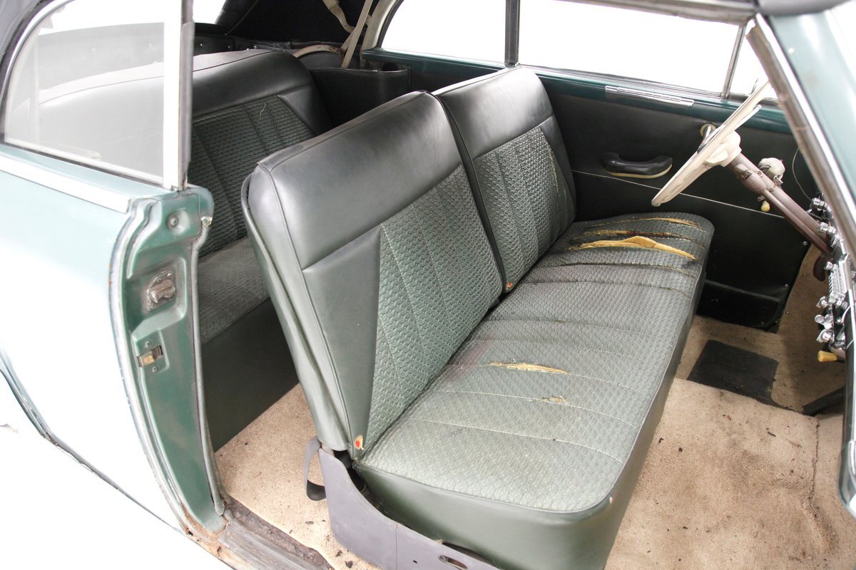 Knitted green broadcloth with smooth dark green vinyl bolsters and tops covers the front and rear benches. These present with some seam splitting, tears and light soiling. The bench in back is flanked by smooth dark green panels dressed with bakelite and chrome cranks. The door panels are covered in more dark green vinyl. They have some art deco inspired chrome as well as shiny chrome handles and cranks with cream bakelite escutcheons and knobs showing nicely on this dark green background. Up front, the full metal dash is finished in Kitchener Green and there are also plenty of beautifully chromed bezels and a horizontally mounted radio and central speaker cover that has shades of an old jukebox. Another small curved chromed panel hangs below the dash, and houses more bakelite knobs. This dash is very inspiring and clean, but the chome does present with some pitting. The Kitchener Green also shows up on the door sills and center framing for the windshield. Tan carpet floats this Art Deco interior and a big cream bakelite steering wheel is fronting the dash and it also has plenty of chromed embellishments.