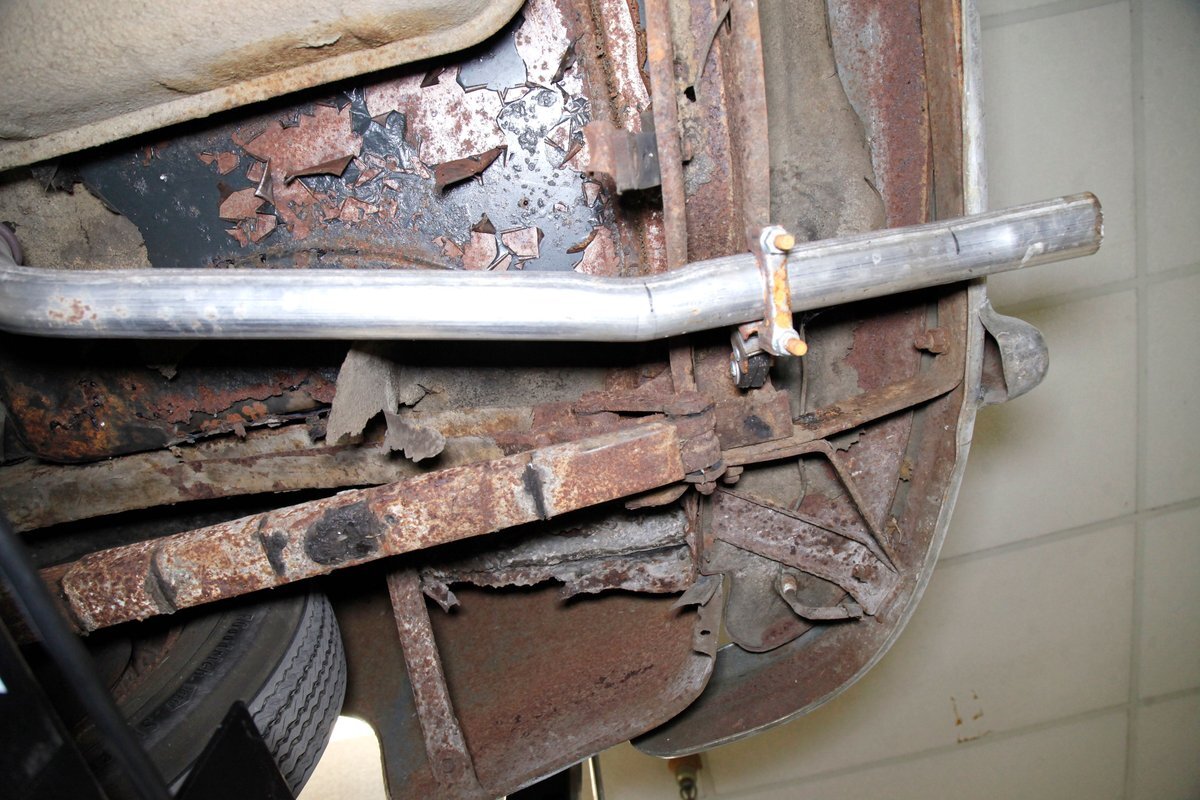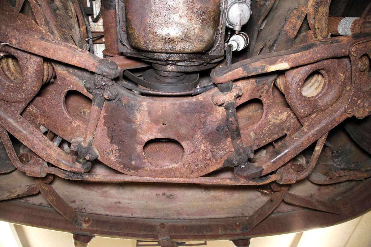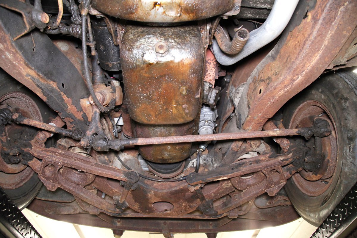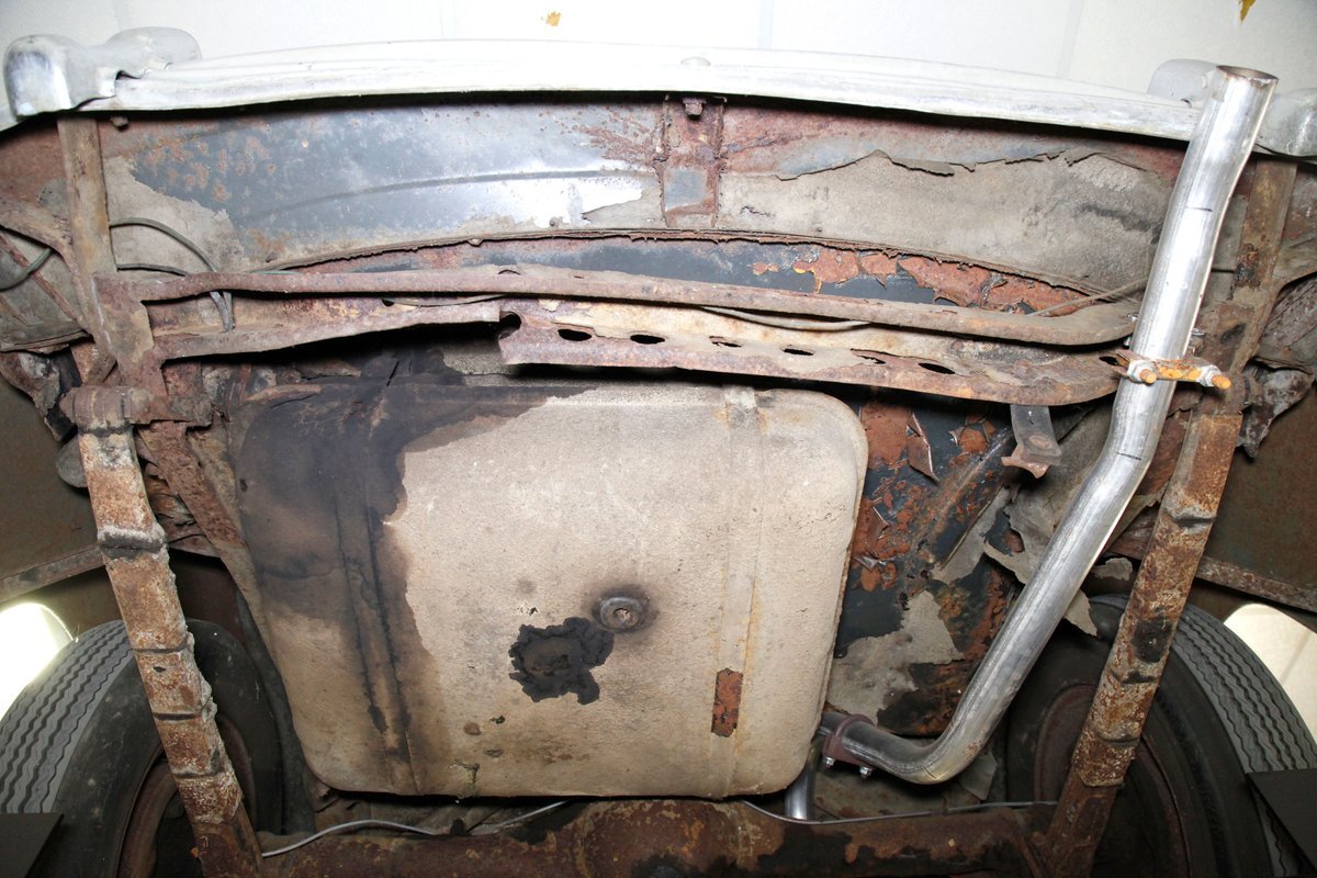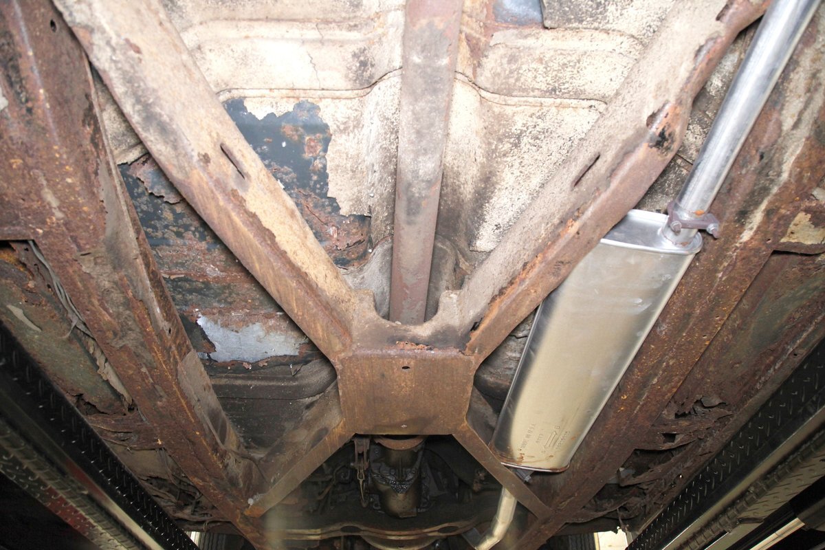 The X frame is riddled with patina and surface rust but remains solid structurally. Rockers and floor pans are stamped steel and show repair panels for the flooring. Independent coil spring front suspension and leaf spring rear is on, and drum brakes are seen all around. We note a new full single exhaust system has recently been installed.