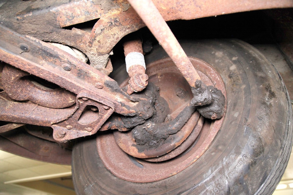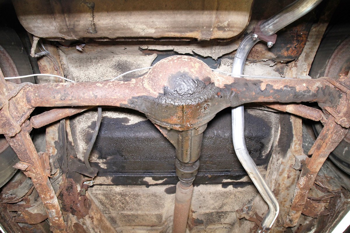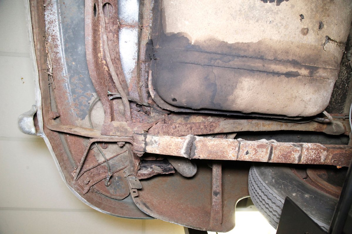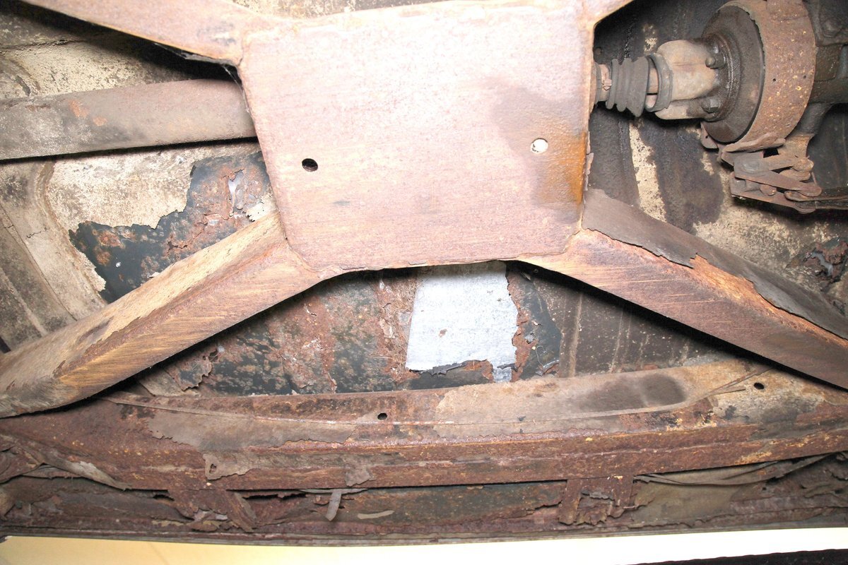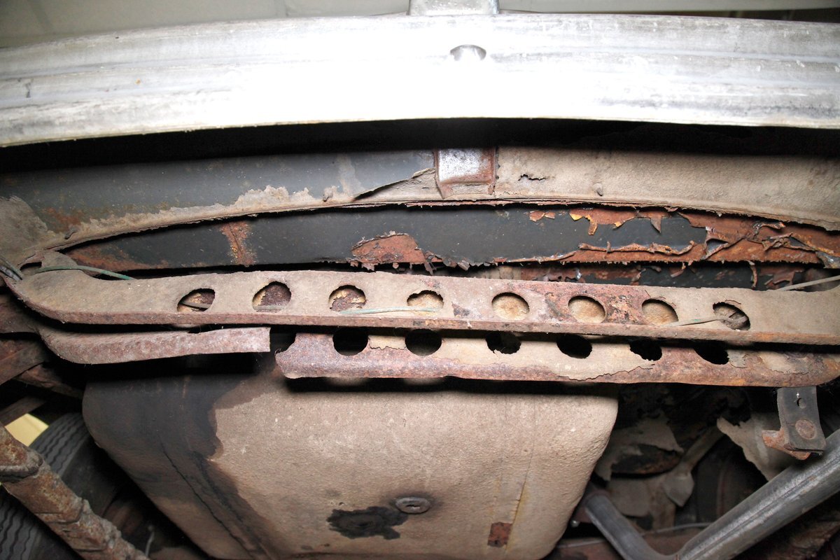 The X frame is riddled with patina and surface rust but remains solid structurally. Rockers and floor pans are stamped steel and show repair panels for the flooring. Independent coil spring front suspension and leaf spring rear is on, and drum brakes are seen all around. We note a new full single exhaust system has recently been installed.