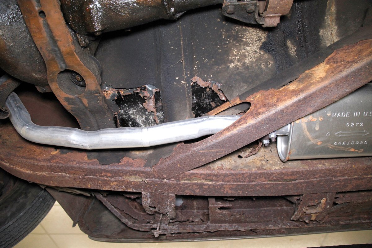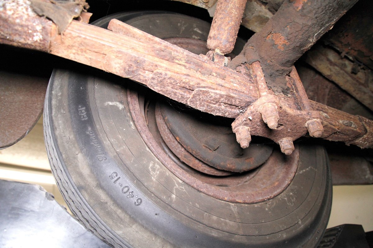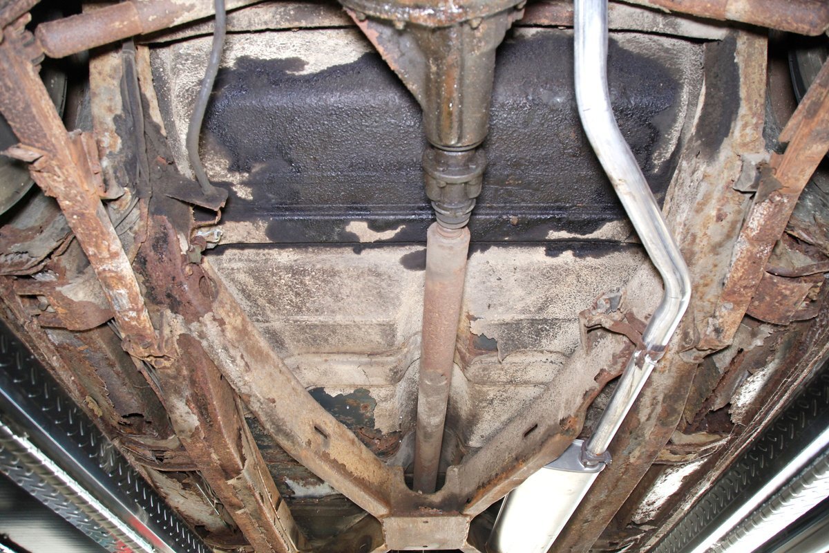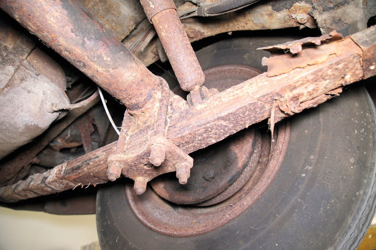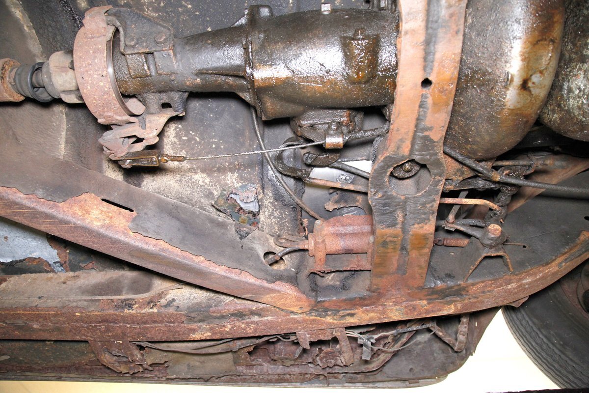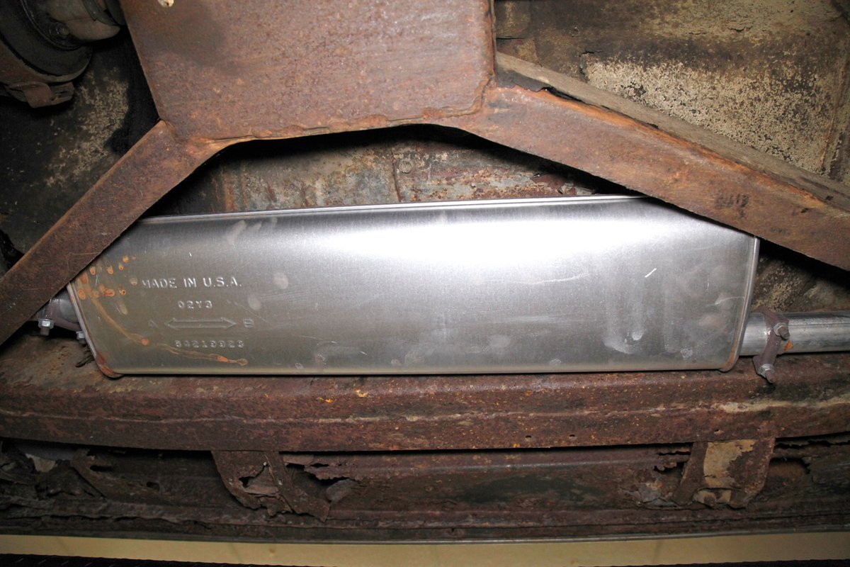 The X frame is riddled with patina and surface rust but remains solid structurally. Rockers and floor pans are stamped steel and show repair panels for the flooring. Independent coil spring front suspension and leaf spring rear is on, and drum brakes are seen all around. We note a new full single exhaust system has recently been installed.