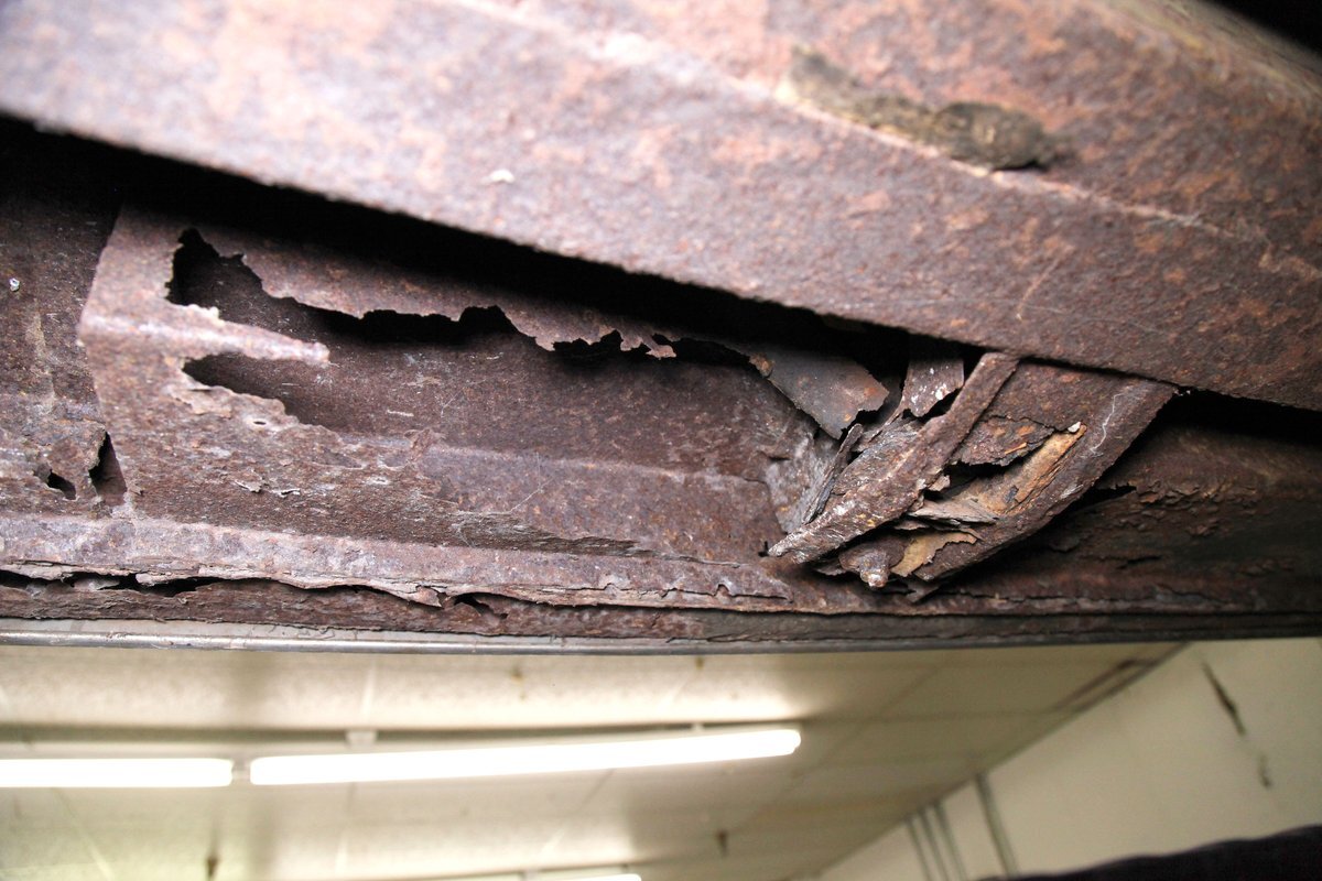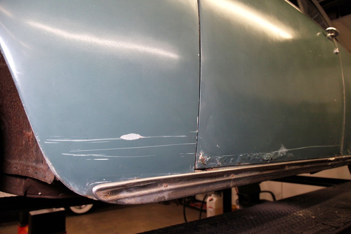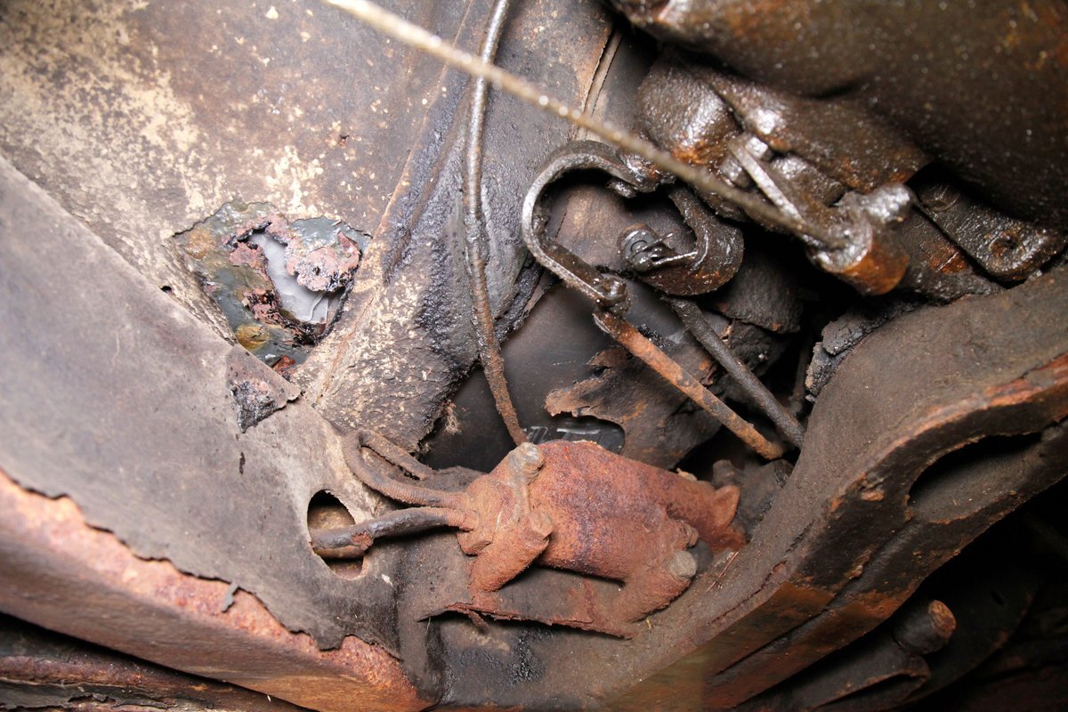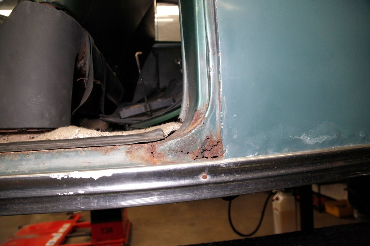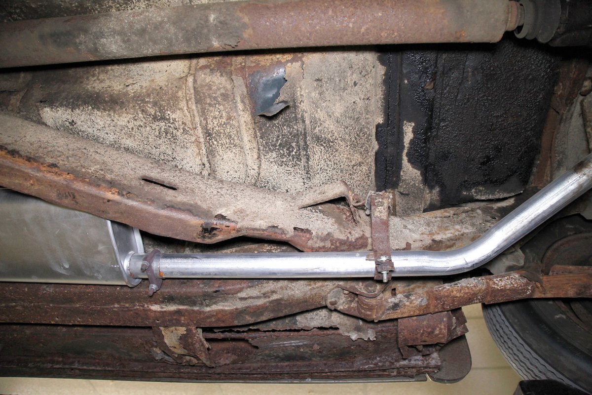 The X frame is riddled with patina and surface rust but remains solid structurally. Rockers and floor pans are stamped steel and show repair panels for the flooring. Independent coil spring front suspension and leaf spring rear is on, and drum brakes are seen all around. We note a new full single exhaust system has recently been installed.